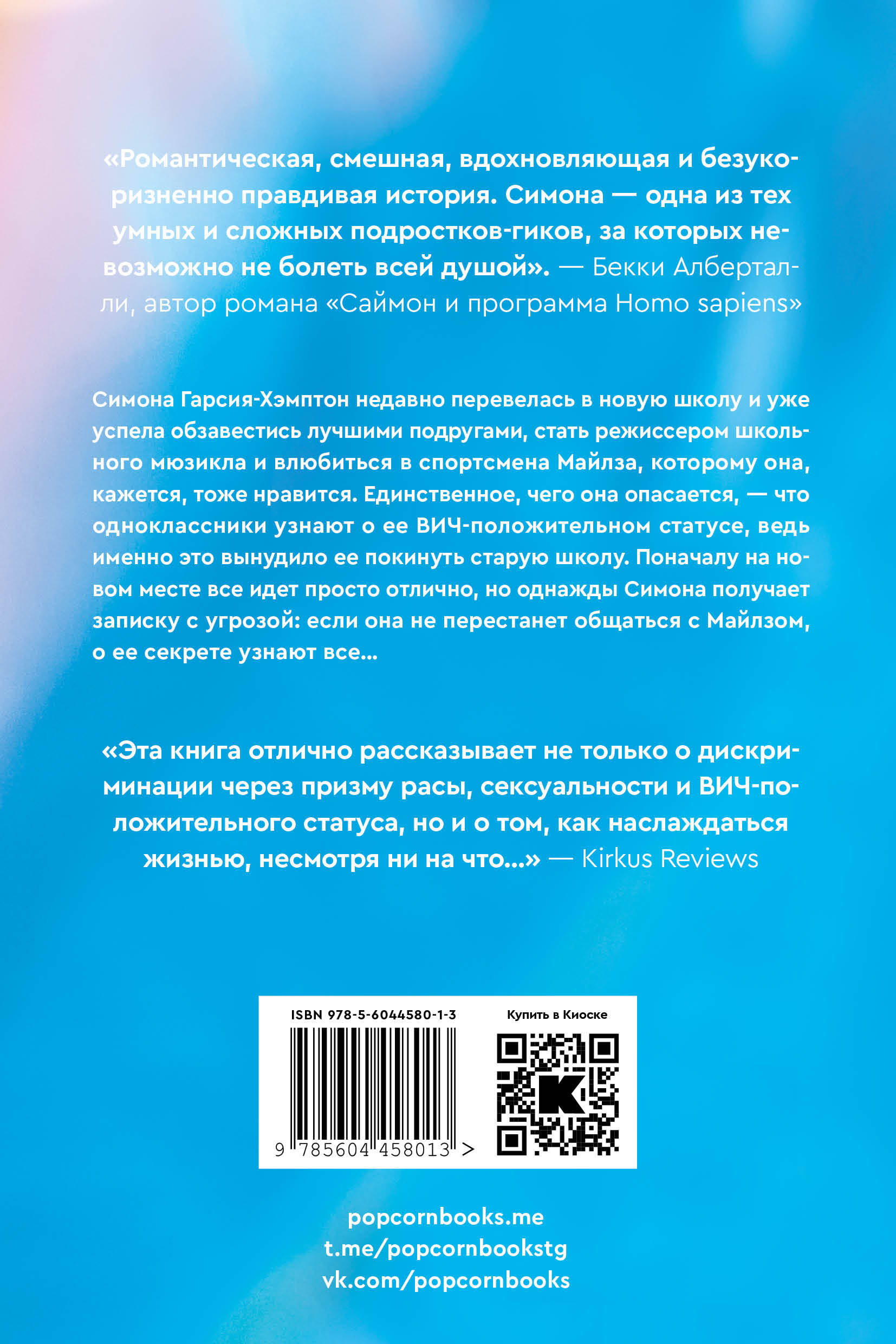 Симона Гарсия-Хэмптон недавно перевелась в новую школу и уже успела обзавестись лучшими подругами, стать режиссером школьного мюзикла и влюбиться в спортсмена Майлза, которому она, кажется, тоже нравится. Единственное, чего она опасается, - что одноклассники узнают о ее ВИЧ-положительном статусе, ведь именно это вынудило ее покинуть старую школу. Поначалу на новом месте все идет просто отлично, но однажды Симона получает записку с угрозой: если она не перестанет общаться с Майлзом, о ее секрете узнают все…| Издательство | ИНДИВИДУУМ ПРИНТ ООО |