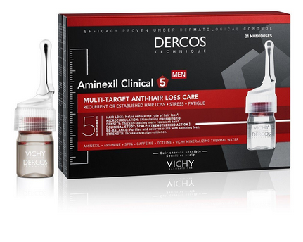 Aminexil Clinical 5 Hommes Anti-chute от Dercos Vichy - это средство против выпадения волос для мужчин. Его инновационная формула содержит такие ингредиенты, как комплекс SP94, октеин, аргинин, аминексил и реминерализующая вода Vichy, благодаря чему воздействует на все основные причины выпадения волос. Приятная и комфортная текстура быстро впитывается, не липнет, не течёт и не оставляет следов. Дерматологически протестировано, подходит даже для чувствительной кожи головы.