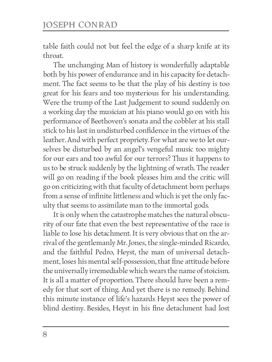 Axel Heyst, a dreamer and a restless drifter, believes he can avoid suffering by cutting himself off from others. Then he becomes involved in the operation of a coal company on a remote island in the Malay Archipelago, and when it fails he turns his back on humanity once more. But his life alters when he rescues a young English girl, Lena, from Zangiacomo's Ladies' Orchestra and the evil innkeeper Schomberg, taking her to his island retreat. The affair between Heyst and Lena begins with her release, but the relationship shifts as Lena struggles to save Heyst from the detachment and isolation that have inhibited and influenced his life.