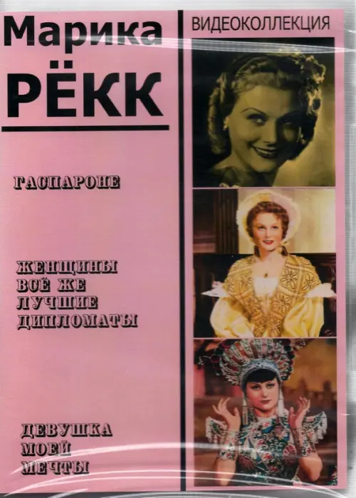 Видеоколлекция лучших фильмов великолепной актрисы, певицы, танцовщицы, звезды европейского музыкального кино и красавицы Марики Рёкк. Впервые - полные версии фильмов, без сокращений! ГАСПАРОНЕ (Gasparone) Музыкальная кинокомедия о весёлых приключениях разбойника Гаспароне. графини Шарлотты, влюбленных Зиндульфе и Ите. Всё вертится вокруг богатства графини, и, конечно же, всех ждет счастливый финал! Вокал и танец Марики Рёкк просто великолепны! Производство: Германия, "Universum Film", 1937 г. Продолжительность: 100 мин. Чёрно-белый. Режиссёр Г. Якоби. В ролях: Марина Рёкк, Йоханнес Хестерс, Л. Слезак. ЖЕНЩИНЫ ВСЕ ЖЕ ЛУЧШИЕ ДИПЛОМАТЫ (Frauen sind doch bessere Diplomaten) Цветная музыкальная кинокомедия о том, чего в XIX веке красивая и умная девушка, которая отлично поёт и танцует, может добиться от несгибаемого, непреклонно исполняющего долг (и очень привлекательного!) бравого офицера. Ему приказано закрыть казино её дядюшки, её задача - помешать ему. Но, возможно, их цели могут сблизиться. . . Производство: Германия, "Universum Film", 1941 г. Продолжительность: 90 мин. Цветной. Режиссер Г. Якоби. Композитор Ф. Гроте. В ролях: Марина Рёкк, В. Фрич, К. Гюнтер. ДЕВУШКА МОЕЙ МЕЧТЫ (Die Frau meiner Traume) Самый знаменитый цветной музыкальный фильм Марики Рёкк. Звезда мюзиклов Юлия Кестер бросает выступления в столичном театре и инкогнито уезжает в горы. Здесь она встречает двух горных инженеров и, - кто знает? Возможно, свою любовь? Производство: Германия, UFA, 1944 г. Продолжительность: 94 мин. Цветной. Режиссёр Г. Якоби. В ролях: Марина Рёкк, В. Лукши, В. Мюллер. Фильмы отреставрированы. Идеальное качество отображении и звука. Общая продолжительность: 282 мин. Формат: 4:3 Звук: 2.0 Регион: All Язык: русский, немецкий.