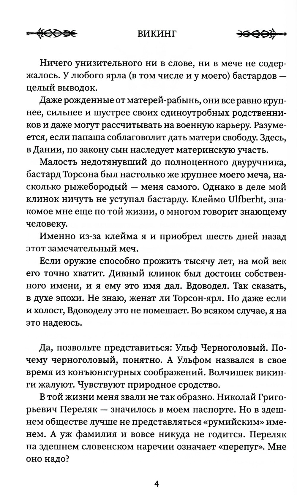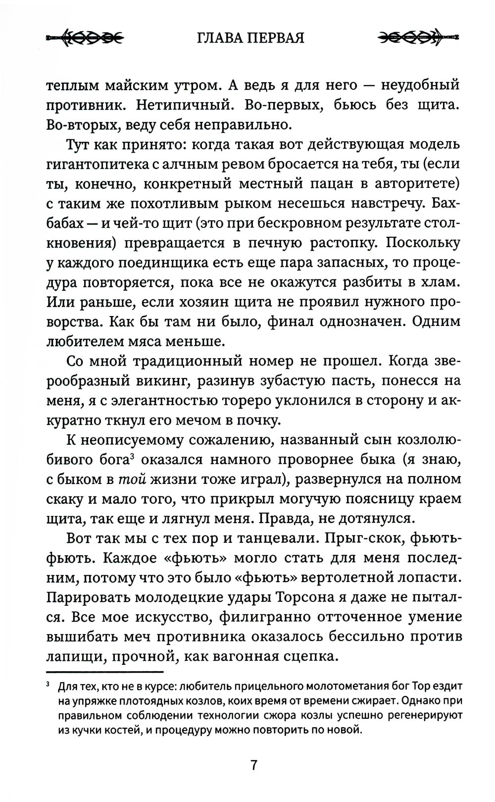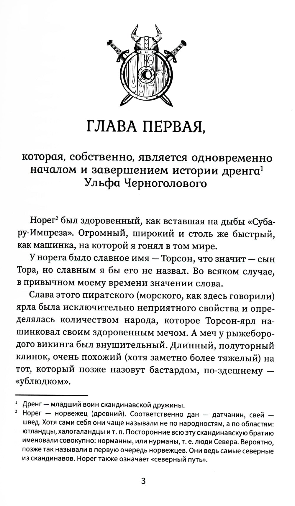 Николай Переляк - опытный спортсмен, отлично разбирается в холодном оружии. Но эти навыки и знания никак не востребованы в современном мире. Главный герой устал от жизни и однообразных ролевых игр, когда мужчины рубятся на мечах-муляжах. Отчаявшись, он идет в лес и посылает в небеса горячую мольбу... И Всевышний его услышал. Николай оказывается в мире жестоких, бесстрашных викингов. Вот где могут пригодиться его навыки боя на мечах. Он берет себе имя Ульф Черноголовый. Герой обретает верных друзей, но и враги вокруг не дремлют. И вот ему предстоит бой с непобедимым Торсоном, который многих воинов отправил в Валхаллу. Здесь уверенность Ульфа пошатнулась, но он ни о чем не жалеет. Удастся ли герою выжить в смертельном поединке?| Издательство | Феникс |