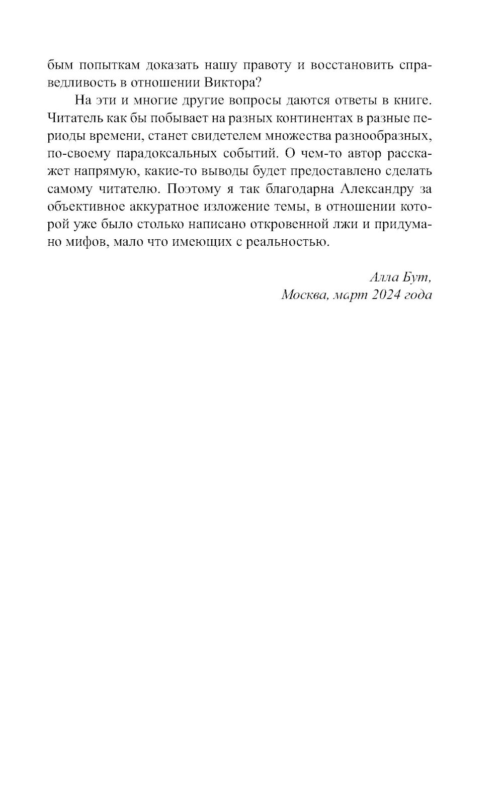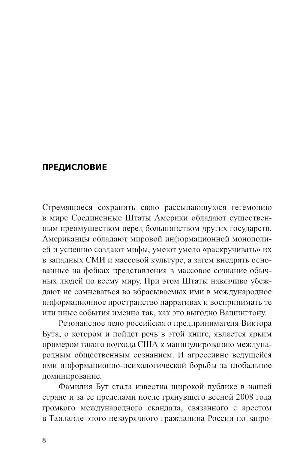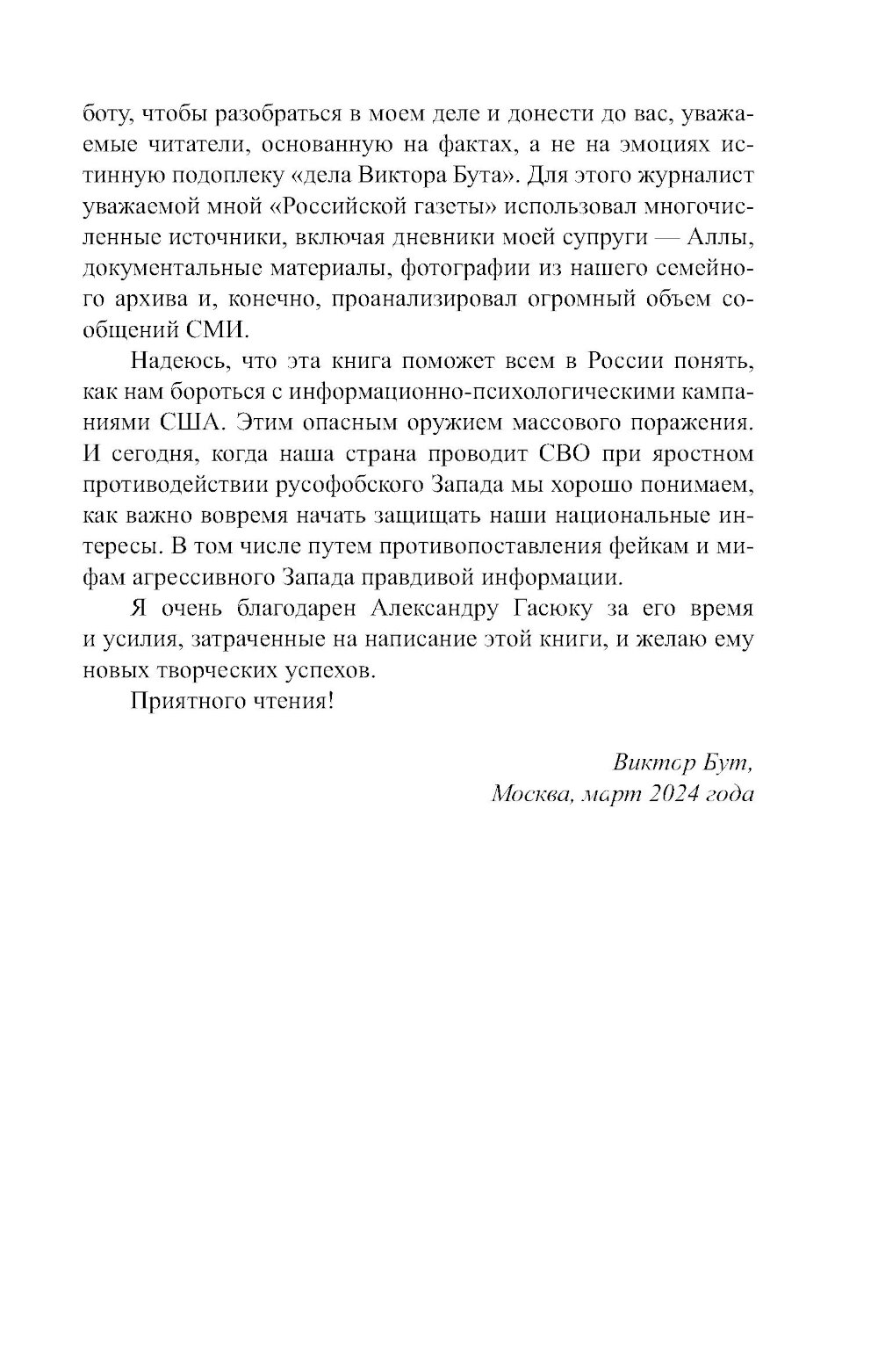 Для Соединенных Штатов Америки он - опаснейший контрабандист оружия, история которого легла в основу снятого в 2005 году фильма «Оружейный барон» с Николасом Кейджем в главной роли. Для России он - гражданин-мученик, осужденный, отчасти благодаря голливудскому фильму и продолжительной клеветнической кампании в западных СМИ. Но кто такой Виктор Бут на самом деле и чем он занимается? После распада Советского Союза Бут начал успешный бизнес в качестве брокера по авиаперевозкам и грузовым операциям. В 2003 году он рассказал репортеру The New York Times, что стал свидетелем того, как «пожертвования Запада бедным странам, часто в форме современной промышленности, приводят к разрушению социального и экологического баланса, взаимному недовольству и в конечном итоге войне». Эти слова ему не понравились. В 2008 году Бут был арестован в Таиланде в результате спецоперации, организованной американскими спецагентами DEA. Гражданина России привлекли к ответственности за то, что он якобы пытался продать крупную партию оружия представителям Революционных вооруженных сил Колумбии, которые на самом деле были тайными информаторами, работавшими на США. В 2012 году Бут, которому первоначально грозило пожизненное заключение по обвинению в сговоре с целью убийства американцев, в конечном итоге был приговорен к 25 годам тюремного заключения в США. Россия назвала приговор «необоснованным и предвзятым». В 2022 году он был обменян на Бриттни Грайнер, американскую баскетболистку, отбывавшую срок в России. В книге международного корреспондента «Российской газеты» Александра Гасюка описывается так называемое «дело Бута», через призму недавно обнаруженных документов и мемуаров, в том числе самого господина Бута, его жены Аллы и ряда других людей, прямо или косвенно вовлеченных в эту интригующую трансграничную историю.| Издательство | Молодая гвардия |
