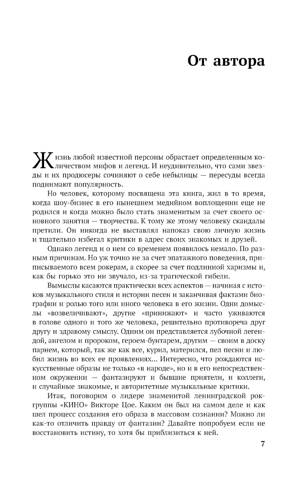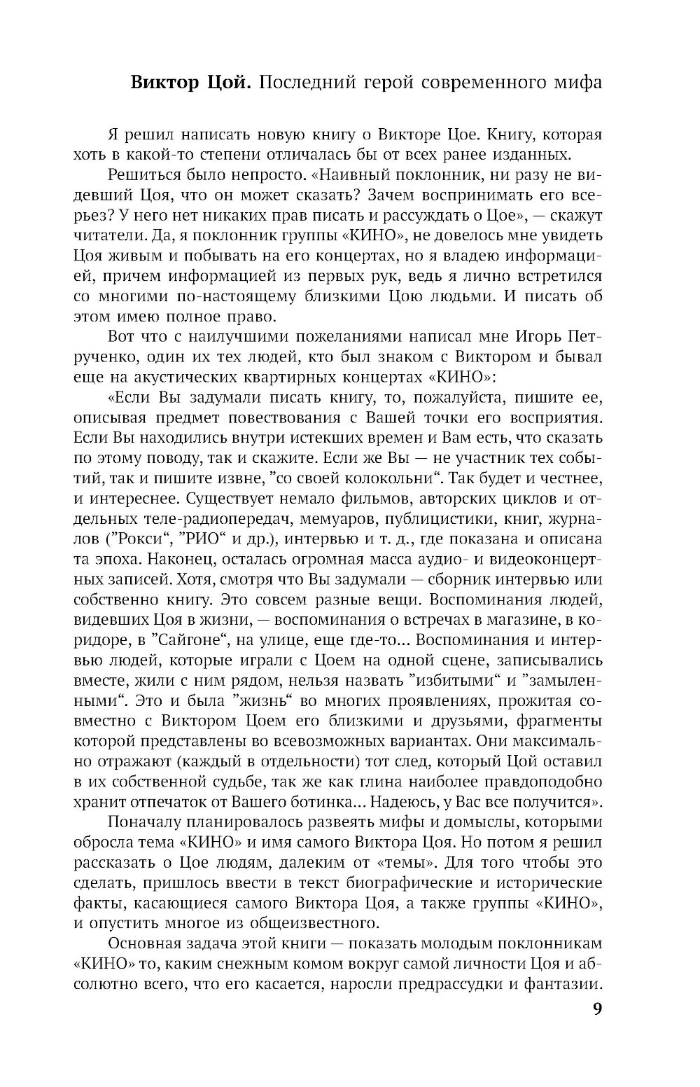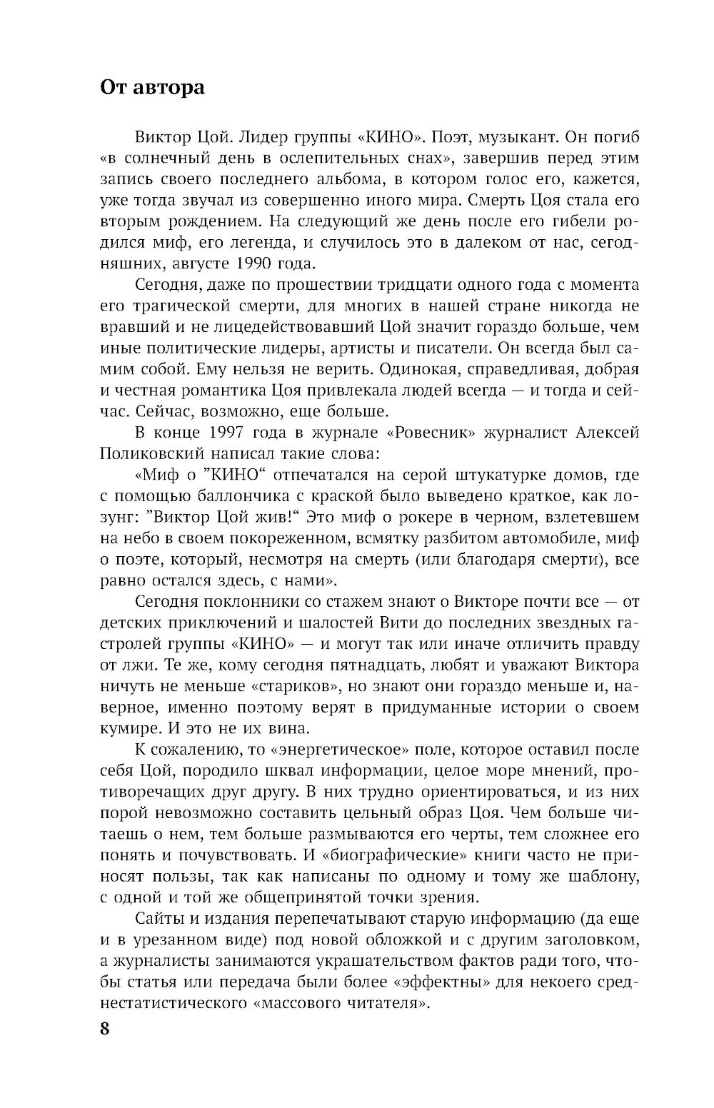 Виктор Цой - одна из самых известных и ключевых фигур отечественной рок-музыки, фронтмен знаменитой ленинградской рок-группы «КИНО». С момента трагической гибели музыканта прошло более 30 лет, но его музыка и тексты по-прежнему не оставляют равнодушными людей совсем разных поколений. Каким он был на самом деле? Как рождалась легенда? Можно ли отличить правду от фантазии? Давайте попробуем если не восстановить истину, то хотя бы приблизиться к ней... Автор книги попытался рассказать о невымышленном Викторе Цое, попробовал детально восстановить факты его биографии и творческой жизни. В книгу вошли откровенные свидетельства родных, близких, друзей, музыкантов - коллег Цоя, а также уникальные материалы - рассказы очевидцев, фотографии, письма, документы из личных архивов. Текст публикуется в новой редакции с дополнениями.