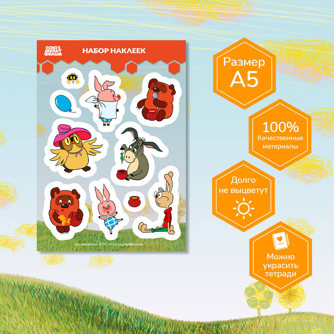 Хорошо живет на свете Винни Пух, потому что с ним сделали яркий набор наклеек. Компанию ему составят звезды золотой коллекции Союзмультфильма: верный друг Пятачок, ослик Иа, Сова и Кролик. Внимание! Наклейки вызывают ностальгию. Рекомендуем дарить детям и взрослым всех возрастов. Размер А5 (148х210 мм). Стикерпак изготовлен из качественных материалов, благодаря чему наклейки долго не выцветут и не потеряют товарный вид. Самоклеящаяся пленка не рвется, а наклейки легко отделяются от фона.
