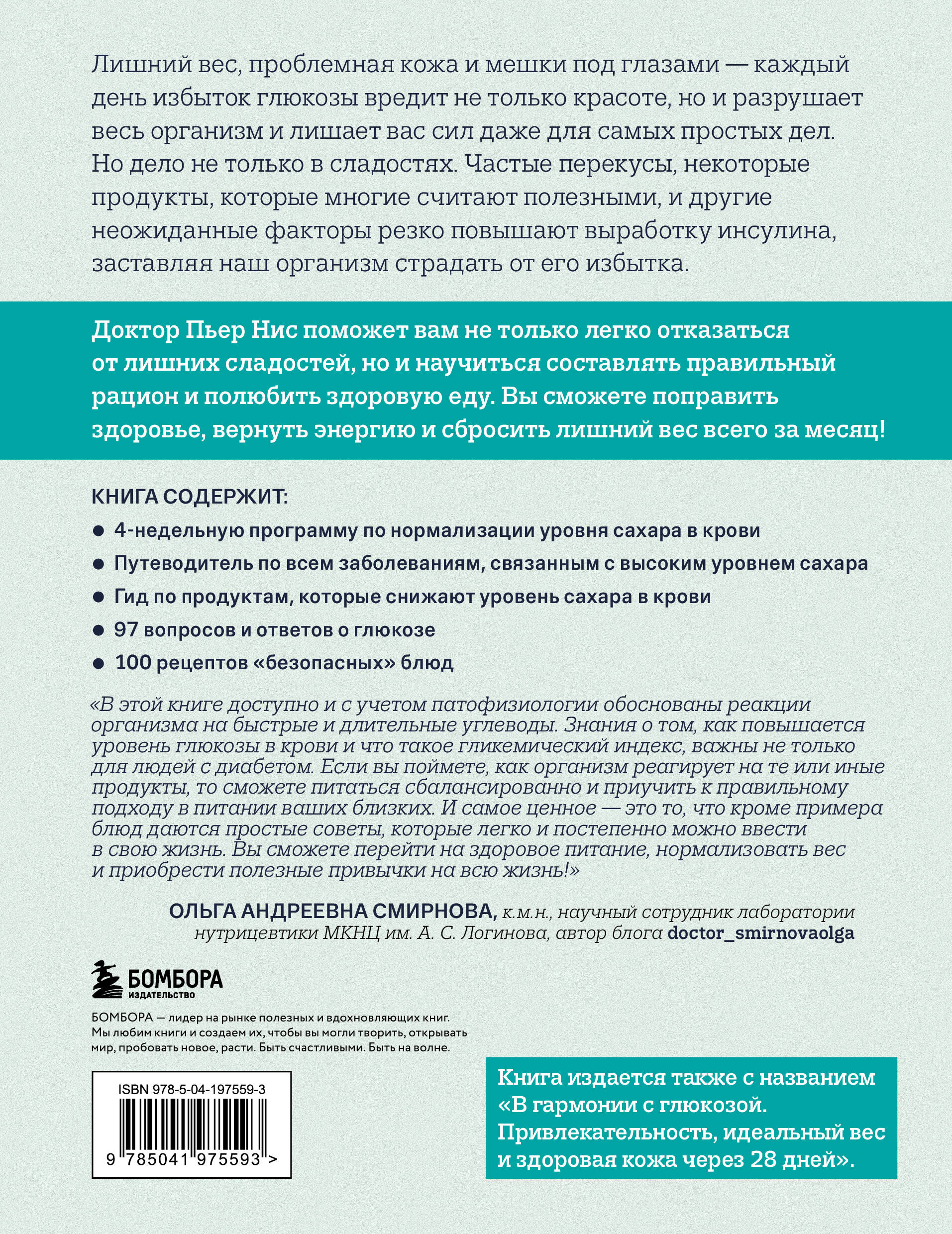 Постоянная усталость, лишний вес, нарушения сна и перепады настроения - это лишь малая часть проблем, которые возникают из-за избытка сахара в вашем организме. Доктор Пьер Нис, эндокринолог-диетолог, расскажет, как нормализовать уровень сахара в вашем организме, и объяснит, какие продукты разрушают тело, пагубно влияют на психику и приводят к полноте. Вы научитесь выбирать более здоровые продукты и включать их в привычный рацион, а также избавитесь от лишнего веса за 4 недели! Вам точно нужна эта книга, если вы нашли у себя хотя бы два симптома из этого списка: 1. Плохой сон. 2. Приступы внезапного голода. 3. Тяжело управлять эмоциями. 4. Сложно сосредоточиться. 5. Часто нет мотивации и сил. 6. Трудно сбросить вес, а диеты не помогают. 7. Рассеянность и забывчивость. 8. Постоянная усталость. 9. Зацикленность на еде. 10. Мешки под глазами или отеки на лице. «В этой книге доступно и с учетом патофизиологии обоснованы реакции организма на быстрые и длительные углеводы. Знания о том, как повышается уровень глюкозы в крови и что такое гликемический индекс, важны не только для людей с диабетом. Если вы поймете, как организм реагирует на те или иные продукты, то сможете питаться сбалансированно и приучить к правильному подходу в питании ваших близких. И самое ценное - это то, что кроме примера блюд даются простые советы, которые легко и постепенно можно ввести в свою жизнь. Вы сможете перейти на здоровое питание, нормализовать вес и приобрести полезные привычки на всю жизнь!» - ОЛЬГА АНДРЕЕВНА СМИРНОВА, к.м.н., научный сотрудник лаборатории нутрицевтики МКНЦ им. А.С. Логинова, автор блога doctor_smirnovaolga| Издательство | ООО "Издательство "Эксмо" |