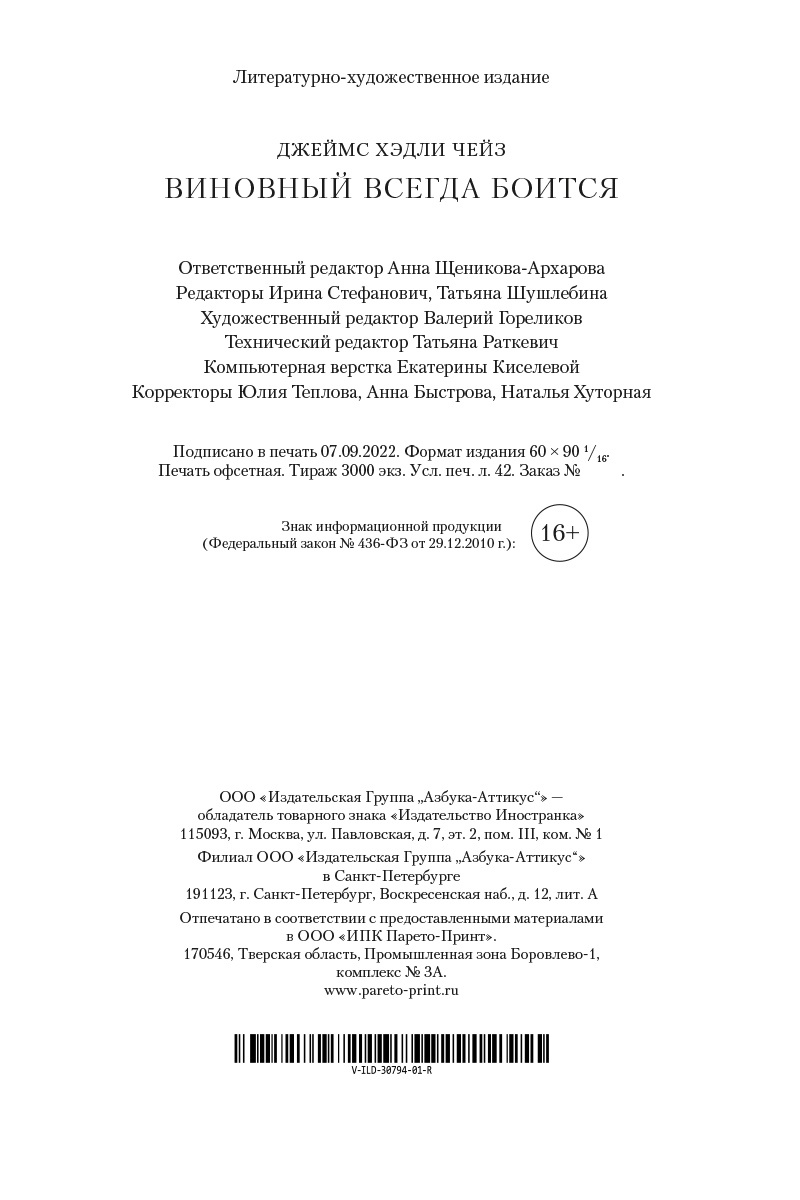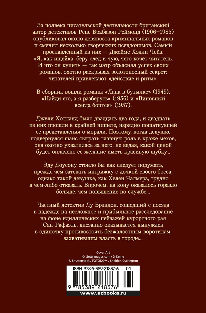 За полвека писательской деятельности британский автор детективов Рене Брабазон Реймонд (1906-1985) опубликовал около девяноста криминальных романов и сменил несколько творческих псевдонимов. Самый прославленный из них - Джеймс Хэдли Чейз. «Я, как ищейка, беру след и чую, чего хочет читатель. И что он купит» - так мэтр объяснял успех своих романов, охотно раскрывая золотоносный секрет: читателей привлекают «действие и ритм». В сборник вошли романы «Лапа в бутылке» (1949), «Найди его, а я разберусь» (1956), «Виновный всегда боится» (1957). Джули Холланд было двадцать два года, и двадцать из них прошли в крайней нищете, изрядно пошатнувшей ее представления о морали. Поэтому, когда девушке подвернулся шанс сыграть главную роль в краже мехов, она охотно ухватилась за него, не ведая, какой ценой будет оплачено ее желание иметь красивую шубку... Эду Доусону стоило бы как следует подумать, прежде чем затевать интрижку с дочкой своего босса, однако такой девушке, как Хелен Чалмерз, трудно в чем-либо отказать. Впрочем, на кону оказалось гораздо больше, чем повышение по службе... Частный детектив Лу Брэндон, сошедший с поезда в надежде на несложное и прибыльное расследование на фоне идиллических пейзажей курортного рая Сан-Рафаэль, внезапно оказывается вынужден в одиночку противостоять безжалостным воротилам, захватившим власть в городе...