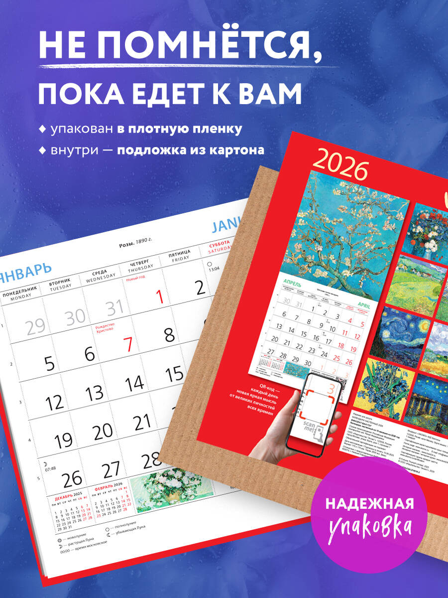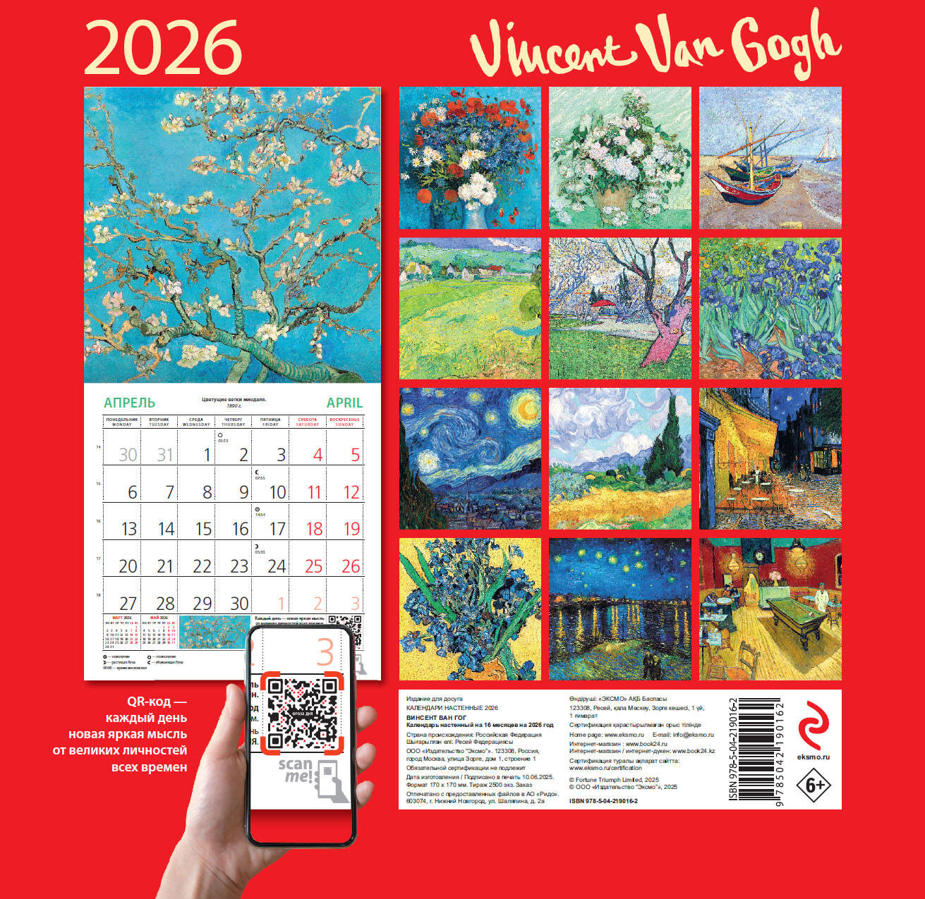 О серии: Наши настенные календари отличаются высоким качеством исполнения! Тщательно подобранные иллюстрации, напечатанные на глянцевой бумаге высочайшего качества, станут настоящим украшением дома, а в календарной сетке найдется место для ваших планов: большие клетки позволят делать записи и организовать свой год! В календаре также отмечены все государственные праздники. В серии настенных календарей издательства «ЭКСМО» каждый найдет тему по вкусу: великие художники, великолепные подборки с самыми знаменитыми произведениями искусства, легендарные кинематографические саги и игры, главные книжные авторы и бестселлеры, фотографии и иллюстрации любимых животных и многое-многое другое! О календаре: Практичный и эстетичный, этот календарь каждый месяц будет радовать вас. Прекрасные картины органично дополнят любой интерьер и помогут планировать время. В этом календаре представлены шедевры кисти Винсента Ван Гога. Для кого: Высокое качество полиграфического исполнения прекрасно дополняет репродукции шедевров живописи, что непременно будет по достоинству оценено людьми с хорошим вкусом. Технические параметры: - Тип календаря - настенный перекидной. - Год - 2026. - Календарная сетка - с разбивкой по месяцам. - Вид скрепления - скрепка. - Ширина - 17 см. - Высота - 17 см. - Внутренний блок - мелованная бумага 130 г/м2. - Подложка - плотный гофрокартон для поддержания формы. - Индивидуальная упаковка в плотный целлофановый пакет.| Издательство | ООО "Издательство "Эксмо" |