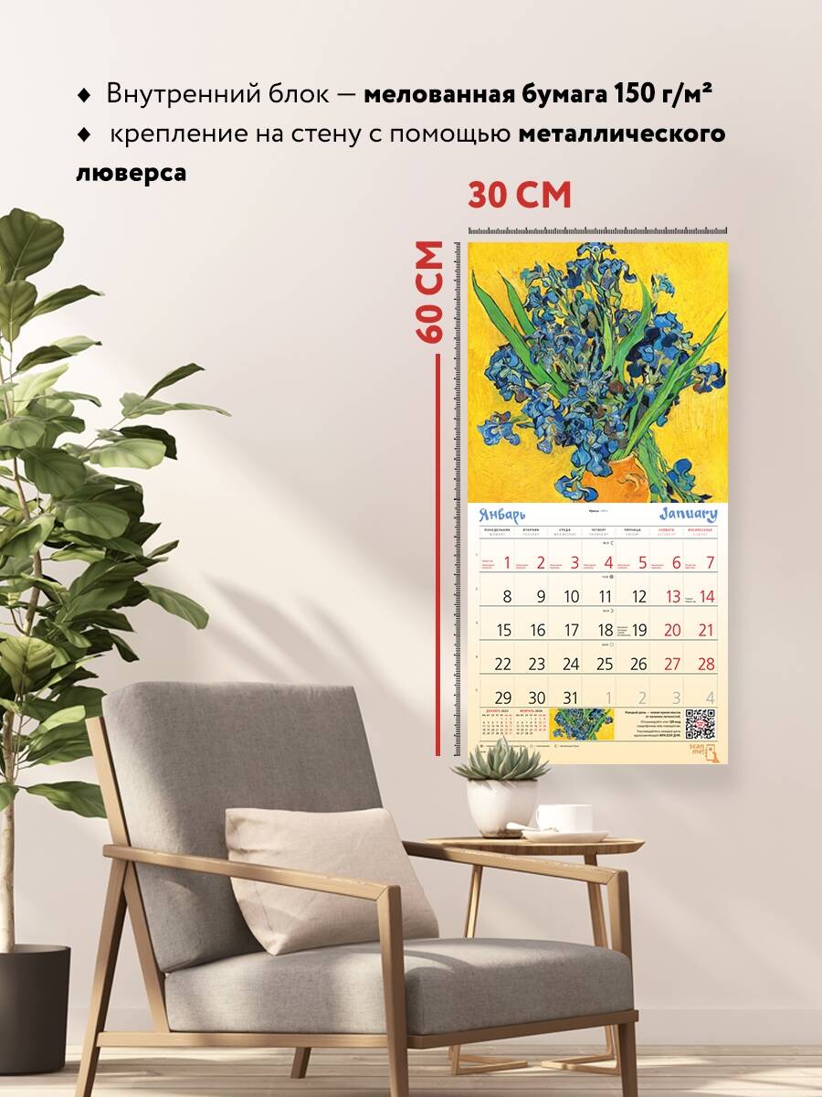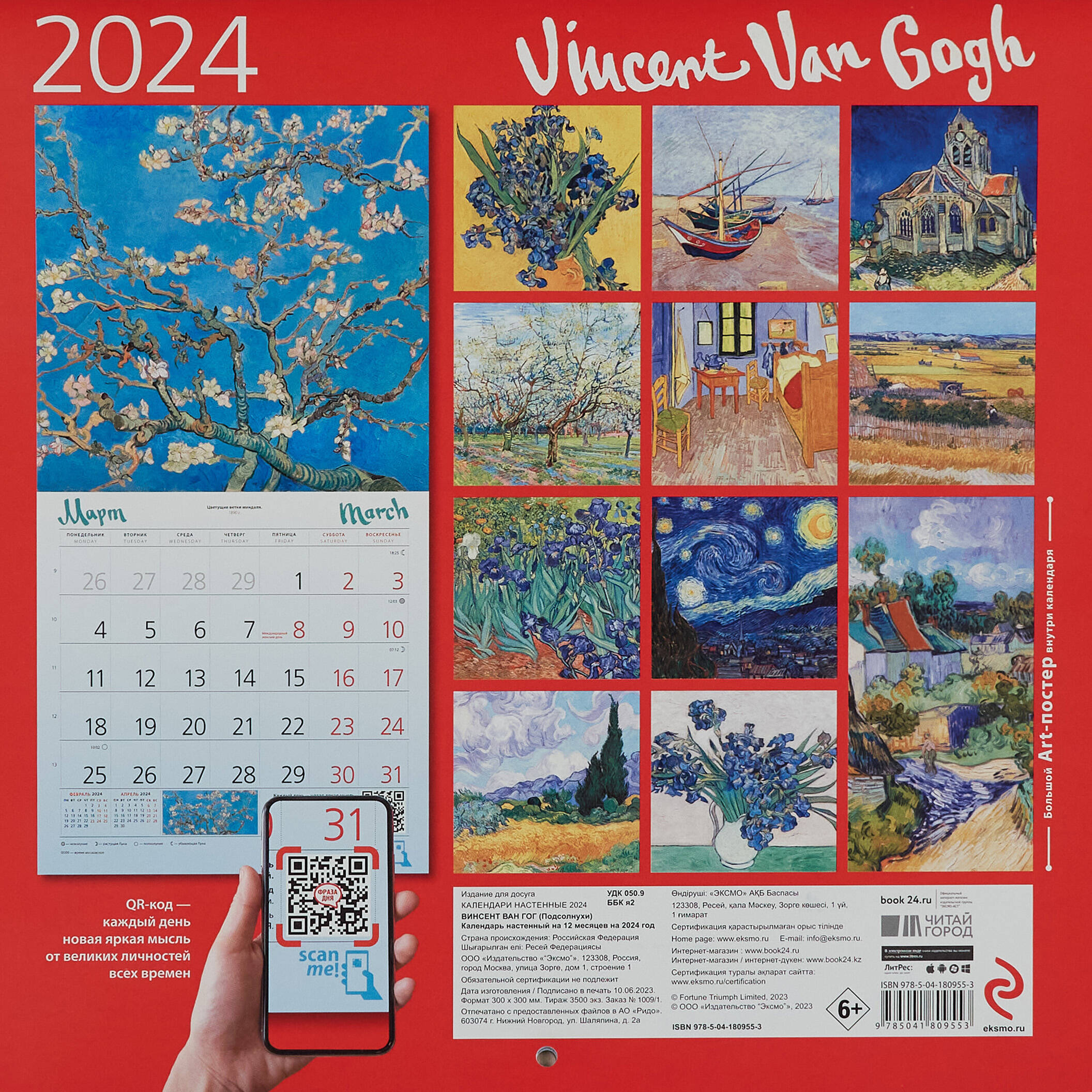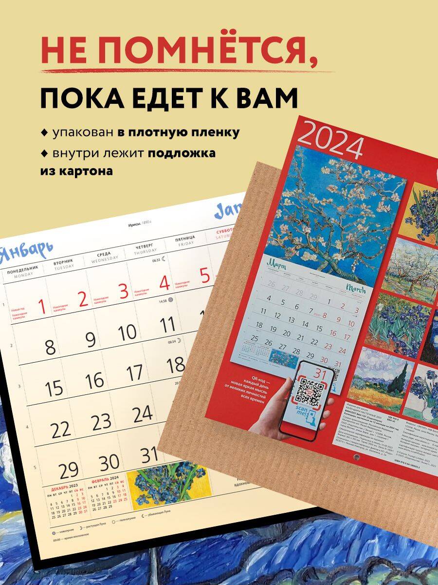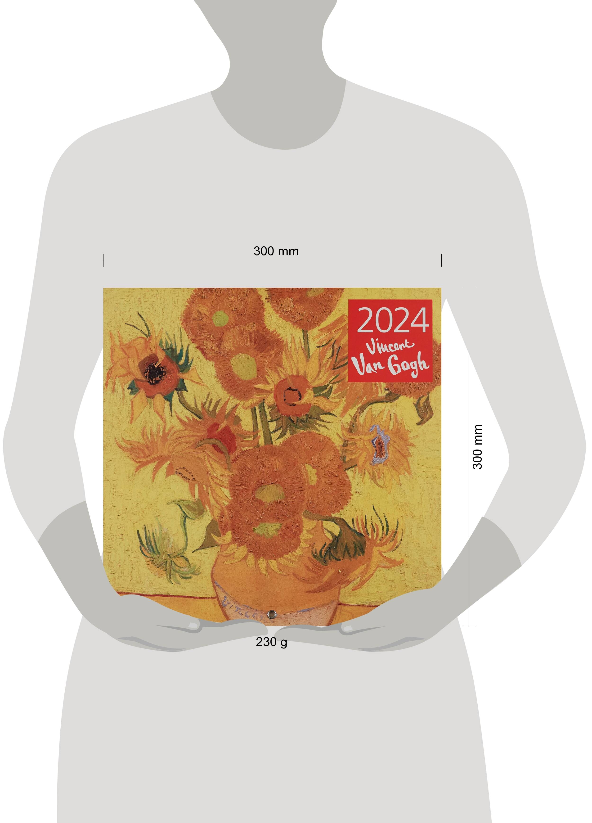 О серии: Наши настенные календари отличаются высоким качеством исполнения! Тщательно подобранные иллюстрации, напечатанные на глянцевой бумаге высочайшего качества, станут настоящим украшением дома, а в календарной сетке найдется место для ваших планов: большие клетки позволят делать записи и организовать свой год! В календаре также отмечены государственные праздники. В серии настенных календарей издательства «ЭКСМО» каждый найдет тему по вкусу: великие художники, великолепные подборки с самыми знаменитыми произведениями искусства, герои всеми любимых мультфильмов. О календаре: Практичный и эстетичный, этот календарь каждый месяц будет радовать вас изображением нового шедевра. Прекрасные картины органично дополнят любой интерьер и помогут планировать время. В этом календаре представлены шедевры кисти Винсента Ван Гога. Для кого: Высокое качество полиграфического исполнения прекрасно дополняет репродукции шедевров живописи, что непременно будет по достоинству оценено людьми с хорошим вкусом. Технические параметры: - Тип календаря - настенный перекидной. - Год - 2024. - Календарная сетка - с разбивкой по месяцам. - Вид скрепления - скрепка. - Ширина - 17 см. - Высота - 17 см. - Внутренний блок - мелованная бумага 150 г/м2. - Подложка - плотный гофрокартон для поддержания формы. - Индивидуальная упаковка в плотный целлофановый пакет.| Издательство | ООО "Издательство "Эксмо" |