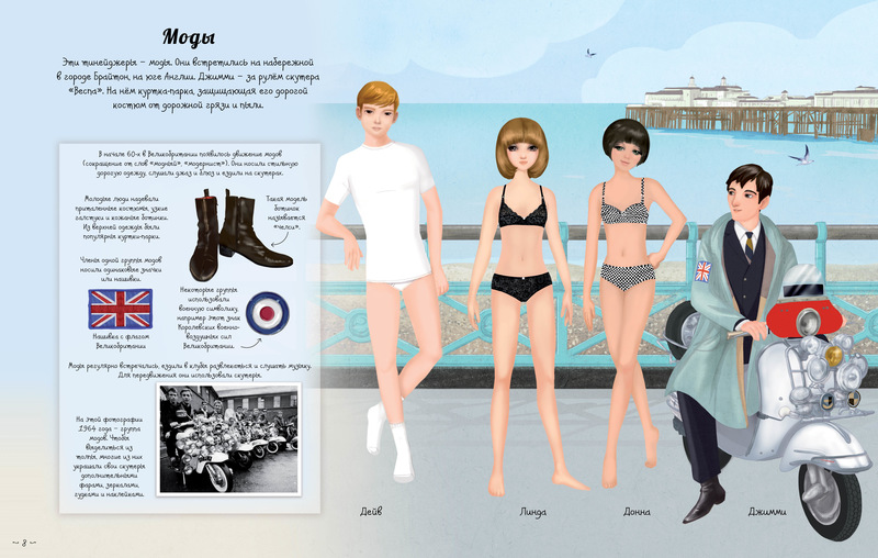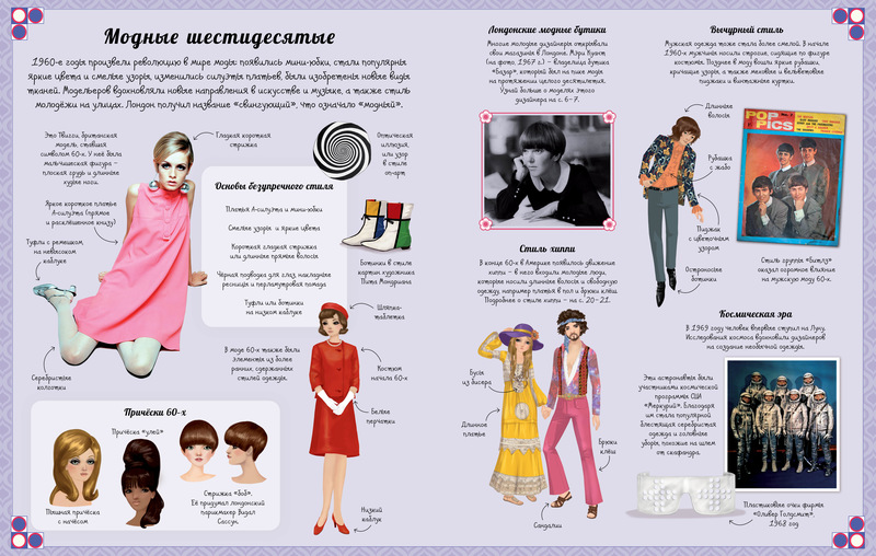 Какие наряды были модными в 60-е годы ХХ века? Мини-юбки, длинные платья в стиле хиппи или яркие рубашки с узорами? Открой эту книжку и узнай! С помощью наклеек создавай модные образы для моделей, а также придумывай свои собственные наряды!
