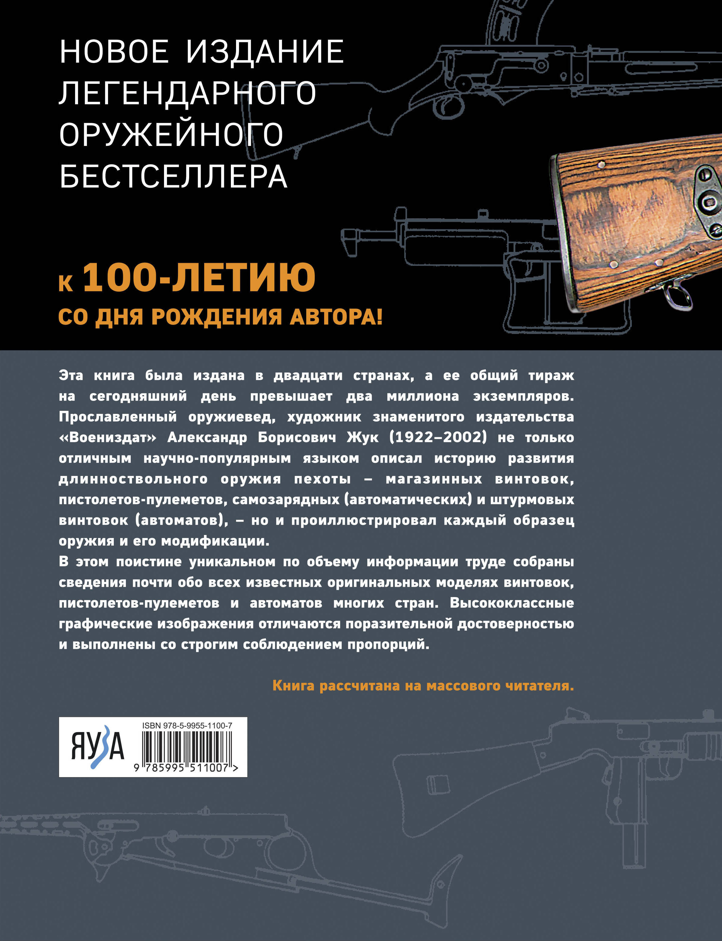 НОВОЕ ИЗДАНИЕ ЛЕГЕНДАРНОГО ОРУЖЕЙНОГО БЕСТСЕЛЛЕРА К 100-ЛЕТИЮ СО ДНЯ РОЖДЕНИЯ АВТОРА! Эта книга была издана в двадцати странах, а ее общий тираж на сегодняшний день превышает два миллиона экземпляров. Прославленный оружиевед, художник знаменитого издательства «Воениздат» Александр Борисович Жук (1922-2002) не только отличным научно-популярным языком описал историю развития длинноствольного оружия пехоты - магазинных винтовок, пистолетов-пулеметов, самозарядных (автоматических) и штурмовых винтовок (автоматов), но и проиллюстрировал каждый образец оружия и его и модификации. В этом поистине уникальном по объему информации труде собраны сведения почти о всех известных оригинальных моделях винтовок, пистолетов-пулеметов и автоматов многих стран. Высококлассные графические изображения отличаются поразительной достоверностью и выполнены в строгом соблюдении пропорций. Книга рассчитана на массового читателя.| Издательство | Яуза-пресс ООО |
