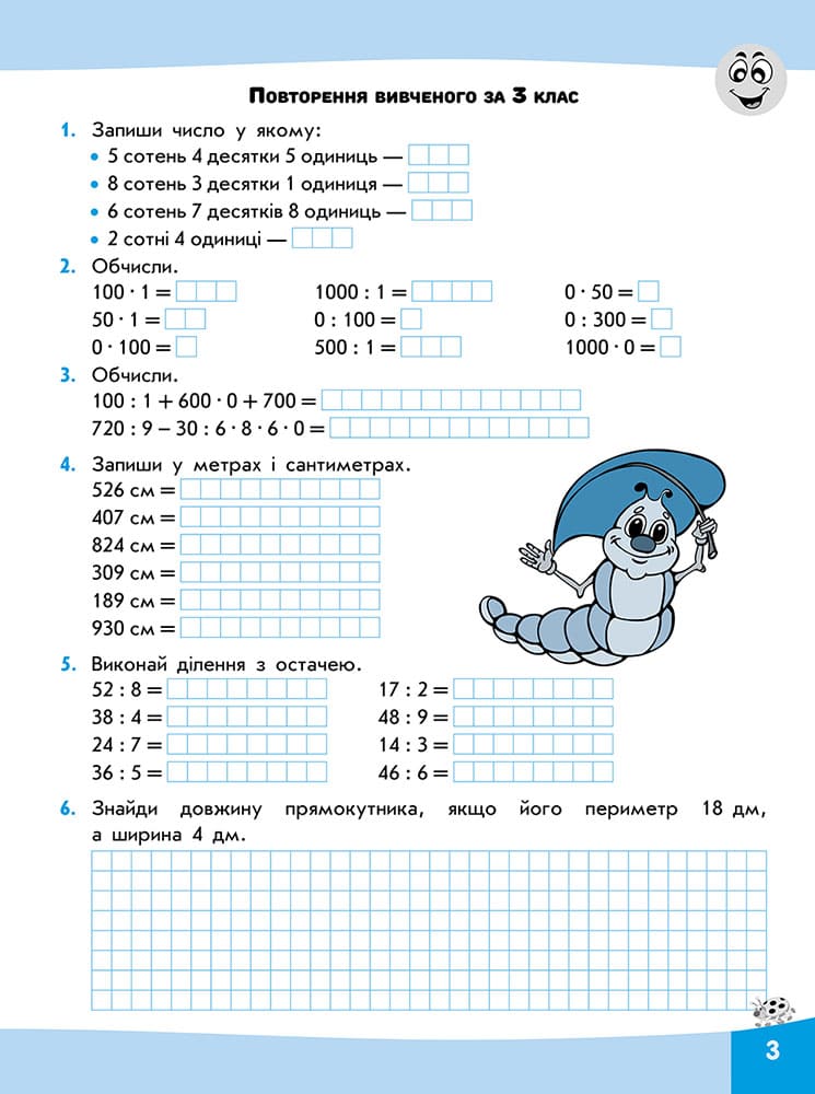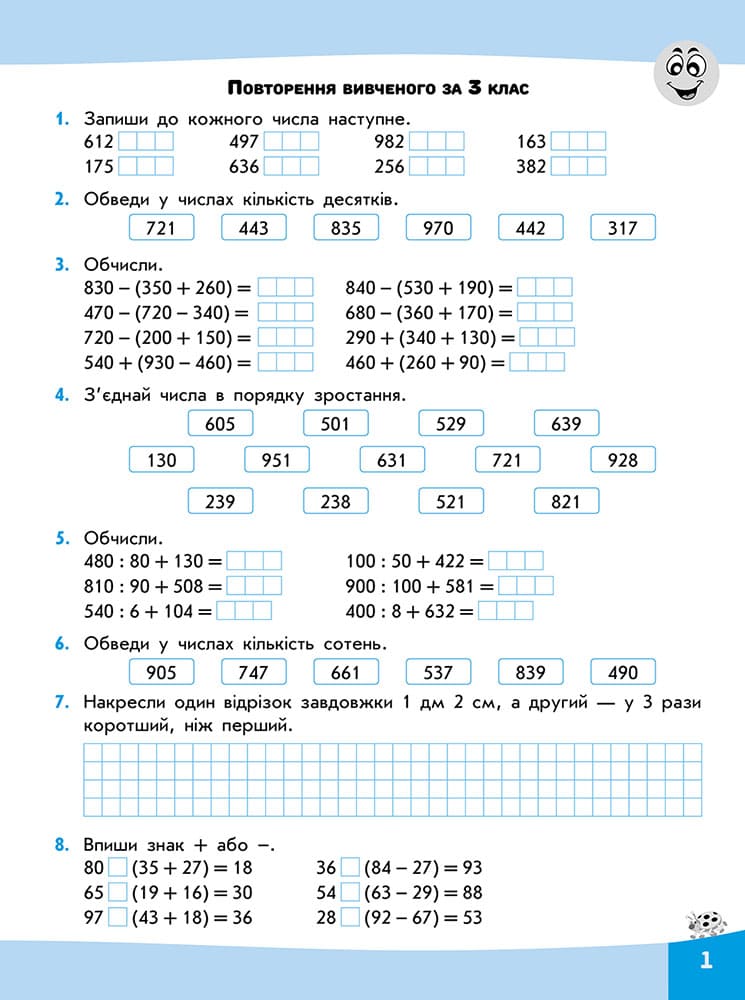 ВІДПОВІДАЄ КОНЦЕПЦІЇ НОВОЇ УКРАЇНСЬКОЇ ШКОЛИ. Посібник має чітку та оригінальну структуру. Завдання зошита відповідає державним вимогам рівня загальноосвітньої підготовки учнів і допомагають розвинути навички: обчислення виразів різних видів; обґрунтування дій, за допомогою яких обчислюється вираз; логічного мислення. Приємним доповненням до завдань стануть яскраві наліпки. Чому варто придбати Посібник допоможе молодшому школяру навчитися обчислювати вирази різних типів, виконувати математичні дії, логічно міркувати. Зошит можна використовувати у поєднанні з будь-яким підручником із математики як основний або додатковий дидактичний матеріал для роботи на уроках та вдома.| ISBN | 978-617-7385-95-9 |