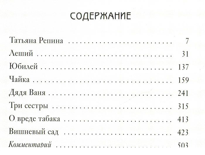 В настоящий том вошли пьесы: "Татьяна Репина", "Леший", "Юбилей", "Чайка", "Дядя Ваня", "Три сестры", "О вреде табака", "Вишневый сад".