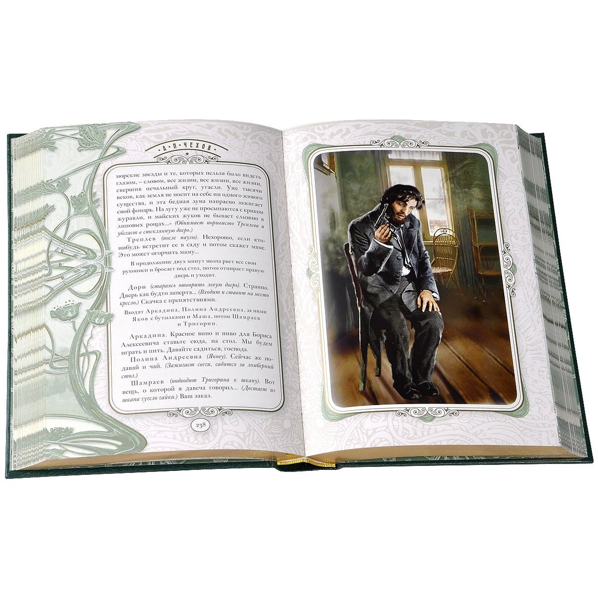 Строгий, классический переплет с тиснением золотой и серебряной фольгой украшает рисунок в виде медальона с монограммой автора. Трехсторонний золотой обрез с блинтовым тиснением. В фоторамку в стиле модерн, обрамляющую страницы издания, органично вписаны фотографии, создающие живые образы персонажей Чехова. Всем любителям творчества А.П. Чехова адресовано собрание сочинений популярнейшего автора в лучшем в истории полиграфическом исполнении. Данное собрание сочинений будет включать в себя всю художественную прозу (рассказы, повести, юморески, очерки, литературные пародии), а также драматические произведения.