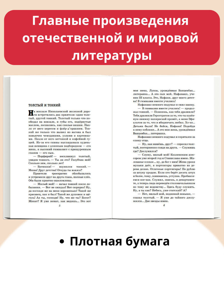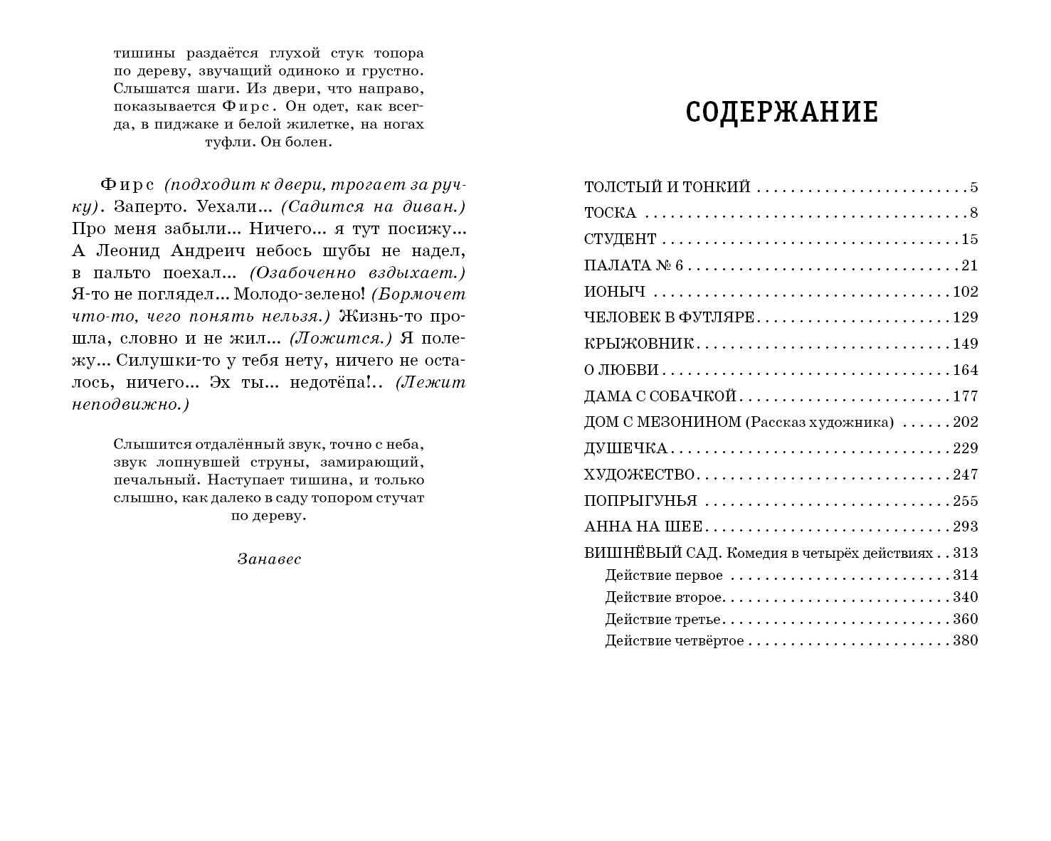 В сборник вошло 14 известных рассказов А.П. Чехова, а также пьеса «Вишнёвый сад». «Толстый и тонкий», «Палата № 6», «Человек в футляре» - эти и многие другие рассказы принесли мировую известность великому русскому писателю. Таких разных, его персонажей объединяют чувства тоски, неудовлетворённости, одиночества. Их внутренние душевные переживания обычно намного ярче, чем скучная, повседневная действительность, которая окружает героев. В серии «Детская библиотека» представлены лучшие произведения отечественной и мировой литературы для детей от 5 до 16 лет. Это фольклор и литературные сказки, стихи, рассказы и повести выдающихся писателей-классиков. Все произведения входят в образовательные программы по литературе и рекомендованы Министерством просвещения РФ для изучения в школе и самостоятельного чтения.| Издательство | ООО "Издательство "Эксмо" |
