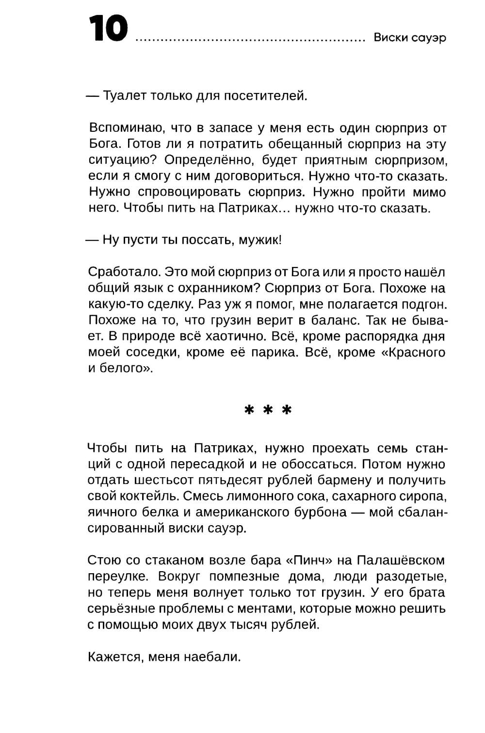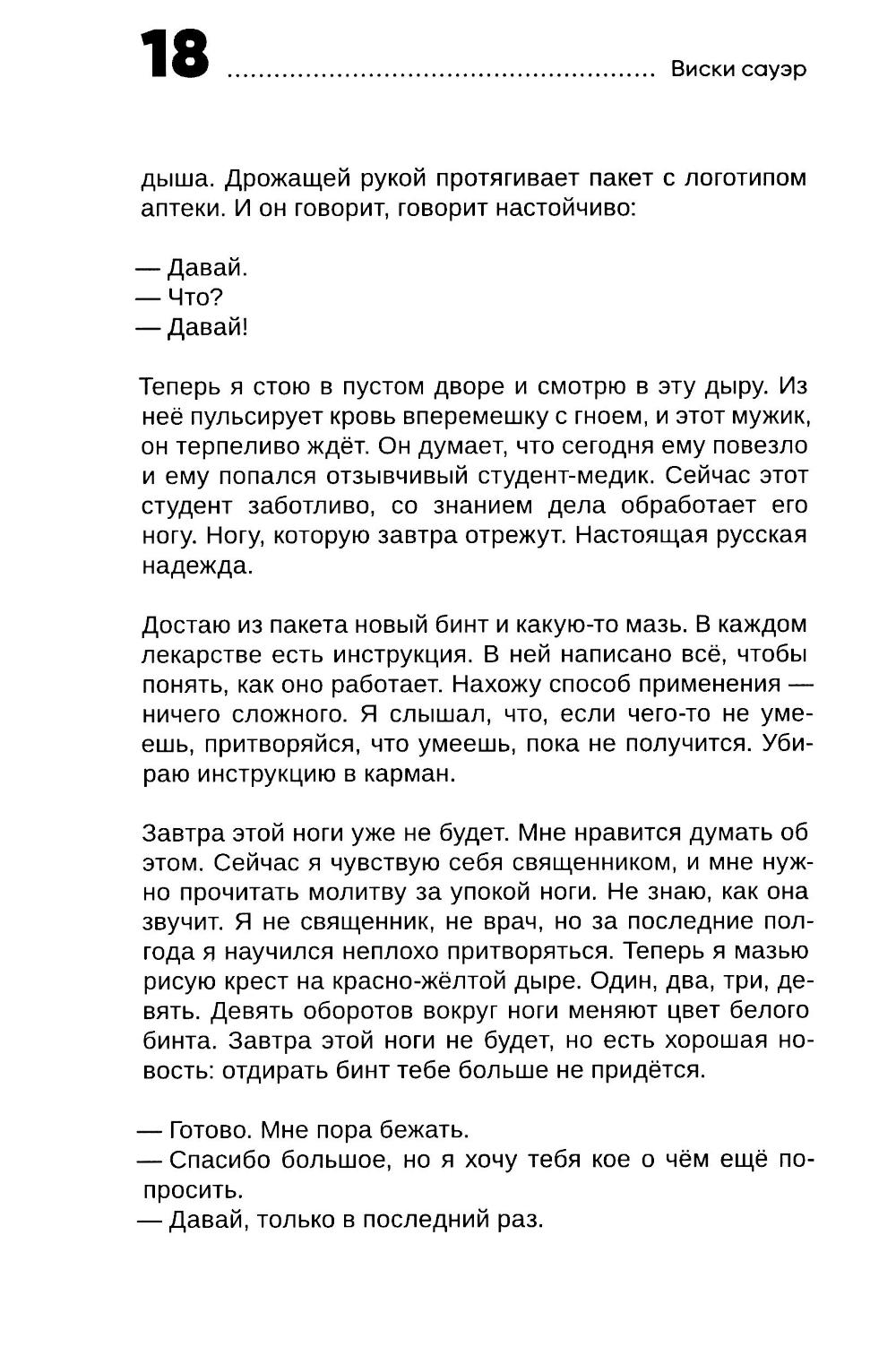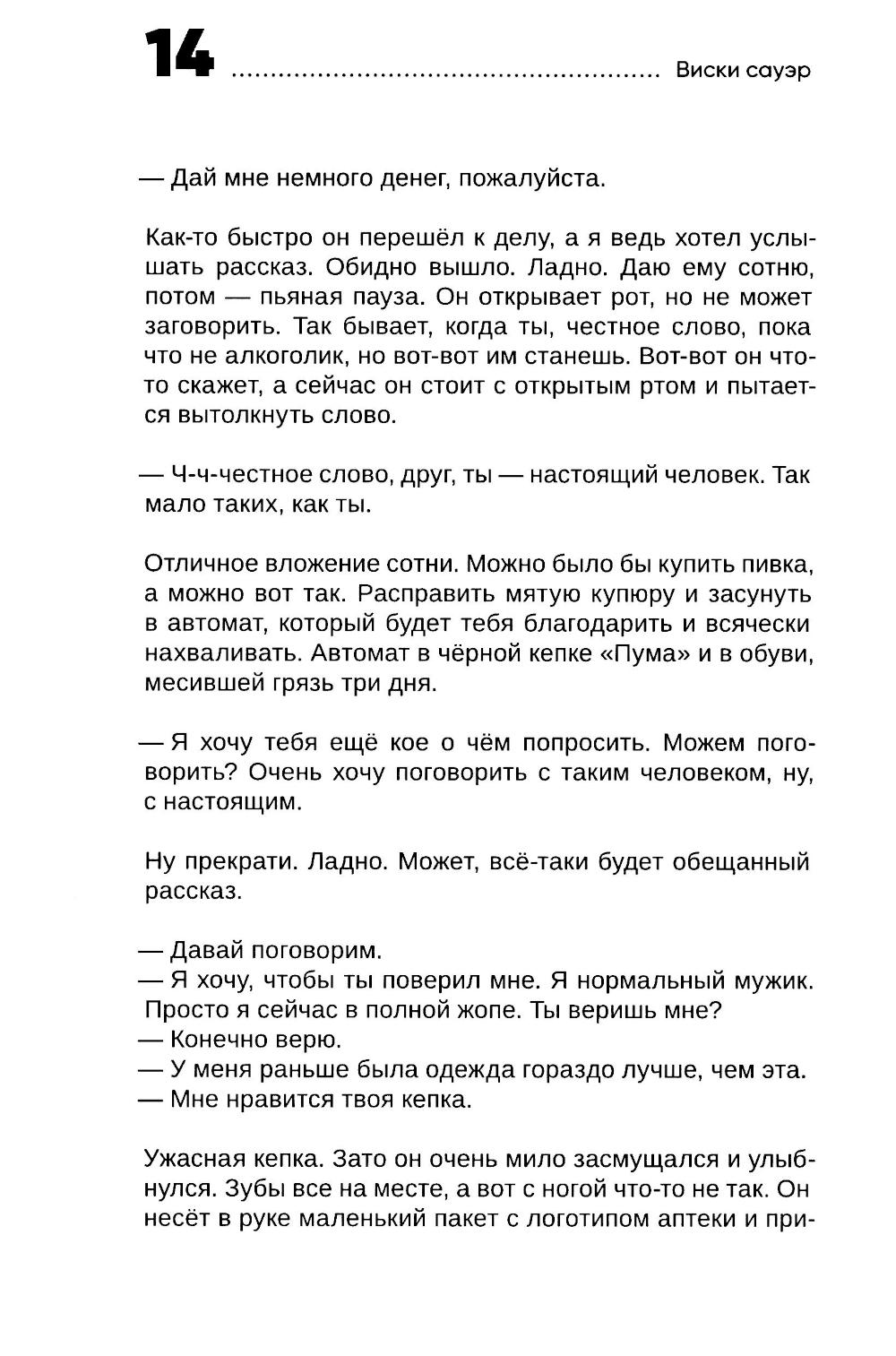 НЕЗАКОННОЕ ПОТРЕБЛЕНИЕ НАРКОТИЧЕСКИХ СРЕДСТВ, ПСИХОТРОПНЫХ ВЕЩЕСТВ, ИХ АНАЛОГОВ ПРИЧИНЯЕТ ВРЕД ЗДОРОВЬЮ, ИХ НЕЗАКОННЫЙ ОБОРОТ ЗАПРЕЩЕН И ВЛЕЧЕТ УСТАНОВЛЕННУЮ ЗАКОНОДАТЕЛЬСТВОМ ОТВЕТСТВЕННОСТЬ. «Виски сауэр» - инструкция по применению внутрь: Патриков, алкоголя, женского внимания, мужских эмоций, историй в стиле стендап, бесед с бомжами и богачами. Саргис живёт в спальном районе и каждый день оказывается на Патриках как на работе. Разговоры у туалета, за барной стойкой, в чужой квартире, на поле для гольфа, на уличной скамейке. Люди меняются, как в калейдоскопе. Тон книги - тон выпившего друга: искренний, грустный, рефлексивный, свой. Градус актуальности и узнаваемости высок, ведь «Виски сауэр» не о вечном, а о хрупком, бытовом, близком. Для тех, кто прислушивается к себе и другим людям, любит хороший рассказ и точность попадания в суть. Тех, кому наскучило «нормальное» и кто хотя бы раз пил алкоголь на последние - просто для того, чтобы остаться собой. Издатели книги не пропагандируют табак, алкоголь, наркотики и насилие, не всегда разделяют увлечения героев и призывают читателей к здоровому образу жизни.| Издательство | Чтиво |