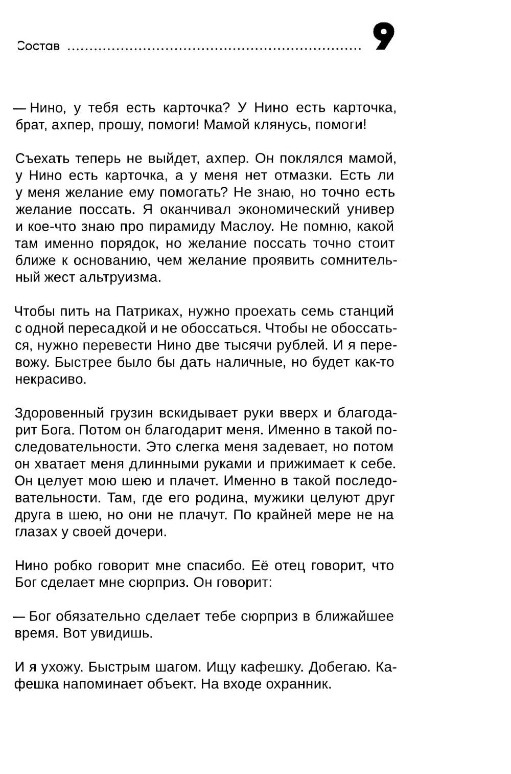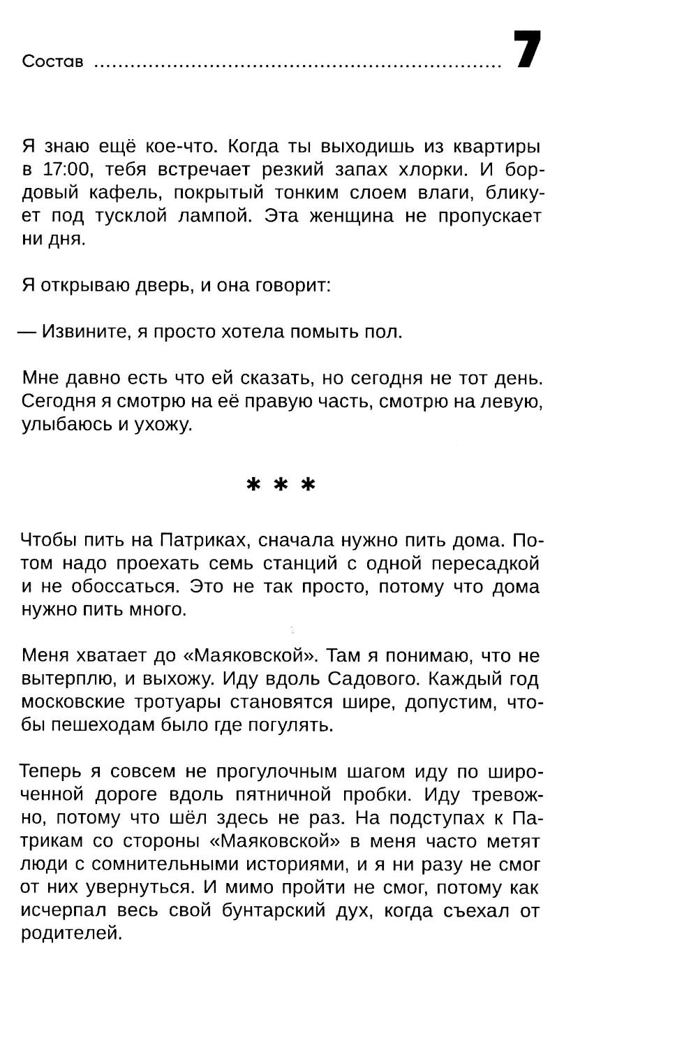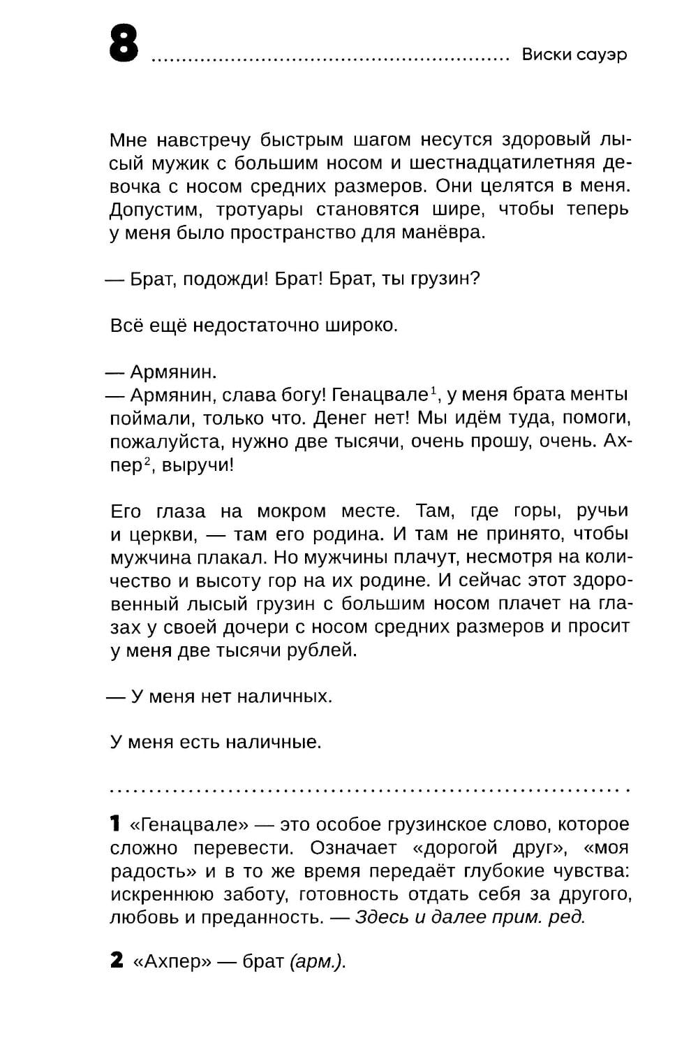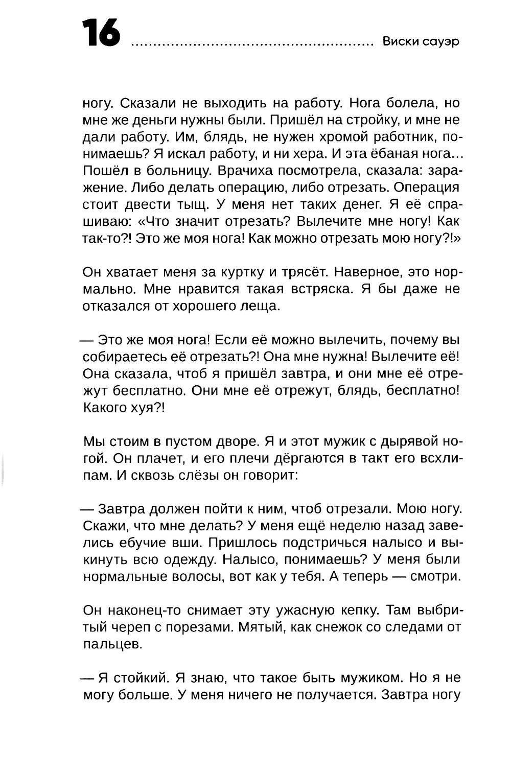 НЕЗАКОННОЕ ПОТРЕБЛЕНИЕ НАРКОТИЧЕСКИХ СРЕДСТВ, ПСИХОТРОПНЫХ ВЕЩЕСТВ, ИХ АНАЛОГОВ ПРИЧИНЯЕТ ВРЕД ЗДОРОВЬЮ, ИХ НЕЗАКОННЫЙ ОБОРОТ ЗАПРЕЩЕН И ВЛЕЧЕТ УСТАНОВЛЕННУЮ ЗАКОНОДАТЕЛЬСТВОМ ОТВЕТСТВЕННОСТЬ. «Виски сауэр» - инструкция по применению внутрь: Патриков, алкоголя, женского внимания, мужских эмоций, историй в стиле стендап, бесед с бомжами и богачами. Саргис живёт в спальном районе и каждый день оказывается на Патриках как на работе. Разговоры у туалета, за барной стойкой, в чужой квартире, на поле для гольфа, на уличной скамейке. Люди меняются, как в калейдоскопе. Тон книги - тон выпившего друга: искренний, грустный, рефлексивный, свой. Градус актуальности и узнаваемости высок, ведь «Виски сауэр» не о вечном, а о хрупком, бытовом, близком. Для тех, кто прислушивается к себе и другим людям, любит хороший рассказ и точность попадания в суть. Тех, кому наскучило «нормальное» и кто хотя бы раз пил алкоголь на последние - просто для того, чтобы остаться собой. Издатели книги не пропагандируют табак, алкоголь, наркотики и насилие, не всегда разделяют увлечения героев и призывают читателей к здоровому образу жизни.| Издательство | Чтиво |