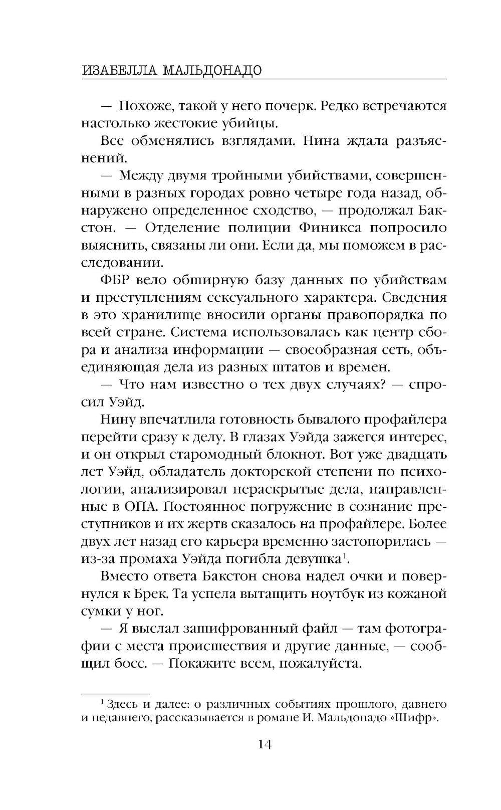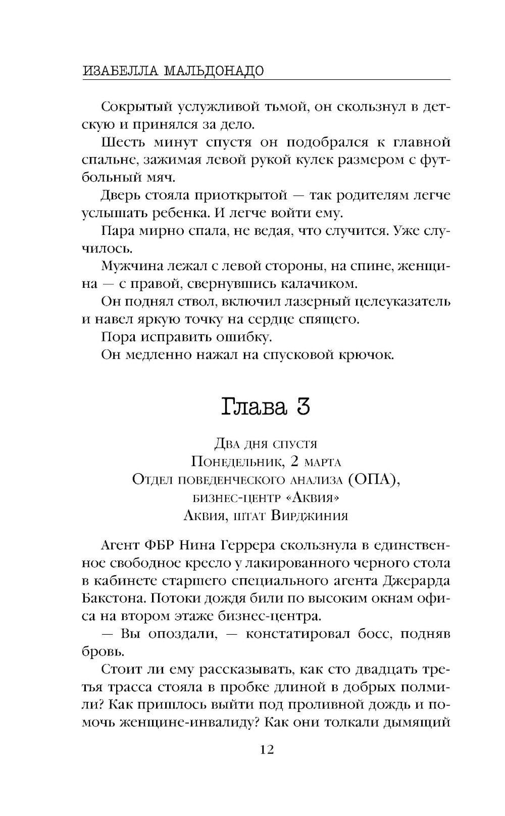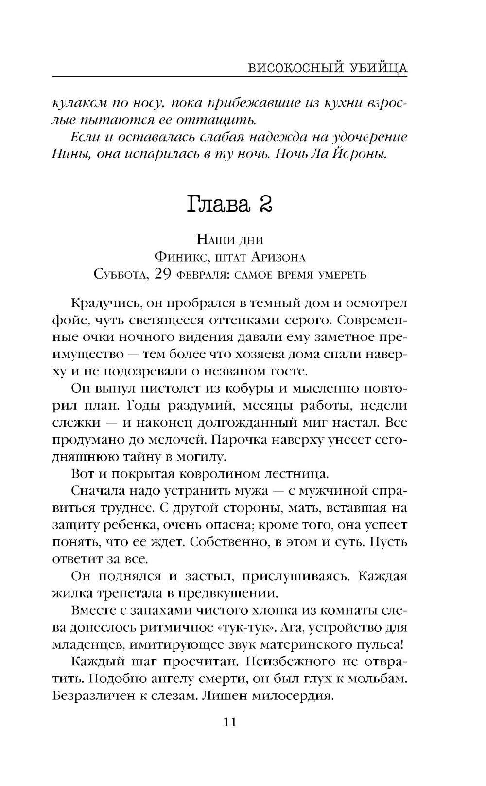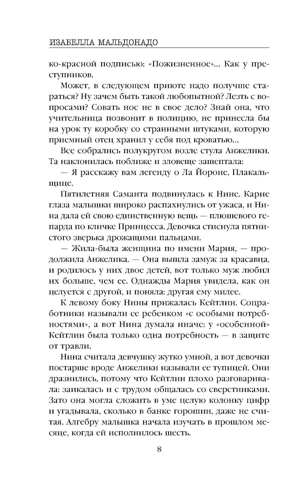 Нина Геррера - та, кому удалось сбежать от загадочного серийного убийцы по прозвищу Шифр, а затем ликвидировать его. Теперь она входит в группу профайлеров ФБР. ...Мать, отец и новорожденная дочь - все мертвы. Восьмидневная малышка задушена, мужчина убит выстрелом в сердце, женщина легла в ванну и выстрелила себе в висок. Все выглядит как двойное убийство и суицид. Но это не так. Это - почерк нового серийного убийцы. Впрочем, нового ли? Нина Геррера и ее коллеги из Отдела поведенческого анализа быстро выясняют, что он вышел на охоту... 28 лет назад. Убивает по всей стране, и каждое место преступления напоминает страшную легенду о Ла Йороне - призраке плачущей женщины. Легенду, так пугавшую Нину в детстве, когда она была беззащитным ребенком. Инсценировки настолько хороши, что до сих пор никто не догадался свести эти дела воедино. И самое странное - убийства совершаются каждый високосный год, 29 февраля...| Издательство | Эксмо |