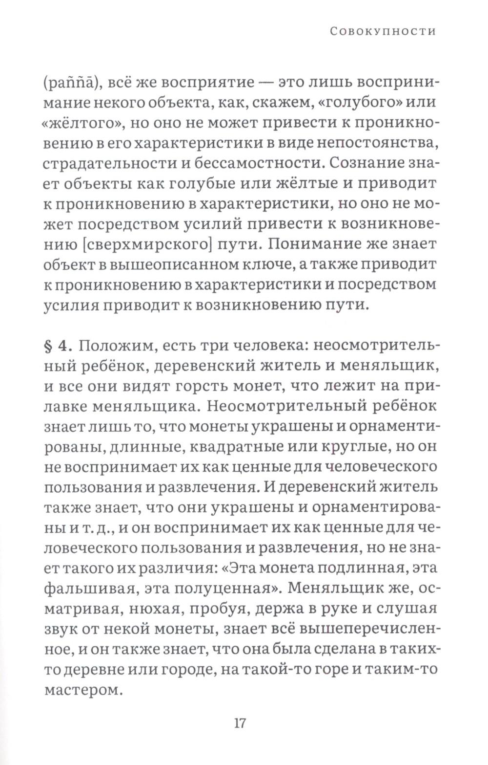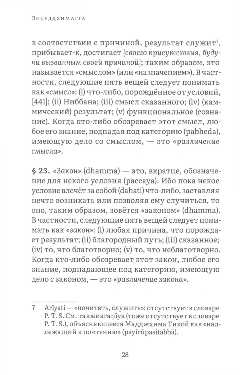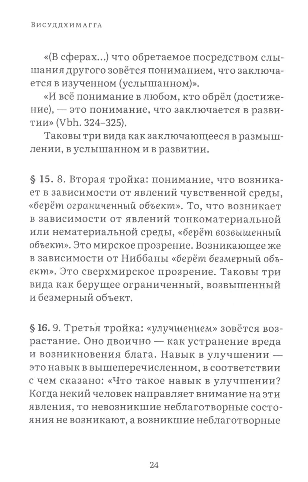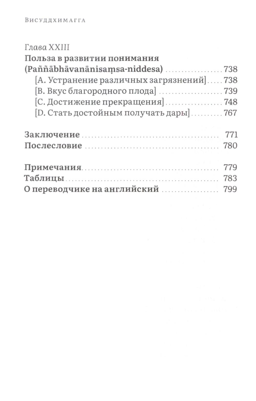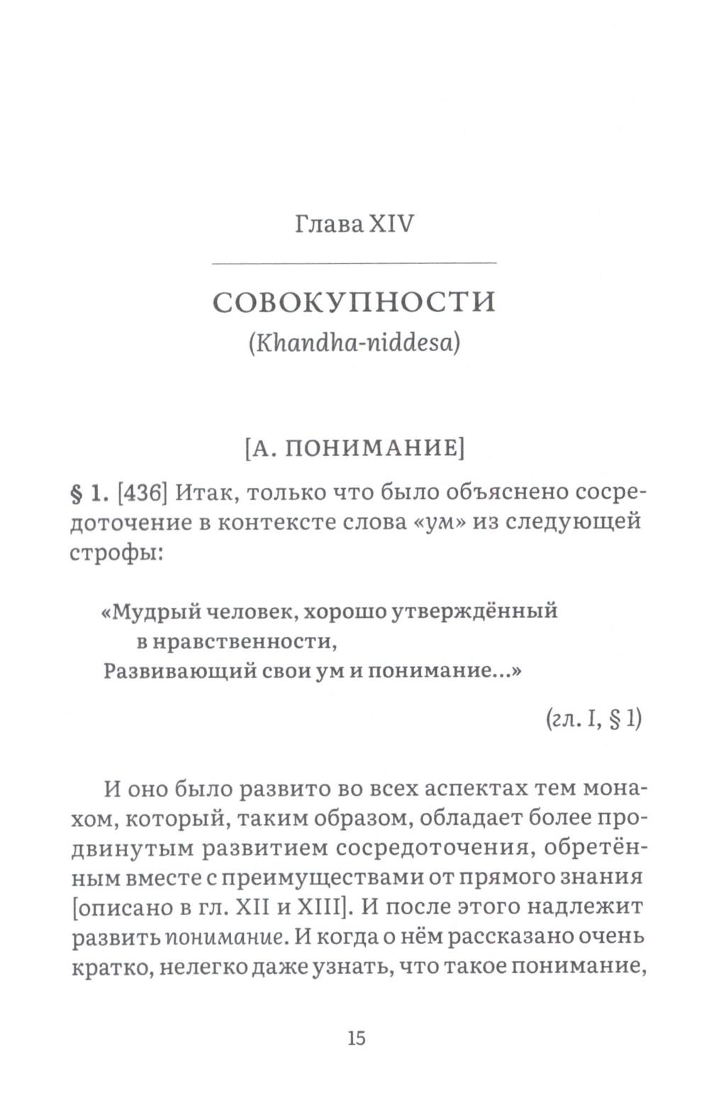Висуддхимагга - это «великий трактат» буддизма Тхеравады, энциклопедическое руководство по буддийской доктрине и медитации, написанное в пятом веке знаменитым буддийским комментатором Бхадантачарией Буддхагхосой. При написании этой книги автор поставил своей целью систематизировать и объединить различные учения Будды, встречающиеся во всем Палийском каноне, в ясный и всеобъемлющий путь, ведущий к конечной буддийской цели - Ниббане, состоянию полного очищения от аффектов и прекращения страданий. Трактат состоит из трех больших разделов. Первый посвящен очень подробному обсуждению различных аспектов буддийской нравственности, важнейшей составной части восьмеричного Пути. Во второй части излагаются теоретические и практические вопросы, касающиеся природы сосредоточения (самадхи), его разновидностей, путей достижения и приносимой им пользы. Автор детально обсуждает различные виды медитативных опор, с помощью которых достигается погружение в тонкие и очищенные от пяти помех состояния сознания (джханы), а также раскрывает природу различных уровней медитативного погружения. Третий раздел посвящен обсуждению развития понимания, мудрости, способной постигнуть вещи такими, какими они являются в действительности, что ведет к окончательному освобождению от пут самсары. Трактат издается в двух томах. В первом томе представлены первые два раздела, во втором - третий. Все таблицы, упоминаемые в книге, будут представлены во втором томе.| Издательство | Изд. Ганга |