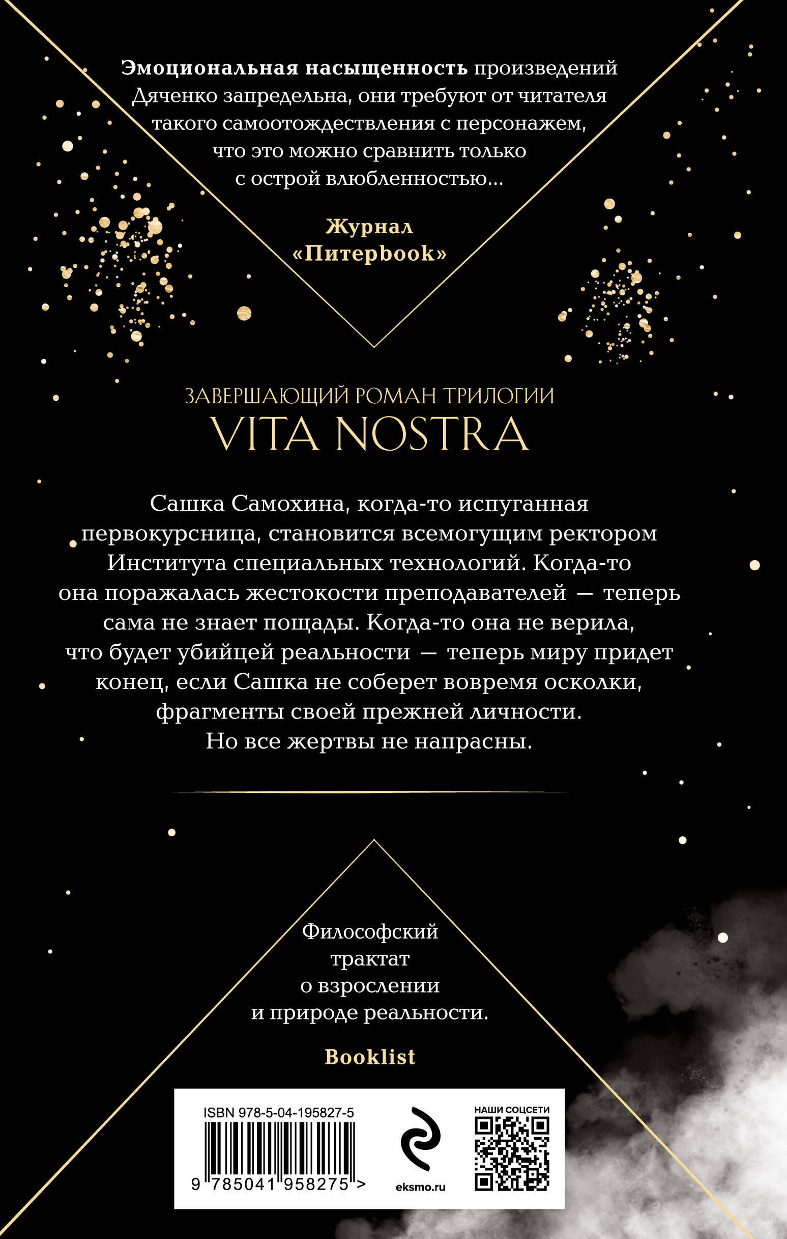 Завершающий роман трилогии «Vita Nostra» - история любви и надежды. Первая часть романа, «Vita Nostra», переведена на 6 языков, авторы стали лауреатами более 100 премий, отечественных и международных. Этот роман по-прежнему остается одной из самых «читабельных» книг на русском языке. Супруги Дяченко - писатели-соавторы, сценаристы, лауреаты более ста литературных премий. Последние десять лет жили в США, писали на русском языке в жанрах современной научной фантастики, фэнтези и сказки. Их книги переведены и издаются в Америке, Великобритании, Германии, Франции, Италии, Испании, Бразилии, Китае и других странах. После смерти в 2022 году Сергея Дяченко, своего мужа, друга и соавтора, Марина продолжает их общее дело, как и обещала Сергею.| Издательство | ООО "Издательство "Эксмо" |