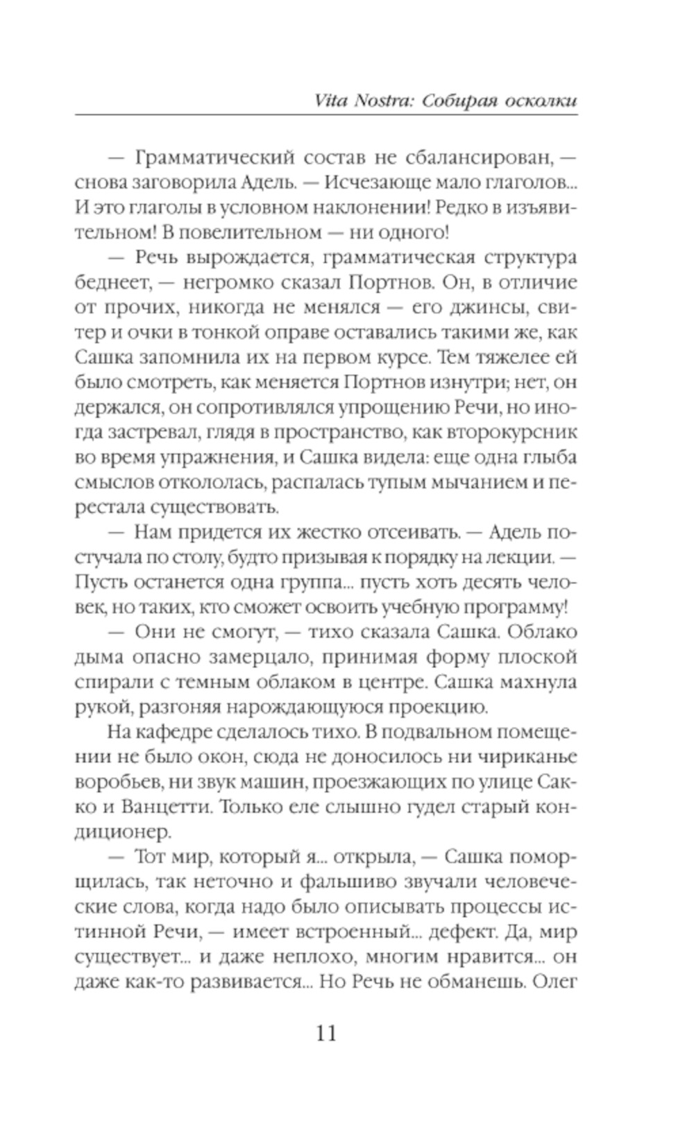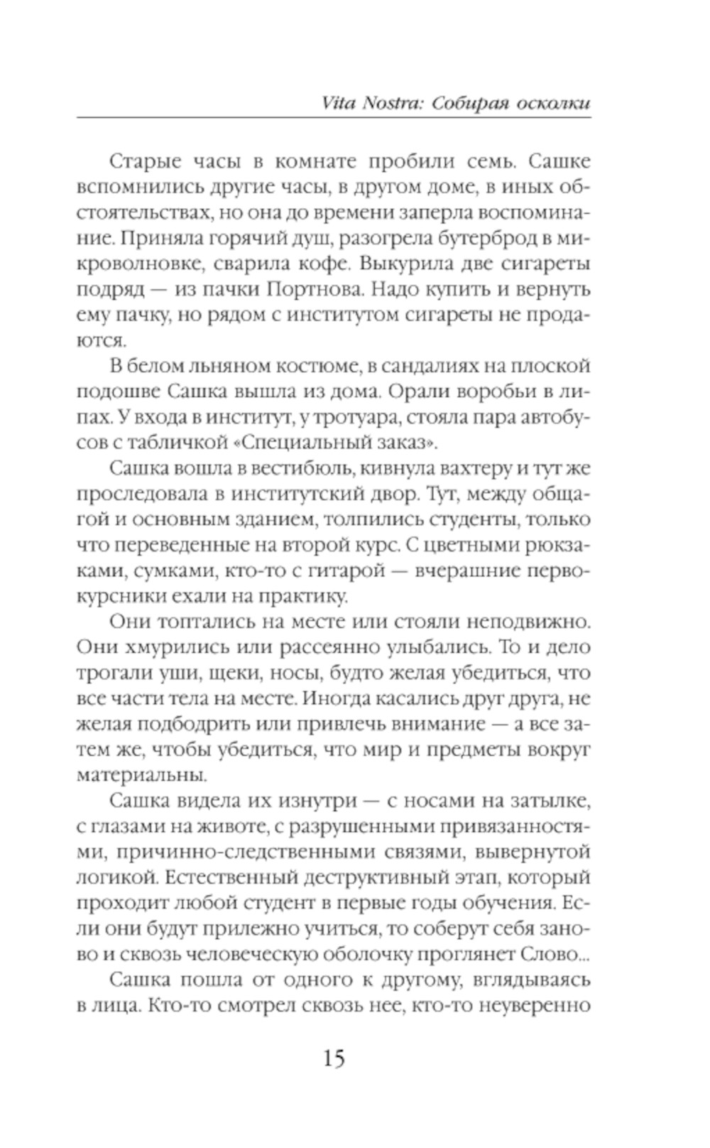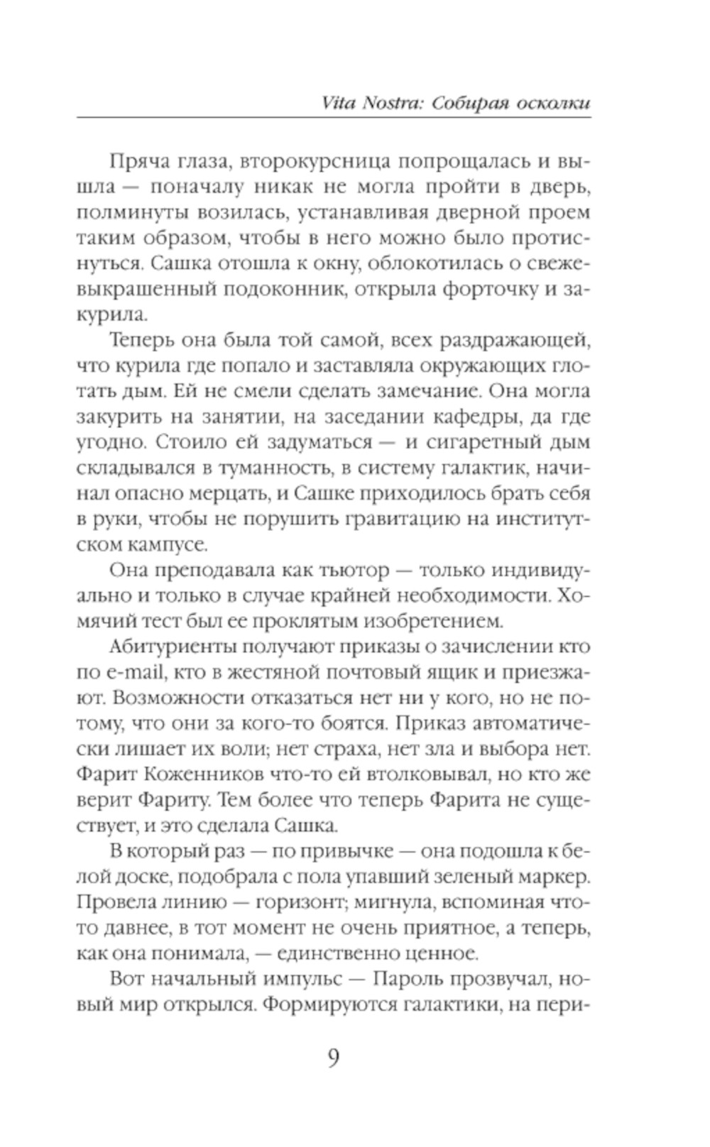 Завершающий роман трилогии «Vita Nostra» - история любви и надежды. Первая часть романа, «Vita Nostra», переведена на 6 языков, авторы стали лауреатами более 100 премий, отечественных и международных. Этот роман по-прежнему остается одной из самых «читабельных» книг на русском языке. Супруги Дяченко - писатели-соавторы, сценаристы, лауреаты более ста литературных премий. Последние десять лет жили в США, писали на русском языке в жанрах современной научной фантастики, фэнтези и сказки. Их книги переведены и издаются в Америке, Великобритании, Германии, Франции, Италии, Испании, Бразилии, Китае и других странах. После смерти в 2022 году Сергея Дяченко, своего мужа, друга и соавтора, Марина продолжает их общее дело, как и обещала Сергею. Сашка Самохина, когда-то испуганная первокурсница, становится всемогущим ректором Института специальных технологий. Когда-то она поражалась жестокости преподавателей - теперь сама не знает пощады. Когда-то она не верила, что будет убийцей реальности - теперь миру придет конец, если Сашка не соберет вовремя осколки, фрагменты своей прежней личности. Но все жертвы не напрасны.| Издательство | Эксмо |