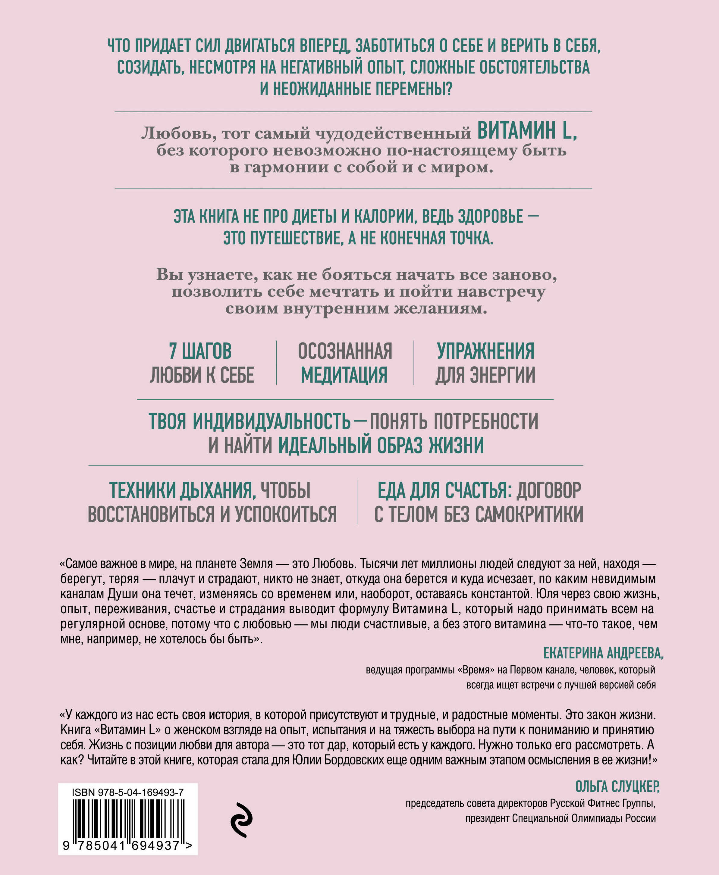 Журналистка и телеведущая Юлия Бордовских предлагает взглянуть на свое здоровье сквозь призму любви, открыть в себе это чувство и с его помощью наполниться энергией. Личный опыт, извлеченный из кризисных жизненных ситуаций, встречи с удивительными людьми, изменившими ее отношение к привычным вещам, знания, полученные во время учебы на тренера по здоровью, простые и эффективные упражнения для знакомства с собственной внутренней вселенной - об этом и многом другом она рассказывает в книге «Витамин L». 7 шагов любви к себе и витамины для души. Ваша индивидуальность - понять потребности и найти идеальный образ жизни. Еда для счастья: договор с телом без самокритики. Просто дыши: техники дыхания, чтобы восстановиться и успокоиться. Осознанная медитация. Упражнения для энергии.| Издательство | ООО "Издательство "Эксмо" |