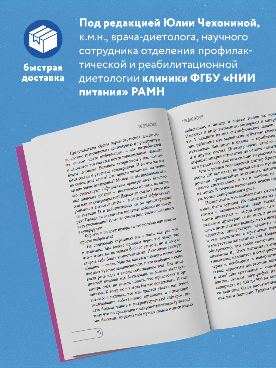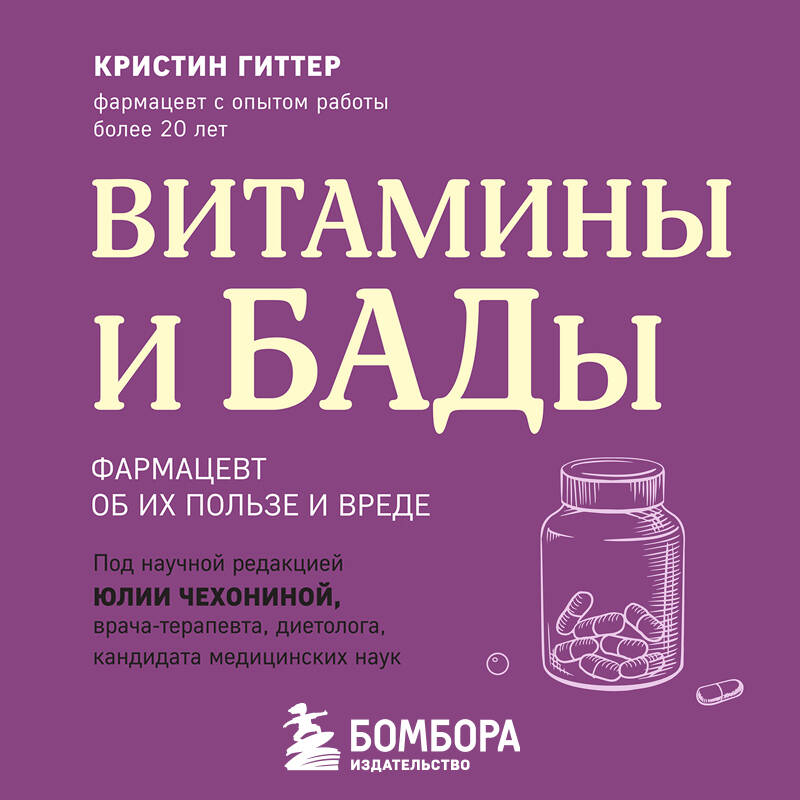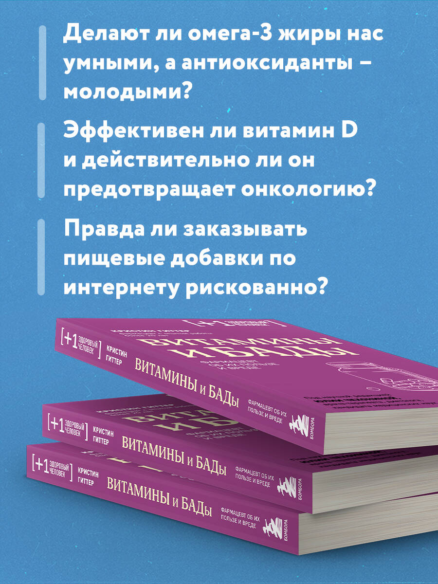 Ориентироваться в рынке витаминов и БАДов обычному покупателю очень сложно, а когда вокруг еще столько рекомендаций, задача быть здоровым становится практически невыполнимой. Человек может пропить курс совершенно ненужного ему витамина и заработать гипервитаминоз, а может не понять признаки недостатка витаминов и тем самым не предпринять своевременные действия. Именно поэтому Кристин Гиттер, опытный фармацевт из Германии, написала данную книгу, она даст ответы на ваши вопросы и развеет сомнения. - Что именно витамины и минералы делают в нашем организме? Доказана ли их эффективность? И из чего их производят? - Можно ли улучшить свою память или зарядить себя энергией с помощью пищевых добавок? - Универсальна ли суточная потребность, которая указывается на упаковке? И как ее рассчитать для себя? «В этой книге автор делится своими знаниями и профессиональным опытом в области качества и безопасности БАД в пище. Это своевременная, нужная и очень актуальная книга - путеводитель в бескрайнем мире современного ассортимента пищевых добавок, изложенная доступно и очень интересно. На страницах этого издания автор дает актуальные советы и развернутые ответы на популярные вопросы - как правильно выбирать и использовать витаминно-минеральные комплексы, на что обращать внимание при их покупке в аптеке. Информация, изложенная в книге, вызывает доверие, так как написана профессионалом - клиническим фармакологом, специалистом с ученой степенью. Однако освоение материала должно быть вдумчивым и выбор БАД к пище должен обсуждаться с лечащим врачом». ЮЛИЯ ЧЕХОНИНА, кандидат медицинских наук, старший научный сотрудник клиники «ФИЦ питания, биотехнологии и безопасности пищи» - Витамины являются универсальными солдатами в метаболическом процессе и участвуют в более чем 1000 реакциях. Неудивительно, что мы не можем выжить без них! - Кишечник не перерабатывает все, что ему предлагают. Если его измерительные системы регистрируют слишком большое количество водорастворимого витамина в содержимом, он не все полностью поглощает. Наше тело удивительно умно, не правда ли?! - Для водорастворимых витаминов у нас нет определенных хранилищ. Избыток выводится из организма через почки. - Суточная потребность в том или ином витамине - индивидуальна для каждого, общие нормы очень условны и предназначены только для здоровых людей. - Ни одно приложение по контролю приема пищи на телефоне не даст вам точные данные о полученных витаминах за день. - 95% женщин имеют низкий уровень фолиевой кислоты в крови. - Мышьяк стал одним из первых антивозрастных препаратов, который получил широкое распространение. - Ягоды годжи в сочетании с некоторыми препаратами, разжижающими кровь, могут привести к опасному внутреннему кровотечению.
