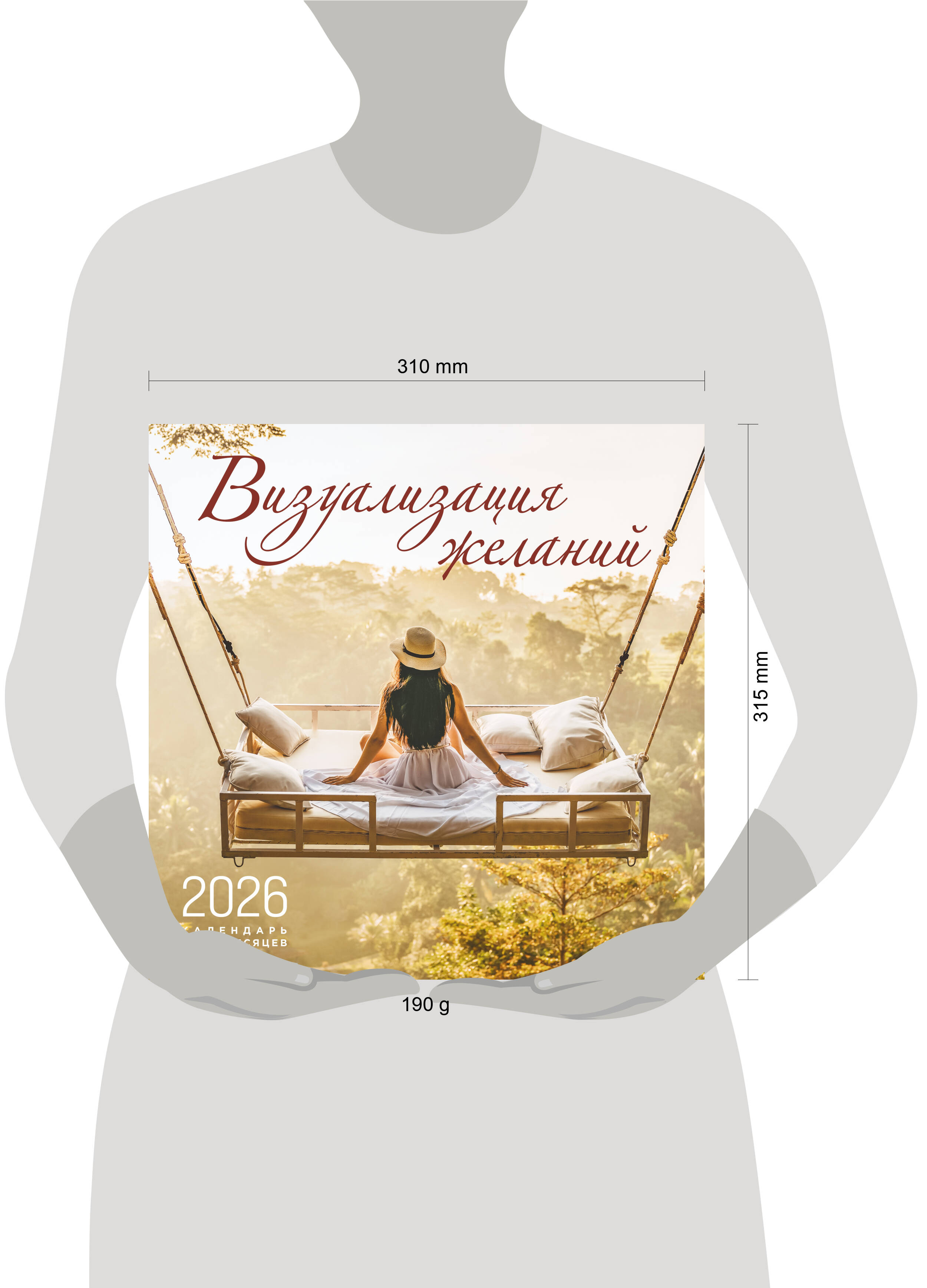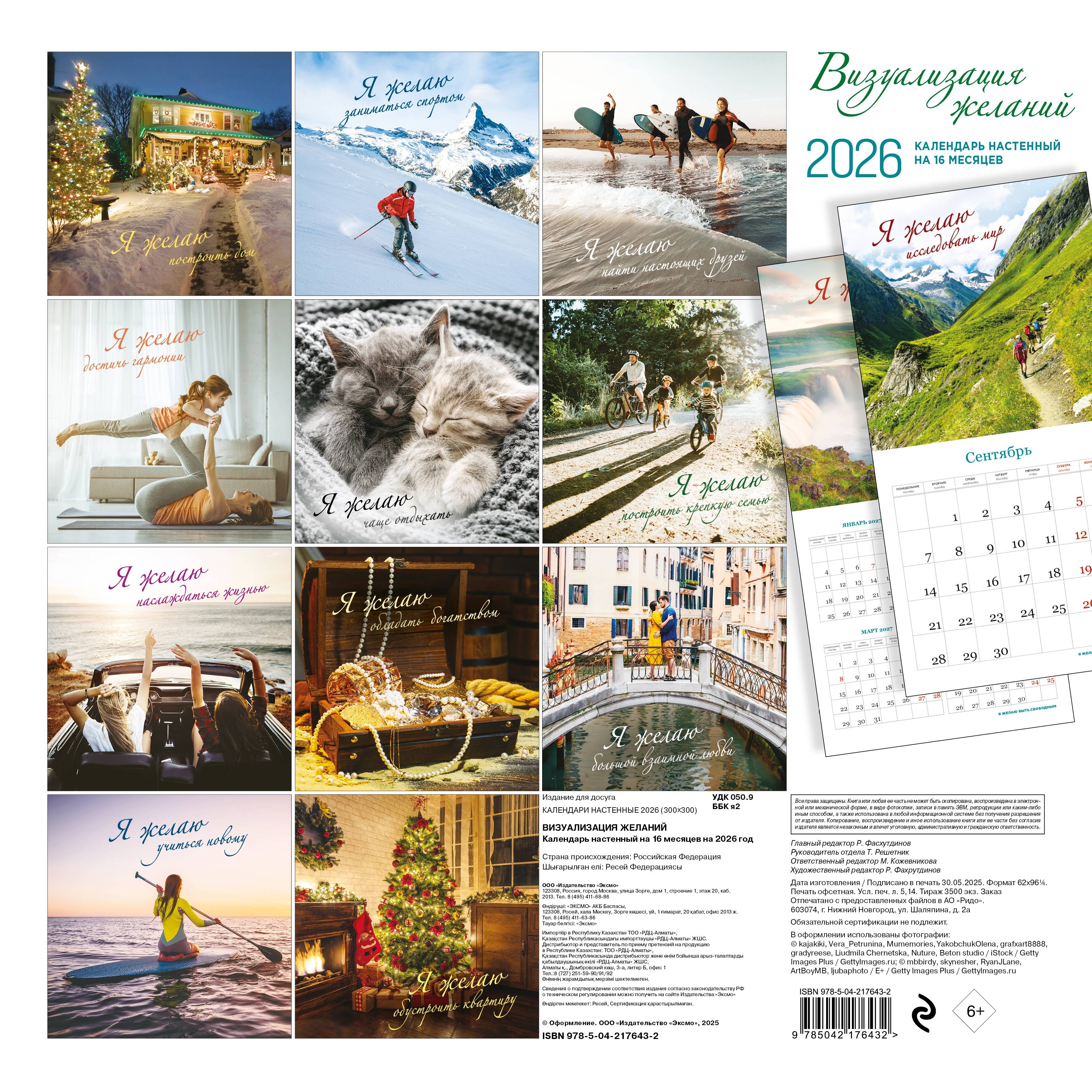 О серии: Наши настенные календари отличаются высоким качеством исполнения! Тщательно подобранные иллюстрации, напечатанные на глянцевой бумаге высочайшего качества, станут настоящим украшением дома, а в календарной сетке найдется место для ваших планов: большие клетки позволят делать записи и организовать свой год! В календаре также отмечены все государственные праздники. В серии настенных календарей издательства «ЭКСМО» каждый найдет тему по вкусу: великие художники, великолепные подборки с самыми знаменитыми произведениями искусства, легендарные кинематографические саги и игры, главные книжные авторы и бестселлеры, фотографии и иллюстрации любимых животных и многое-многое другое! О календаре: Яркие фотографии с мотивационными аффирмациями, напечатанные на высококачественной бумаге, вдохновят тех, кто стремится сделать свою жизнь насыщеннее, лучше и комфортнее. Календарь визуализации желаний - это уникальный инструмент, который поможет вам сфокусироваться на своих целях и мечтах. Каждый месяц можно использовать как возможность для планирования своих желаний и жизненных целей. Визуализируйте свои мечты и используйте этот календарь, чтобы вдохновляться каждый день! Главное - уметь мечтать! Яркие и красочные картинки органично дополнят любой интерьер, а просторная сетка поможет удобно планировать время. Также в календарь включен дополнительный разворот с первыми четырьмя месяцами 2027 года! Для кого: Для всех, кто любит мечтать и ставить перед собой амбициозные цели, а также стремится сделать свою жизнь лучше и наполнить ее яркими красками! Технические параметры: - Тип календаря - настенный перекидной. - Год - 2026. - Календарная сетка - с разбивкой по месяцам. - Вид скрепления - скрепка. - Ширина - 30 см. - Высота - 30 см. - Внутренний блок - мелованная бумага 115 г/м2. - Подложка - плотный гофрокартон для поддержания формы. - Индивидуальная упаковка в плотный целлофановый пакет.| Издательство | ООО "Издательство "Эксмо" |