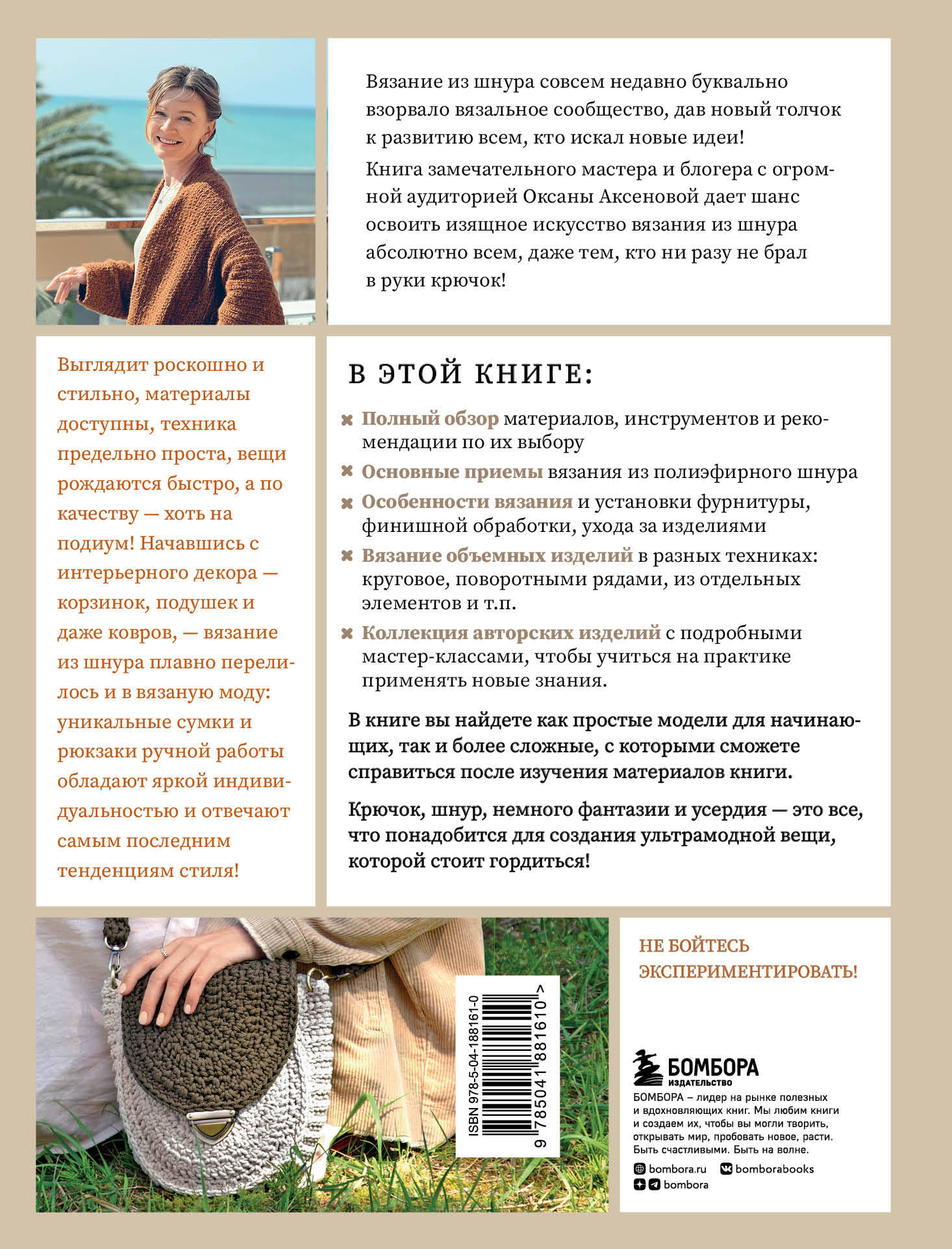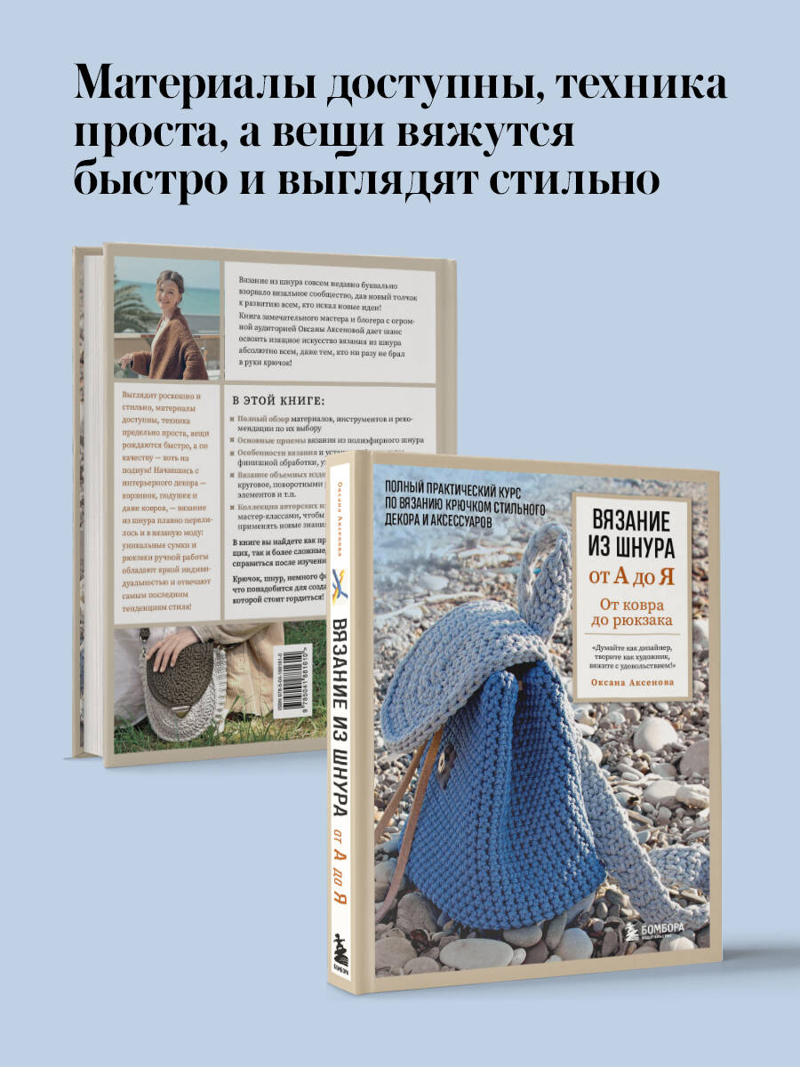 Стильные аксессуары и декор для современного дома, уникальные и неповторимые рюкзаки и сумки! Все это связано из недорогого шнура с помощью несложных техник, а выглядит в полном соответствии с современной модой на стиль сканди, для которого характерны натуральные оттенки, крупные переплетения, простые материалы, лаконичный дизайн. Оксана Аксенова - замечательный мастер, преподаватель, популярный блогер, предлагает вниманию читателя полное практическое руководство по освоению вязания крючком из шнура, джута или трикотажной пряжи. - Полный обзор материалов и инструментов и рекомендации по их выбору. - Основные приемы и особенности вязания, авторские лайфхаки и секреты. - Инструкции по установке фурнитуры, финишной обработке, уходу за изделиями. - Вязание объемных изделий в разных техниках: круговое, поворотными рядами, из отдельных элементов и т.п. - Коллекция авторских изделий с подробными мастер-классами, чтобы учиться на практике применять новые знания! Научиться вязать и создавать уникальные вещи ручной работы по этой книге по силам абсолютно всем, кто ищет новые идеи! Не бойтесь экспериментировать!| Издательство | ООО "Издательство "Эксмо" |