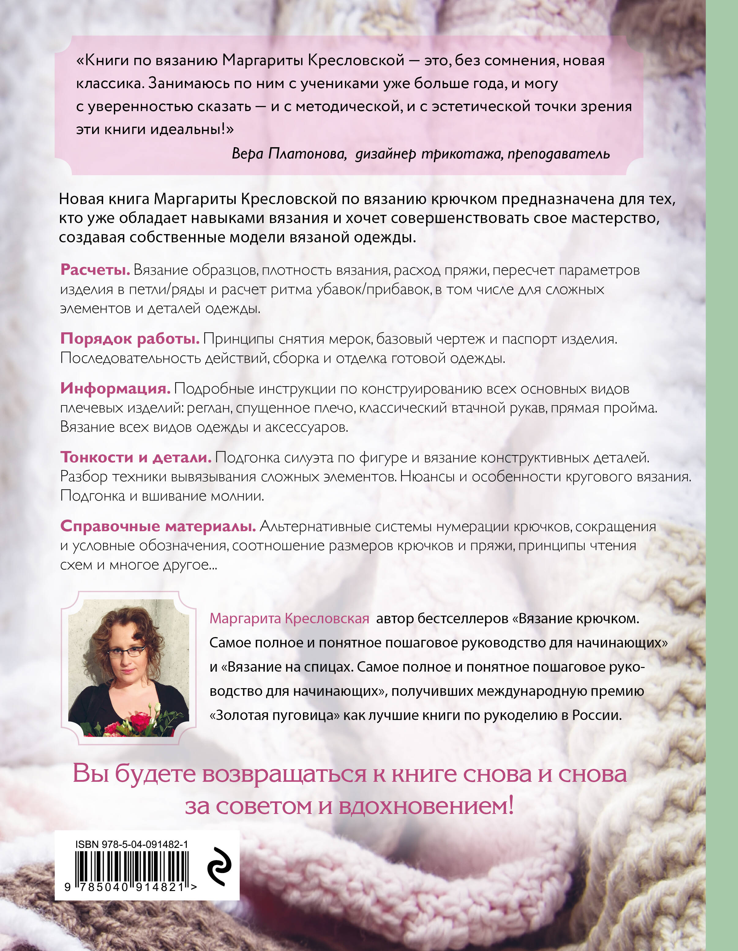 Новая книга автора бестселлера "Вязание крючком. Самое полное и понятное пошаговое руководство", признанного лучшей российской книгой по рукоделию на международном конкурсе "Золотая пуговица", Маргариты Кресловской рассказывает о моделировании вязанной крючком одежды. Большая и прекрасно иллюстрированная энциклопедия содержит все самое важное и необходимое, чтобы научиться создавать шапки и варежки, носки и свитеры, кардиганы и митенки, словом, все, что подскажет вам ваша фантазия. Книга предназначена для тех, кто уже обладает навыками вязания и хочет совершенствовать свое мастерство, и для всех, кому во время работы может понадобиться совет или доступный справочный материал. Самое полное и понятное руководство не предлагает вам вязать конкретные авторские модели, оно дает нечто гораздо более ценное - знания, навыки и полезную информацию, которые будут необходимы всю жизнь! Методически выверенная последовательность подачи материала, понятное и доступное изложение, иллюстрированное многочисленными рисунками и схемами, подробное объяснение каждого шага работы. Вы будете возвращаться к книге снова и снова за советом и вдохновением!| Издательство | ООО "Издательство "Эксмо" |