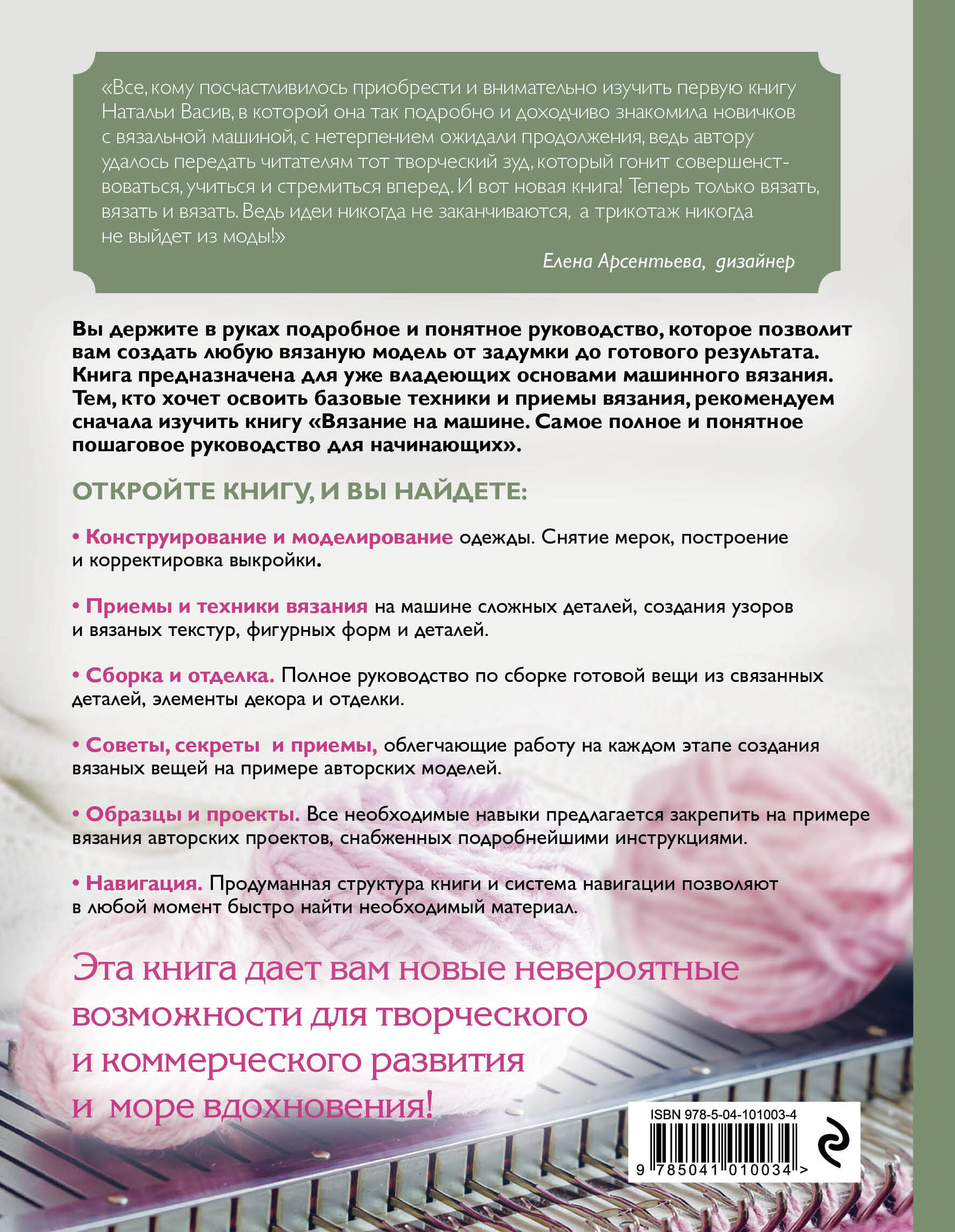 Популярность вязания на машине растет с каждым днем. Ведь это возможность создавать уникальные вещи ручной работы быстро и на высочайшем уровне. Не случайно первая книга автора, посвященная основам машинного вязания для начинающих, стала настолько популярной! И вот - продолжение! Освоив базовые приемы и техники, пришла пора научиться моделировать и вязать конкретные предметы одежды на необходимый размер, освоить создание узоров и различных типов полотна, разобраться, как вывязывать различные детали одежды - карманы, рукава, полочки и многое другое. Как и первая книга, это издание содержит множество пошаговых фотографий и подробные, понятные инструкции, благодаря которым, а еще советам и секретам автора, вы станете настоящими мастерами машинного вязания. И как знать, возможно, любимое увлечение станет делом всей жизни!