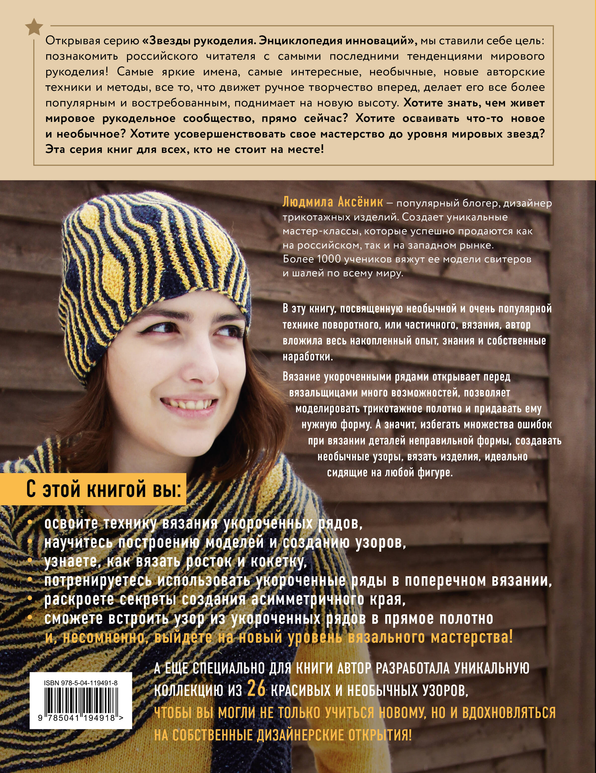 Одна из самых модных и полезных техник вязания, вязание укороченными рядами, частичное или поворотное вязание - подробно, понятно и красиво в первой книге популярного блогера и мастера Людмилы Аксеник (mrs_knowall). Книга научит вас моделировать вязаное полотно, придавая ему нужную форму, избегать множества проблем при посадке изделия на фигуру, работать с деталями неправильных очертаний. Практическая польза книги огромна, но эстетическое наслаждение от 26 необычных и стильных авторских узоров, прекрасных иллюстраций и воодушевляющих проектов - ничуть не меньше! Будьте в тренде, освойте одну из самых полезных и перспективных техник вязания, сделайте еще один шаг на пути к высокому мастерству.| Издательство | ООО "Издательство "Эксмо" |