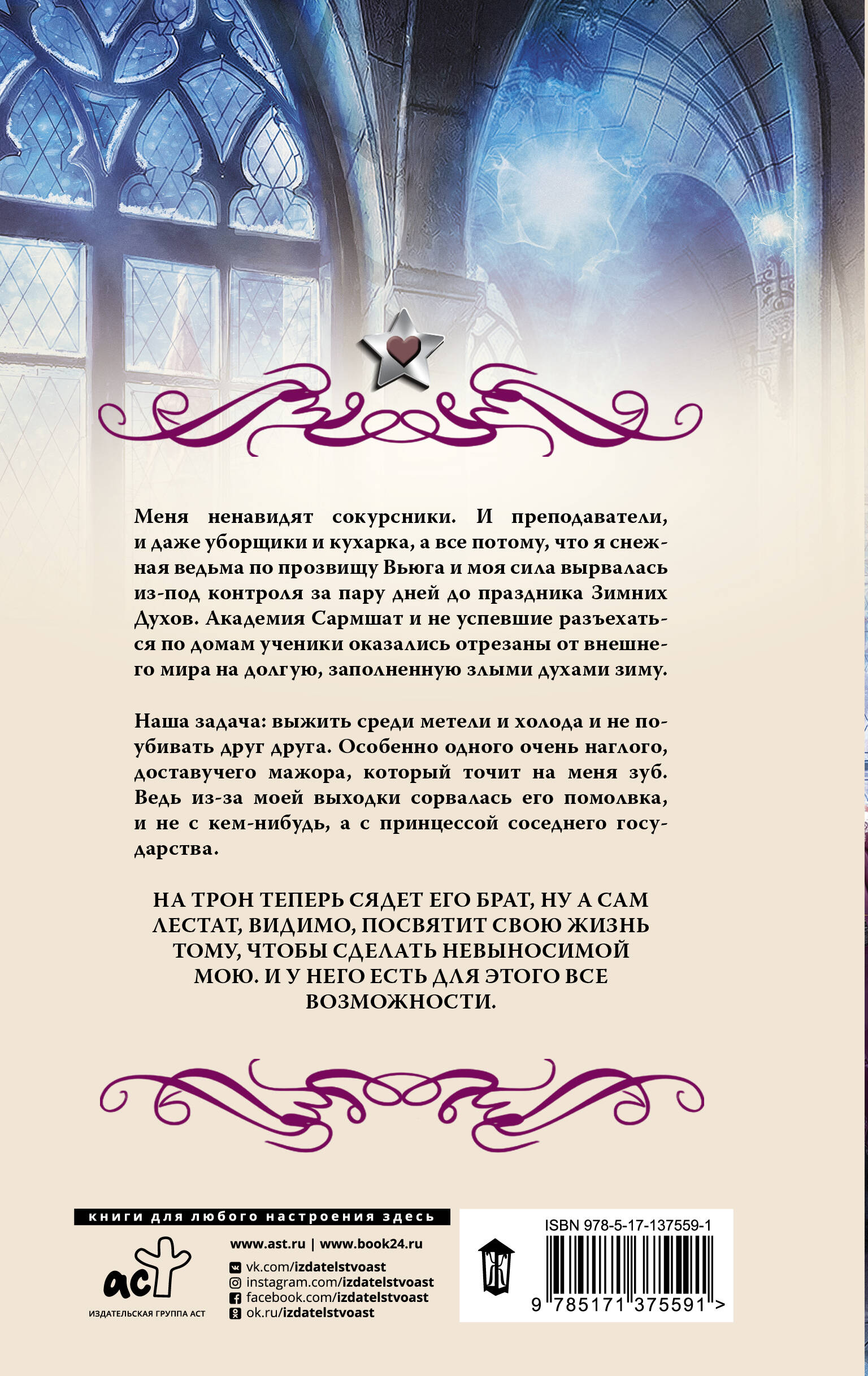 Меня ненавидят сокурсники. И преподаватели, и даже уборщики и кухарка, а все потому, что я снежная ведьма по прозвищу Вьюга и моя сила вырвалась из-под контроля за пару дней до праздника Зимних Духов. Академия Сармшат и не успевшие разъехаться по домам ученики оказались отрезаны от внешнего мира на долгую, заполненную злыми духами зиму.Наша задача: выжить среди метели и холода и не поубивать друг друга. Особенно одного очень наглого, доставучего мажора, который точит на меня зуб. Ведь из-за моей выходки сорвалась его помолвка, и не с кем-нибудь, а с принцессой соседнего государства. На трон теперь сядет его брат, ну а сам Лестат, видимо, посвятит свою жизнь тому, чтобы сделать невыносимой мою. И у него есть для этого все возможности.| Издательство | ИЗДАТЕЛЬСТВО "АСТ" |