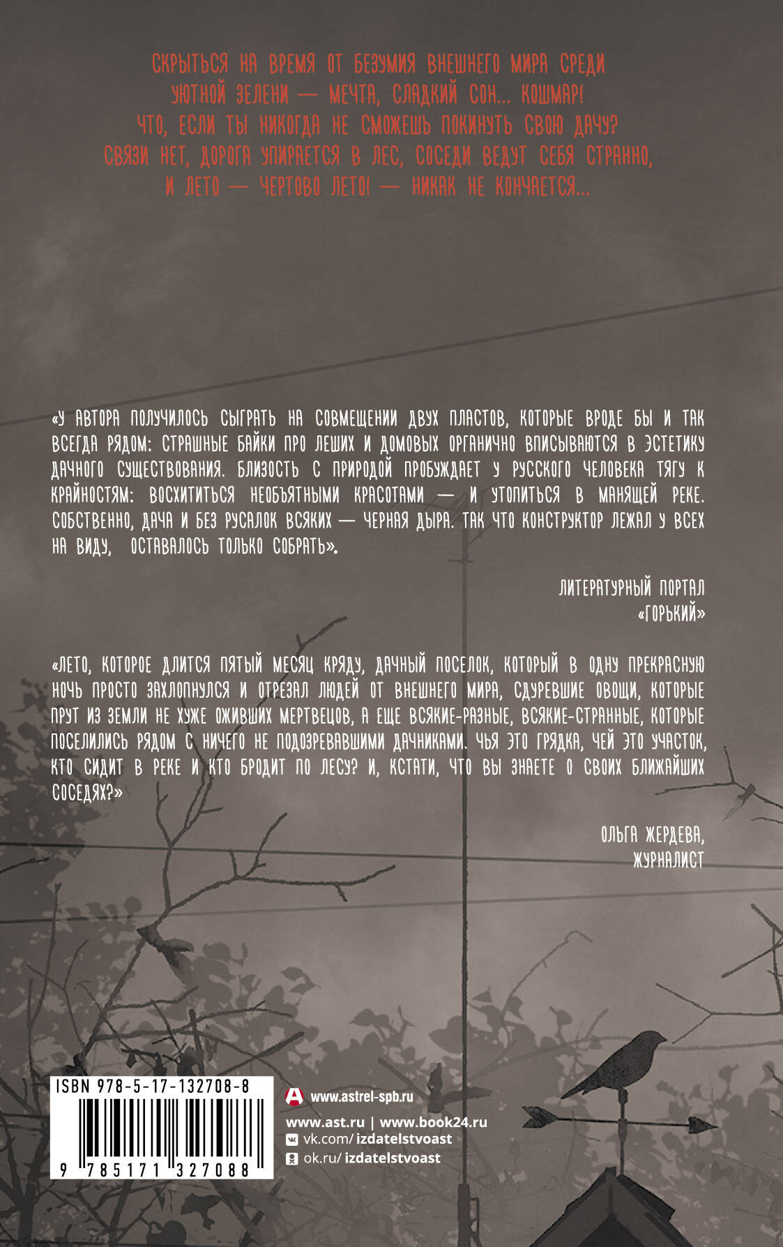 Скрыться на время от безумия внешнего мира среди уютной зелени - мечта, сладкий сон… кошмар! Что, если ты НИКОГДА не сможешь покинуть свою дачу? Связи нет, дорога упирается в лес, соседи ведут себя странно, и лето - чертово лето! - никак не кончается... Роман вошел в лонг-лист премий "Большая книга", "Ясная Поляна", "Интерпресскон" и получил премии "Новые горизонты" и "Мастера ужасов".| Издательство | ИЗДАТЕЛЬСТВО "АСТ" |