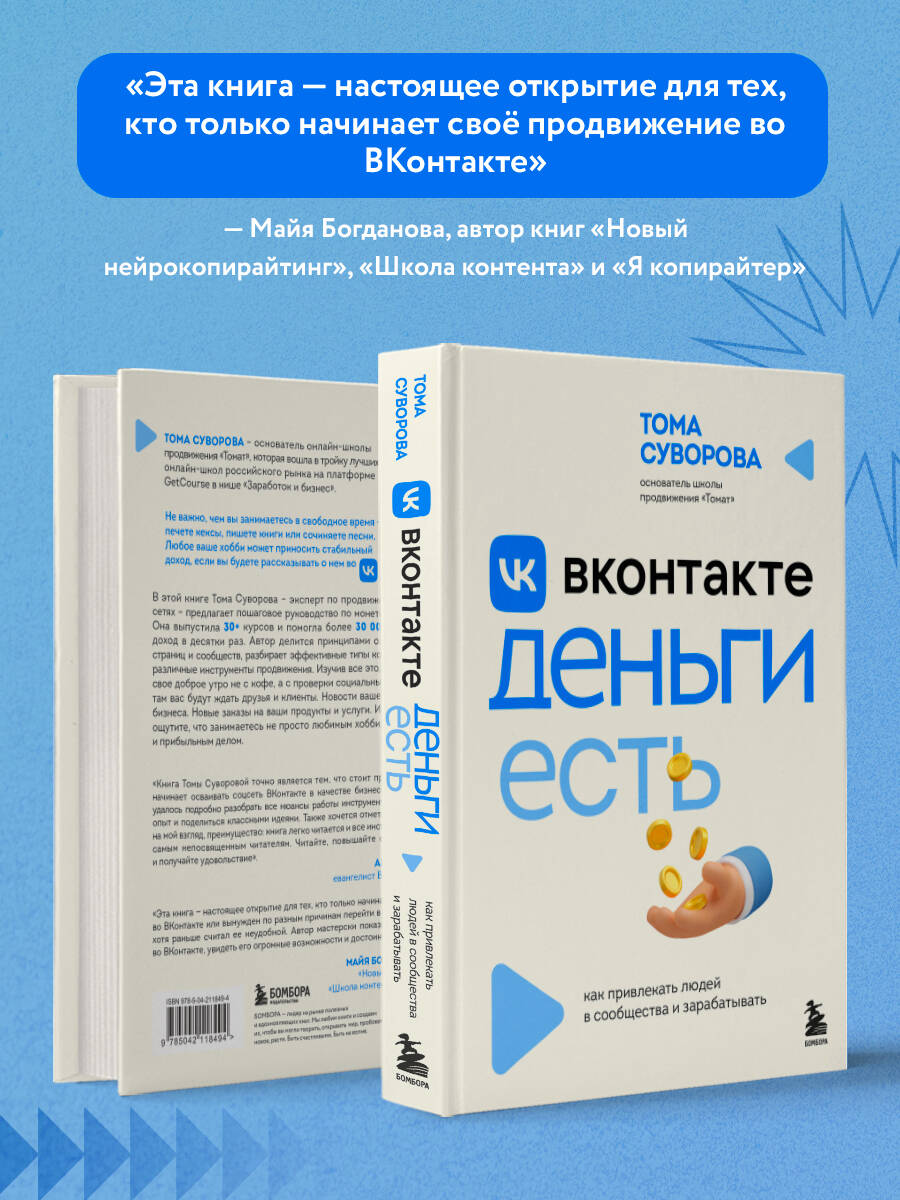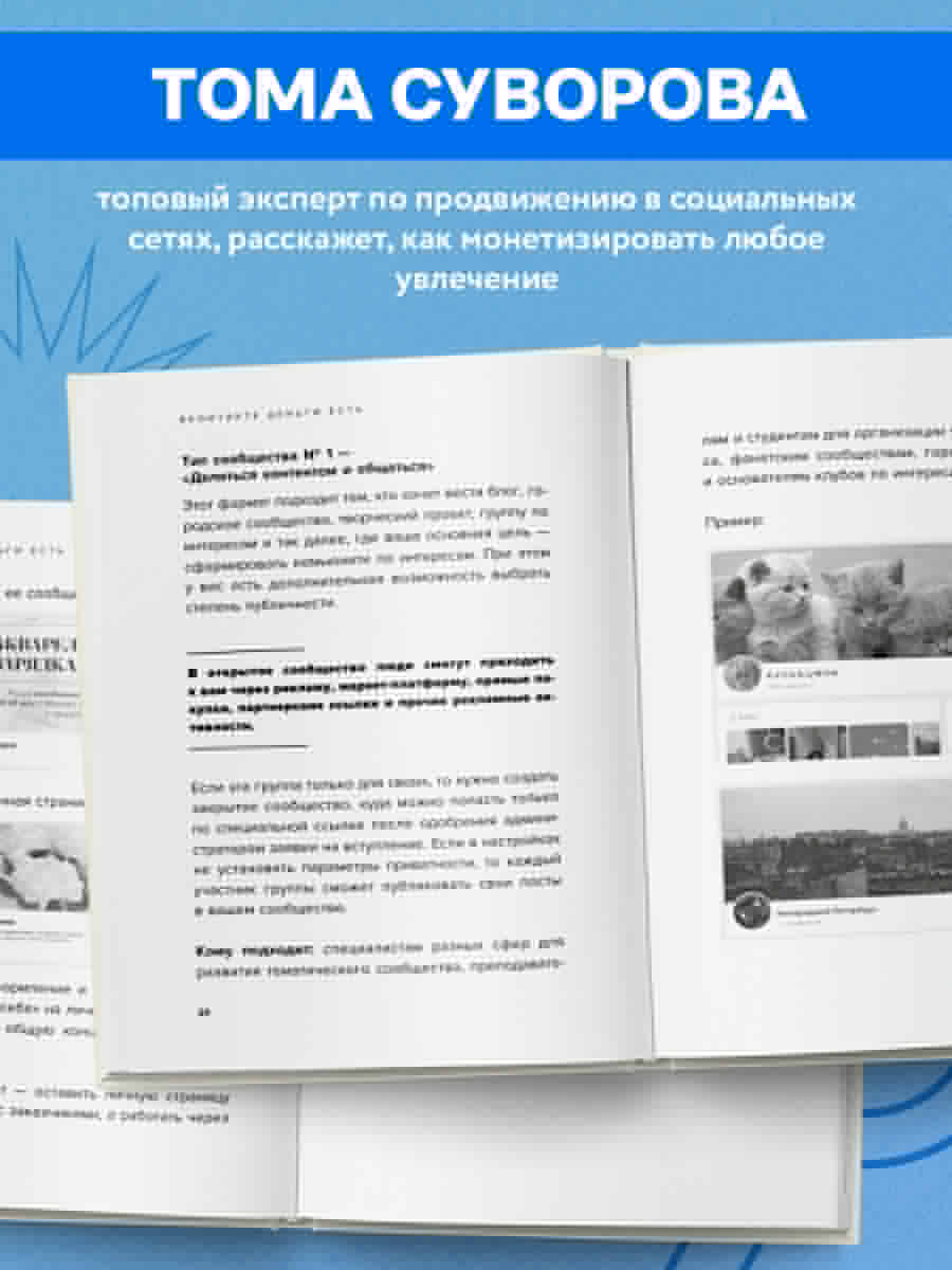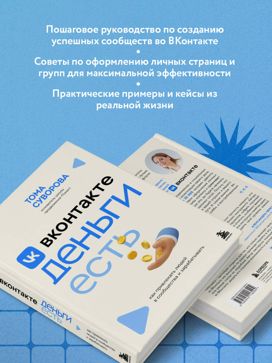 ОБ АВТОРЕ: ТОМА СУВОРОВА - топовый эксперт по продвижению в социальных сетях. · Основатель онлайн-школы продвижения «Томат». · Школа «Томат» на первом месте по SMM и маркетингу ВКонтакте среди сообществ с донами. · Школа «Томат» вошла в тройку лучших онлайн-школ российского рынка на крупнейшей платформе GetCourse в нише «Заработок и бизнес». · 4000+ человек перевела из Инстаграм во ВКонтакте. · 30 000 человек прошли платное обучение. · Выпустила более 30 курсов и обучающих программ. · Суммарное количество подписчиков в соцсетях 200 000+. Не важно, чем вы занимаетесь в свободное время - печете кексы, пишете книги или сочиняете песни. Любое ваше хобби может приносить стабильный доход, если вы будете рассказывать о нем во «ВКонтакте» В этой книге Тома Суворова - эксперт по продвижению в социальных сетях - предлагает пошаговое руководство по монетизации своего дела. Она выпустила 30+ курсов и помогла более 30 000 человек удвоить доход в десятки раз. Автор делится принципами оформления личных страниц и сообществ, разбирает эффективные типы контента и сравнивает различные инструменты продвижения. Изучив все это, вы будете начинать свое доброе утро не с кофе, а с проверки социальных сетей. Потому что там вас будут ждать друзья и клиенты. Новости вашей отрасли и вашего бизнеса. Новые заказы на ваши продукты и услуги. И, самое важное - вы ощутите, что занимаетесь не просто любимым хобби, а востребованным и прибыльным делом. ЦИТАТЫ: Публичная страница, в отличие от группы, обладает более широким функционалом: здесь можно загрузить товары на витрину, подключить услуги и даже добавить возможность оплаты внутри социальной сети. Человеку всегда психологически проще общаться с человеком, а не с витриной магазина. Донаты - это не одинокая кнопка «Поддержать автора» с указанием стоимости подписки! Вы должны привлечь внимание подписчиков, заинтересовать их. Эксперт - это не всегда преподаватель. Вы можете быть кондитером, бухгалтером, мастером натяжных потолков и вообще кем угодно. Главное, что вы - специалист в своем деле. Эмоциональных покупок стало меньше. Именно УТП поможет вам выделиться и стать причиной подписки на ваше сообщество. ОТЗЫВЫ: «Книга Томы Суворовой - точно является тем, что стоит прочесть каждому, кто начинает осваивать соцсеть ВКонтакте в качестве бизнес-инструмента. Автору удалось подробно разбирать все нюансы работы инструментов, собрать огромный опыт и поделиться классными идеями. Также хочется отметить особенно важное на мой взгляд преимущество: книга легко читается и все инструкции понятны даже самым непосвященным читателям. Читайте, повышайте свой уровень знаний и получайте удовольствие». - Александра Черкас, Евангелист ВКонтакте для бизнеса «Эта книга - настоящее открытие для тех, кто только начинает своё продвижение во ВКонтакте или вынужден по разным причинам перейти в эту социальную сеть, хотя раньше считал её неудобной. Автор мастерски показывает, как влюбиться во ВКонтакте, увидеть его огромные возможности и достоинства». - Майя Богданова, автор книг «Новый нейрокопирайтинг», «Школа контента» и «Я копирайтер»