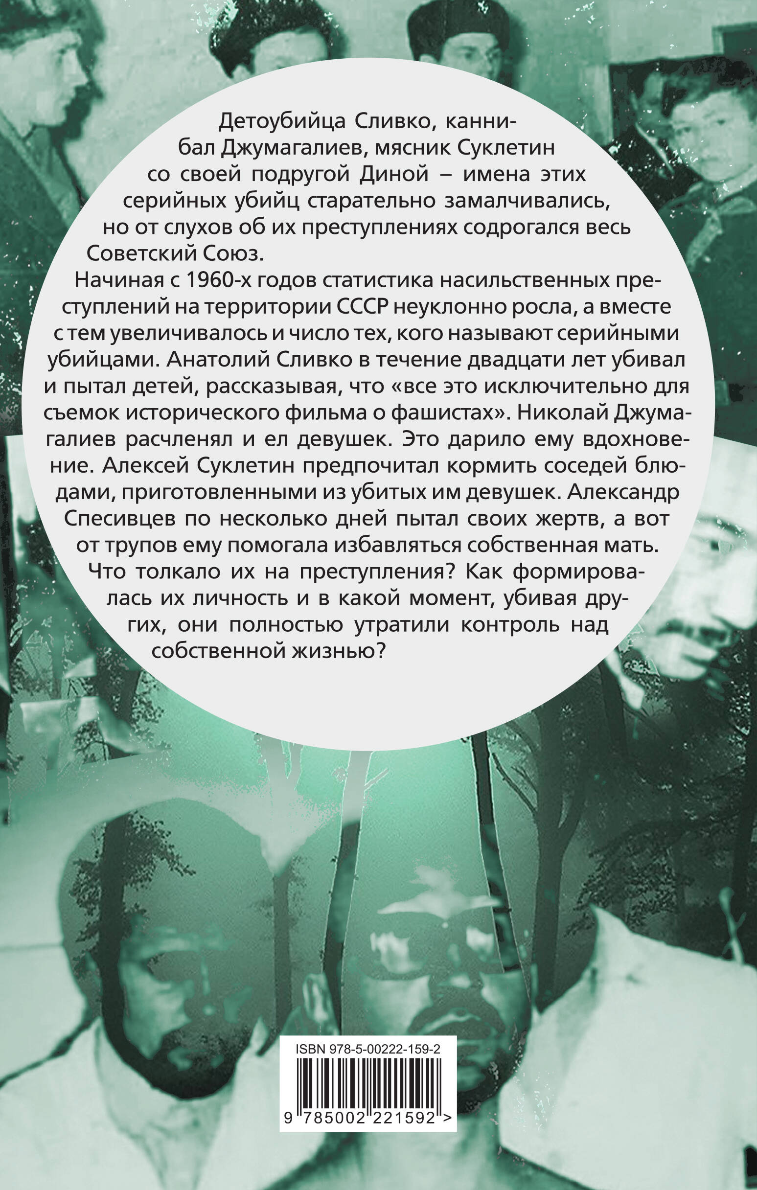 Детоубийца Сливко, каннибал Джумагалиев, мясник Суклетин со своей подругой Диной - имена этих серийных убийц старательно замалчивались, но от слухов об их преступлениях содрогался весь Советский Союз. Начиная с 1960-х годов статистика насильственных преступлений на территории СССР неуклонно росла, а вместе с тем увеличивалось и число тех, кого называют серийными убийцами. Анатолий Сливко в течение двадцати лет убивал и пытал детей, рассказывая, что «все это исключительно для съемок исторического фильма о фашистах». Николай Джумагалиев расчленял и ел девушек. Это дарило ему вдохновение. Алексей Суклетин предпочитал кормить соседей блюдами, приготовленными из убитых им девушек. Александр Спесивцев по несколько дней пытал своих жертв, а вот от трупов ему помогала избавляться собственная мать. Что толкало их на преступления? Как формировалась их личность и в какой момент, убивая других, они полностью утратили контроль над собственной жизнью?| Издательство | Родина Издательство ООО |