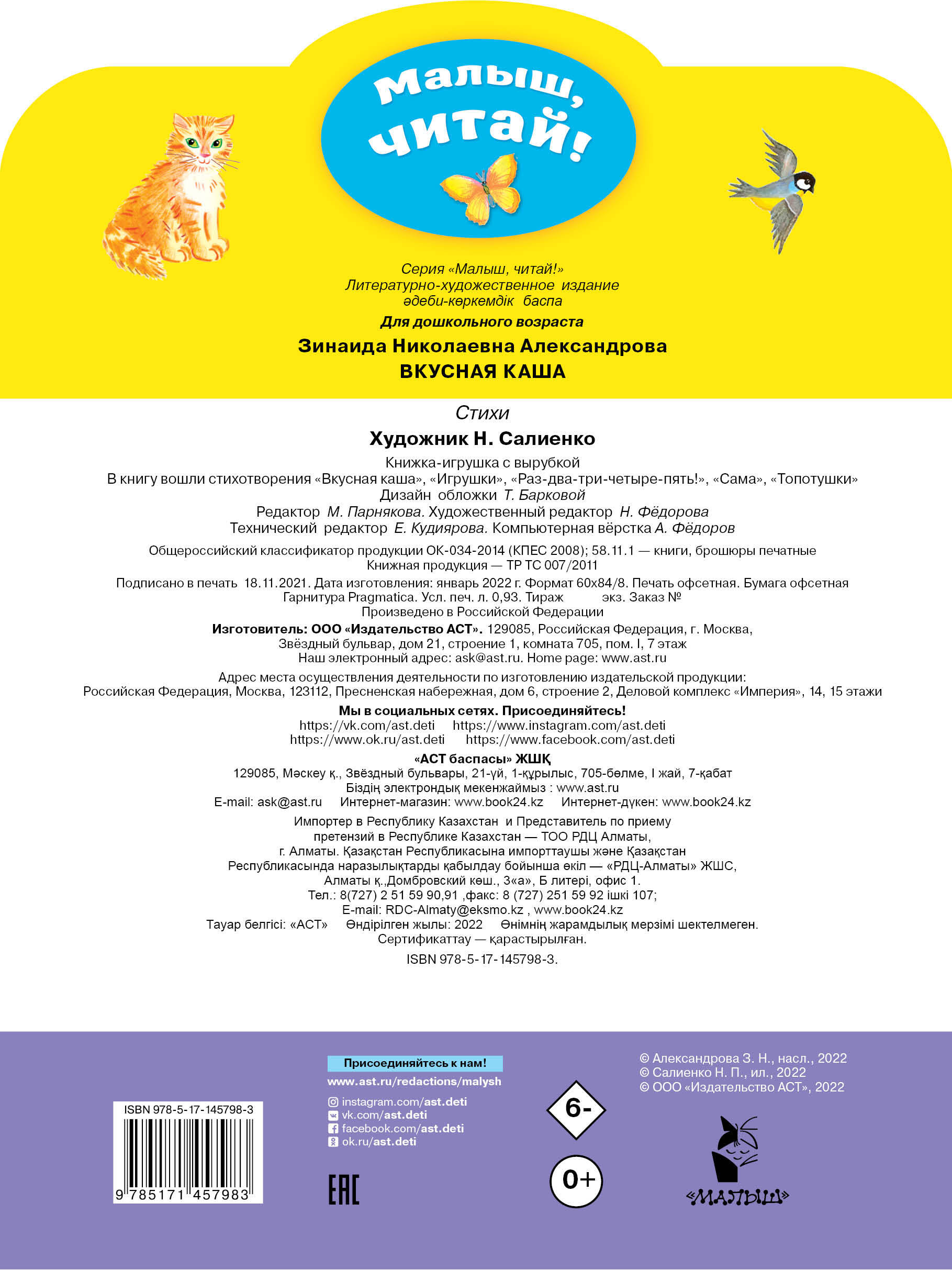 В эту чудесную книжку вошли самые прекрасные и детские стихотворения З. Александровой про вкусную кашу, игрушки, первые шажочки и про то, как малыши взрослеют и учатся новому! Великолепные, красочные, большие иллюстрации Н. Салиенко очень интересно рассматривать и повторять действия за героями стихов. Для дошкольного возраста.