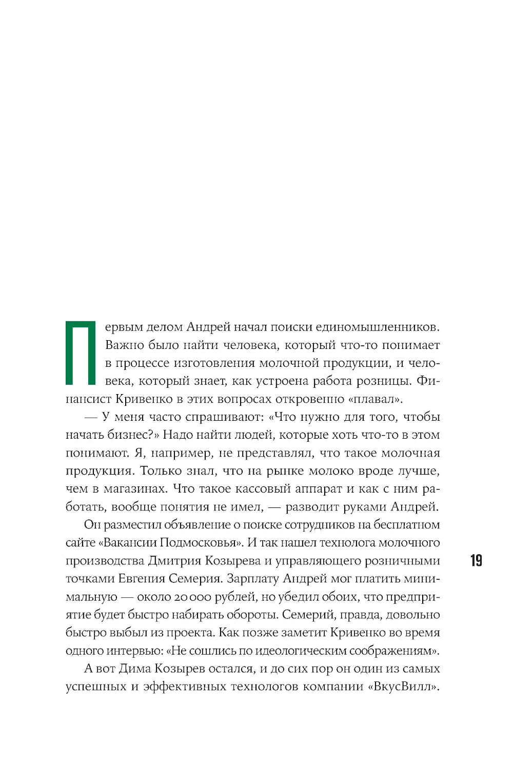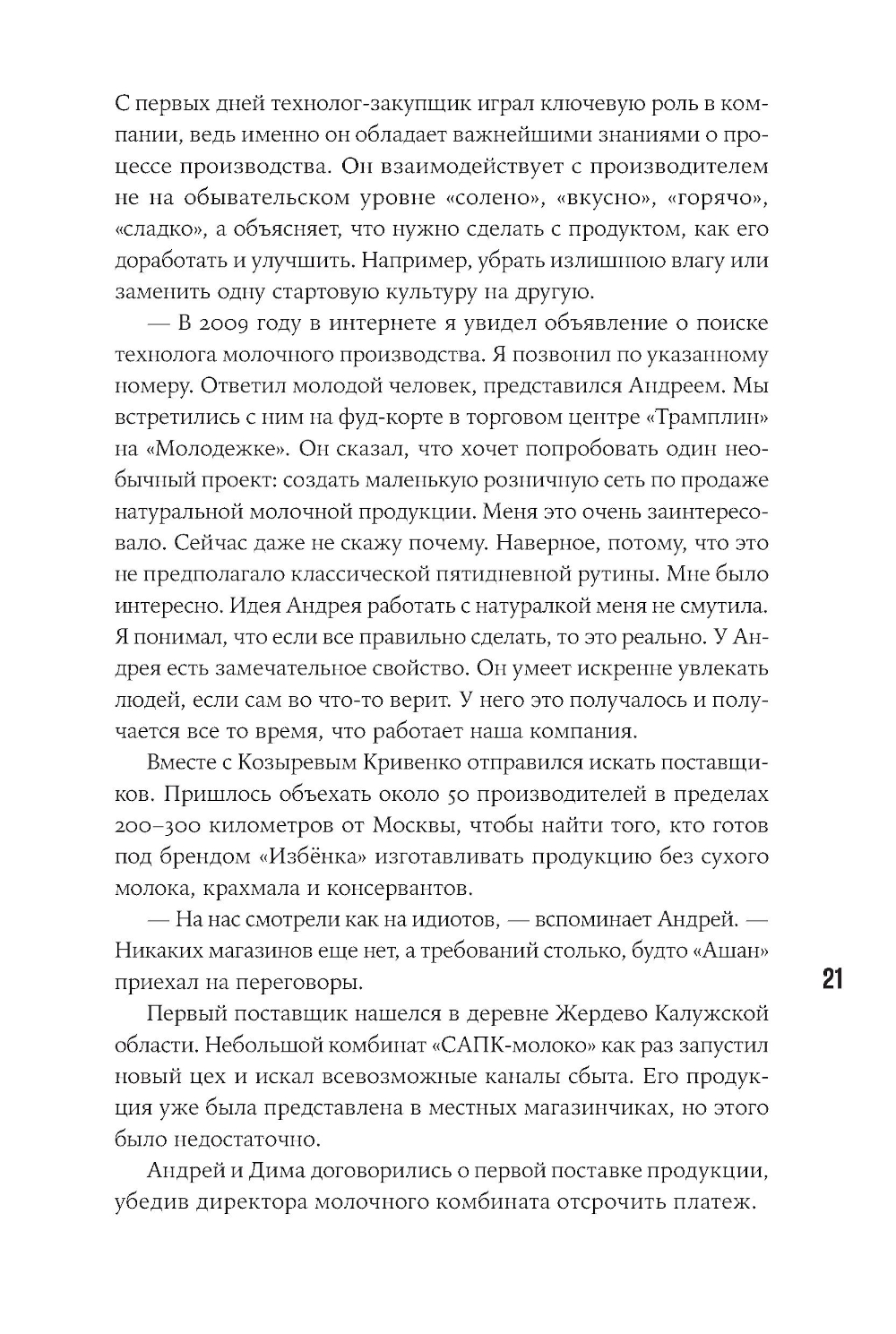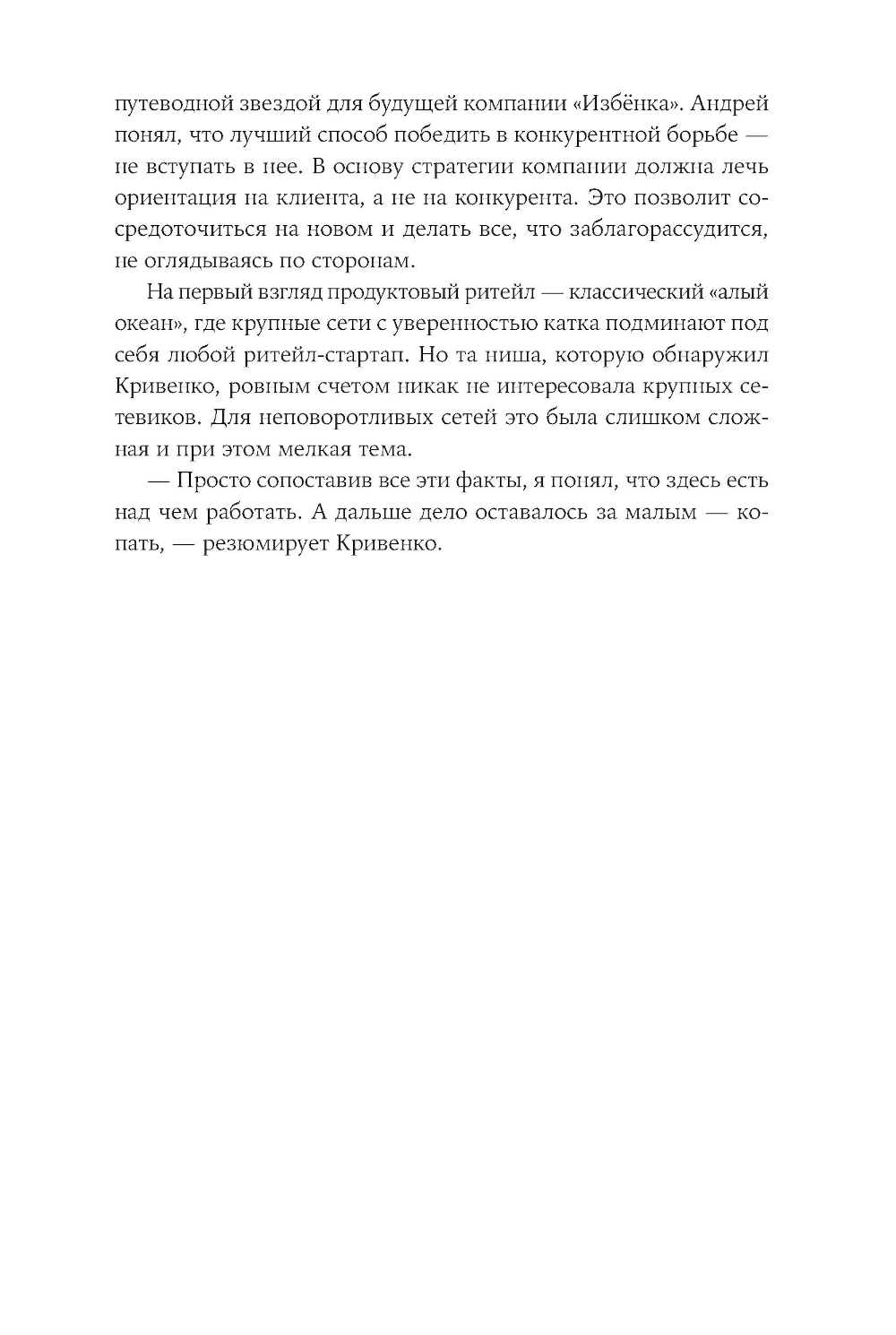 Как построить большую продуктовую сеть, начав с маленького молочного киоска и не взяв ни одного кредита? Как вынырнуть из алого океана, погрузиться в голубой и ежегодно увеличивать обороты вдвое? Как не утратить дух стартапа за 10 лет? Как управлять компанией, в которой более 5000 сотрудников, без жестких приказов и регламентов, прописанных KPI и спланированного годового бюджета? Какими должны быть управленцы в такой компании? Как вообще подбирается команда, которую не хотят покидать? Продуктовые сети «ВкусВилл» и «Избёнка» знакомы многим, их продукцию любят и рекомендуют друзьям. Компания ворвалась на рынок здорового питания и совершила революцию в розничной торговле.| Издательство | Альпина Паблишер |