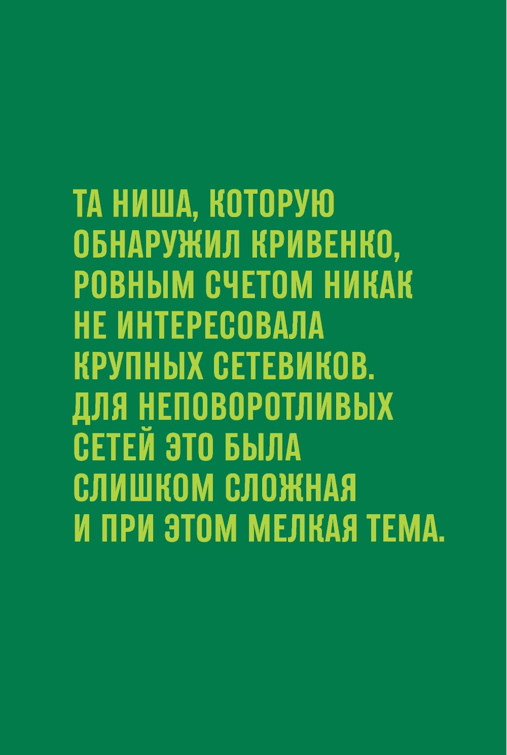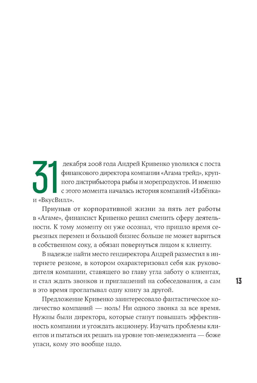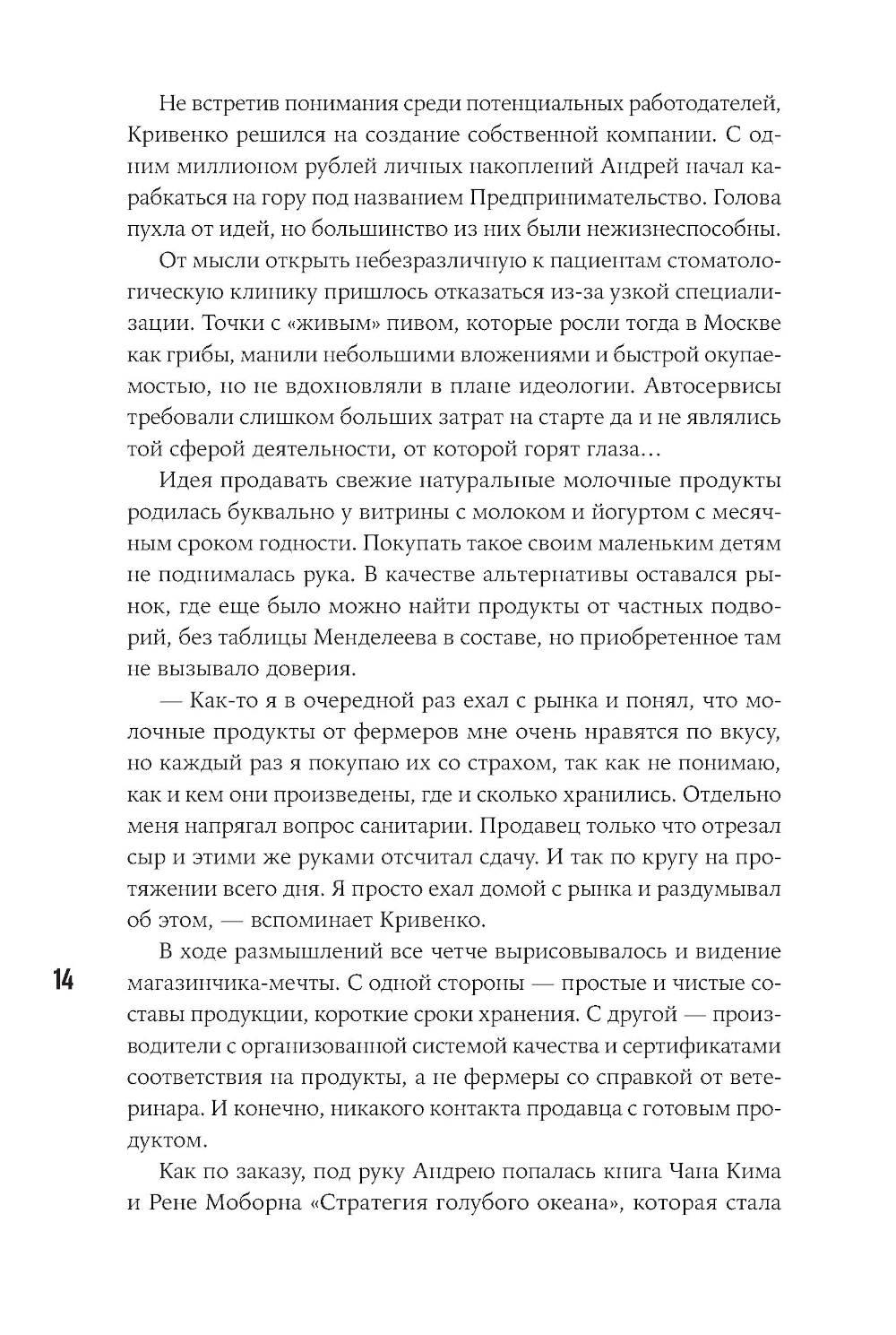 Как построить большую продуктовую сеть, начав с маленького молочного киоска и не взяв ни одного кредита? Как вынырнуть из алого океана, погрузиться в голубой и ежегодно увеличивать обороты вдвое? Как не утратить дух стартапа за 10 лет? Как управлять компанией, в которой более 5000 сотрудников, без жестких приказов и регламентов, прописанных KPI и спланированного годового бюджета? Какими должны быть управленцы в такой компании? Как вообще подбирается команда, которую не хотят покидать? Продуктовые сети «ВкусВилл» и «Избёнка» знакомы многим, их продукцию любят и рекомендуют друзьям. Компания ворвалась на рынок здорового питания и совершила революцию в розничной торговле.| Издательство | Альпина Паблишер |