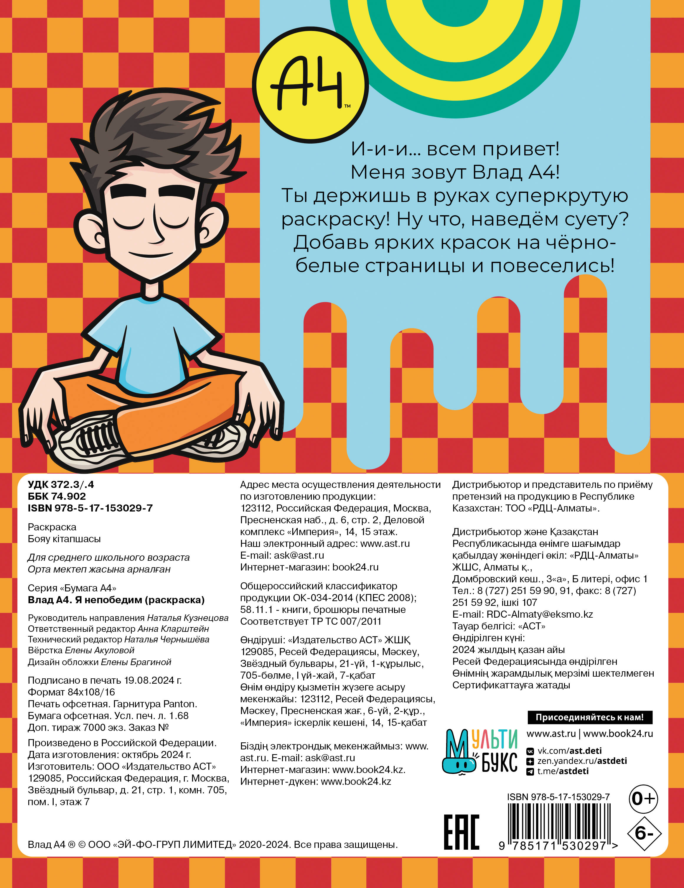 И-и-и… всем привет! Меня зовут Влад А4! Ты держишь в руках суперкрутую раскраску! Ну что, наведём суету? Добавь ярких красок на чёрно-белые страницы и повеселись!| Издательство | ИЗДАТЕЛЬСТВО "АСТ" |