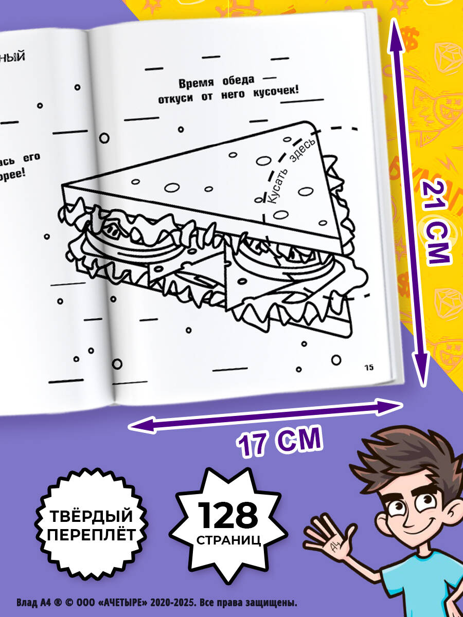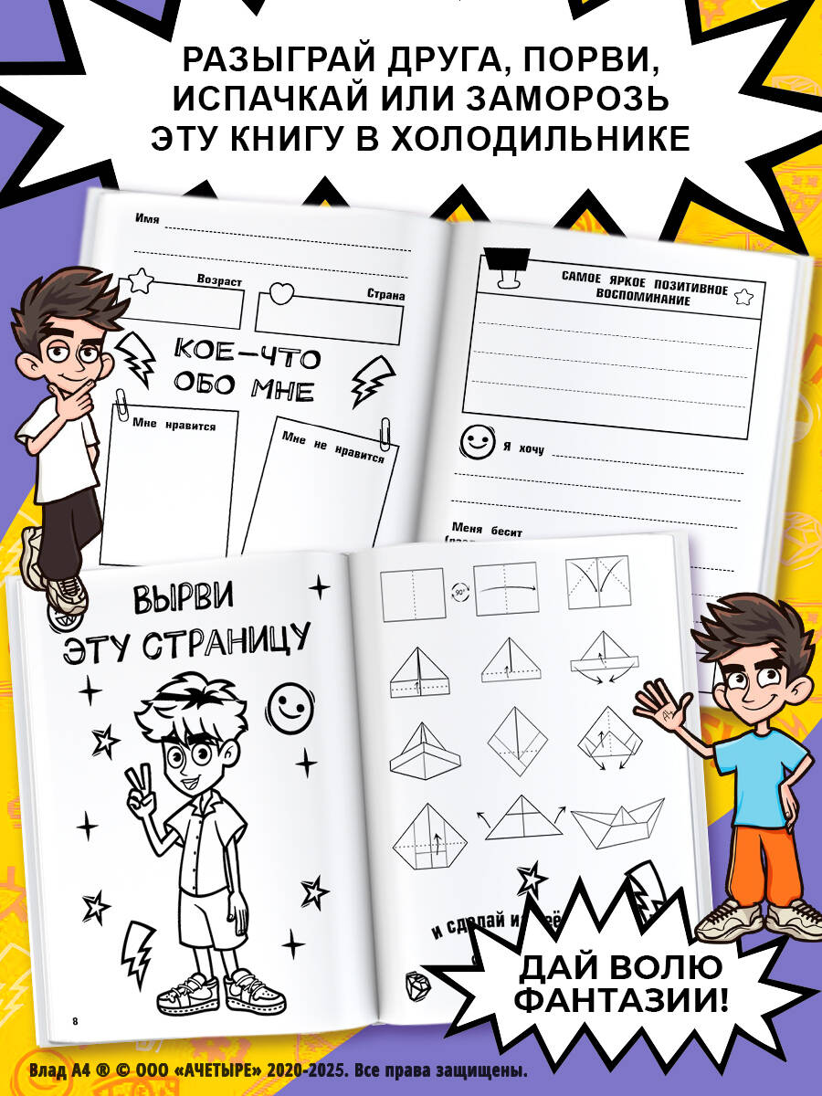И-и-и… всем привет! Это я, Влад А4! Перед тобой уникальная и суперкрутая книга! Я собрал для тебя лучшие челленджи и пранки. Эта книга - не просто сборник заданий, а целая инструкция по превращению обычного дня в незабываемое путешествие! Разыграй своего друга, порви и испачкай эту книгу, заморозь её в холодильнике - дай волю своей фантазии и получи много удовольствия!| Издательство | Издательство "АСТ" |