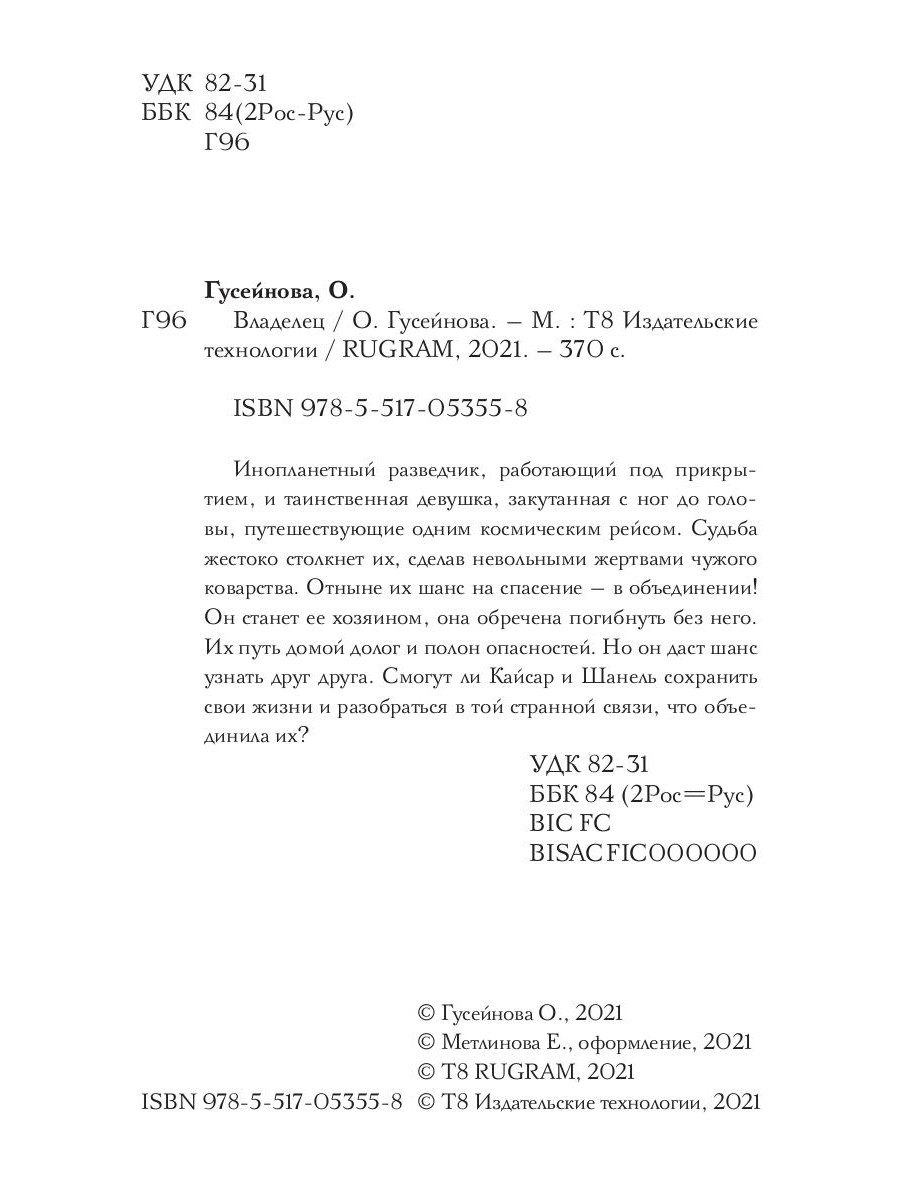 Инопланетный разведчик, работающий под прикрытием, и таинственная девушка, закутанная с ног до головы, путешествующие одним космическим рейсом. Судьба жестоко столкнет их, сделав невольными жертвами чужого коварства. Отныне их шанс на спасение - в объединении! Он станет ее хозяином, она обречена погибнуть без него. Их путь домой долог и полон опасностей. Но он даст шанс узнать друг друга. Смогут ли Кайсар и Шанель сохранить свои жизни и разобраться в той странной связи, что объединила их?| Издательство | Т8 RUGRAM |