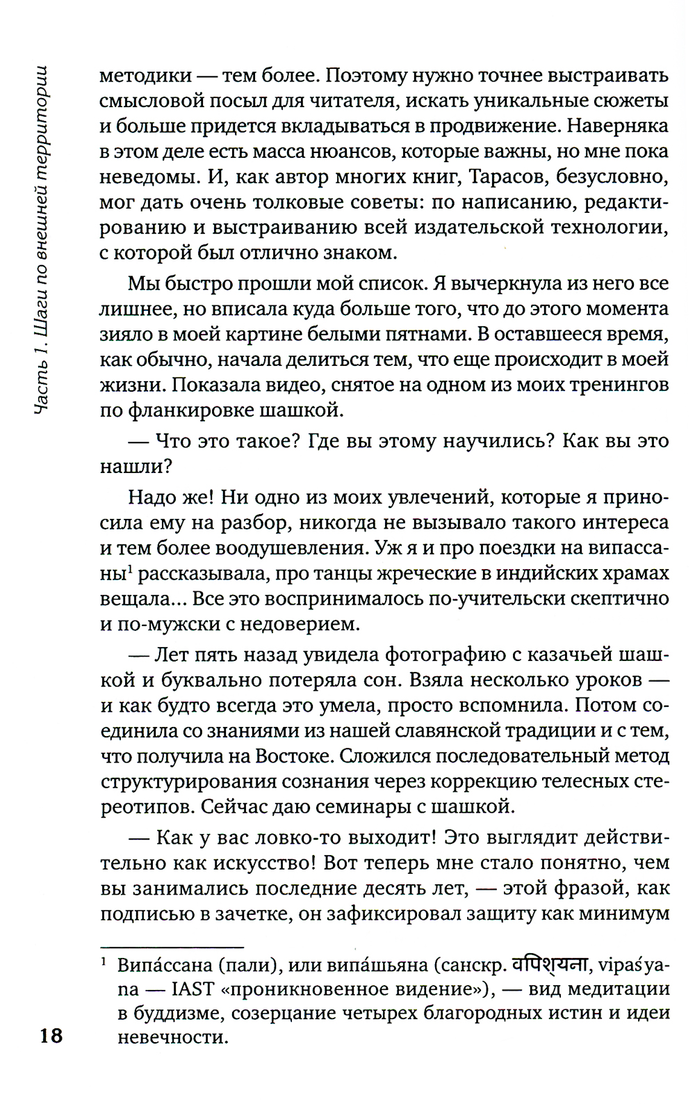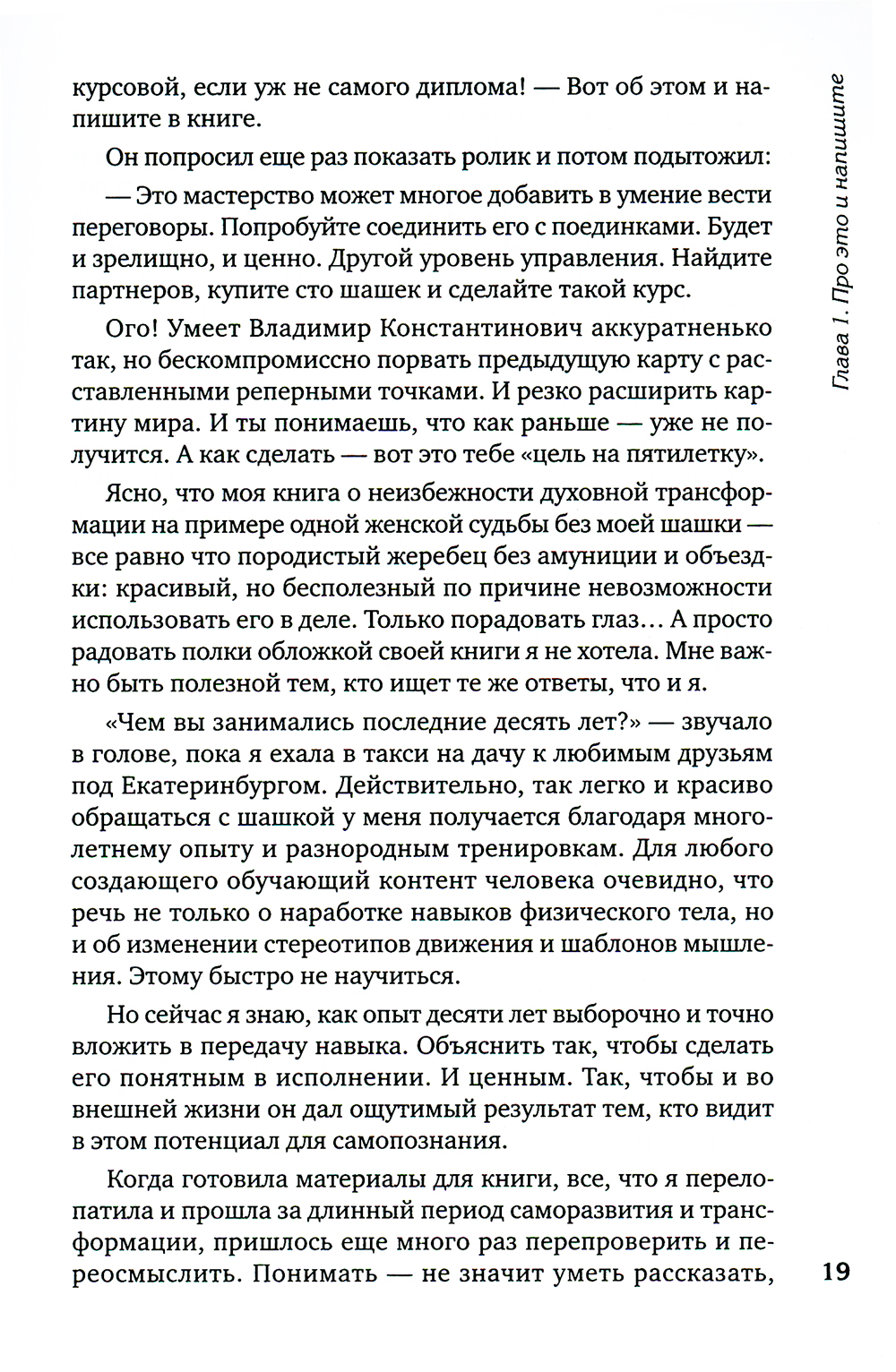 Инструментом исследования становится шашка. И если в начале истории это внутренний образ, побуждающий сражаться и отстаивать свои интересы, то в определенный момент шашка становится совсем реальным живым историческим оружием. Она показывает связь с внутренней историей человека, превращается в инструмент, исцеляющий в женщине агрессию и борьбу, а мужчине помогает пробудить лучшие качества - ответственность, достоинство и честь. На личных примерах и метафорах автор ведет читателя по пути своей трансформации и перерождения, показывает суть практик и знаний своих учителей.
