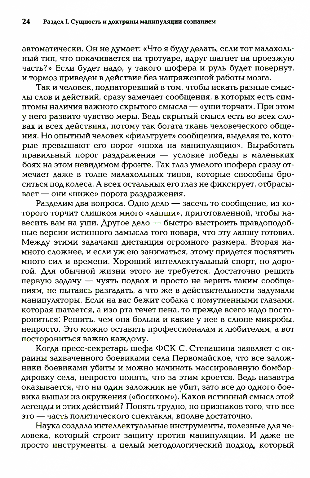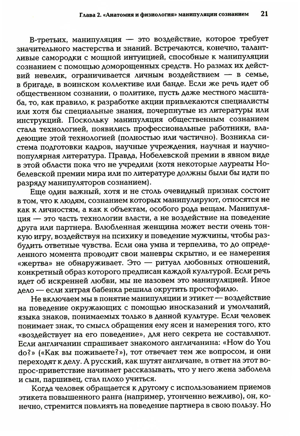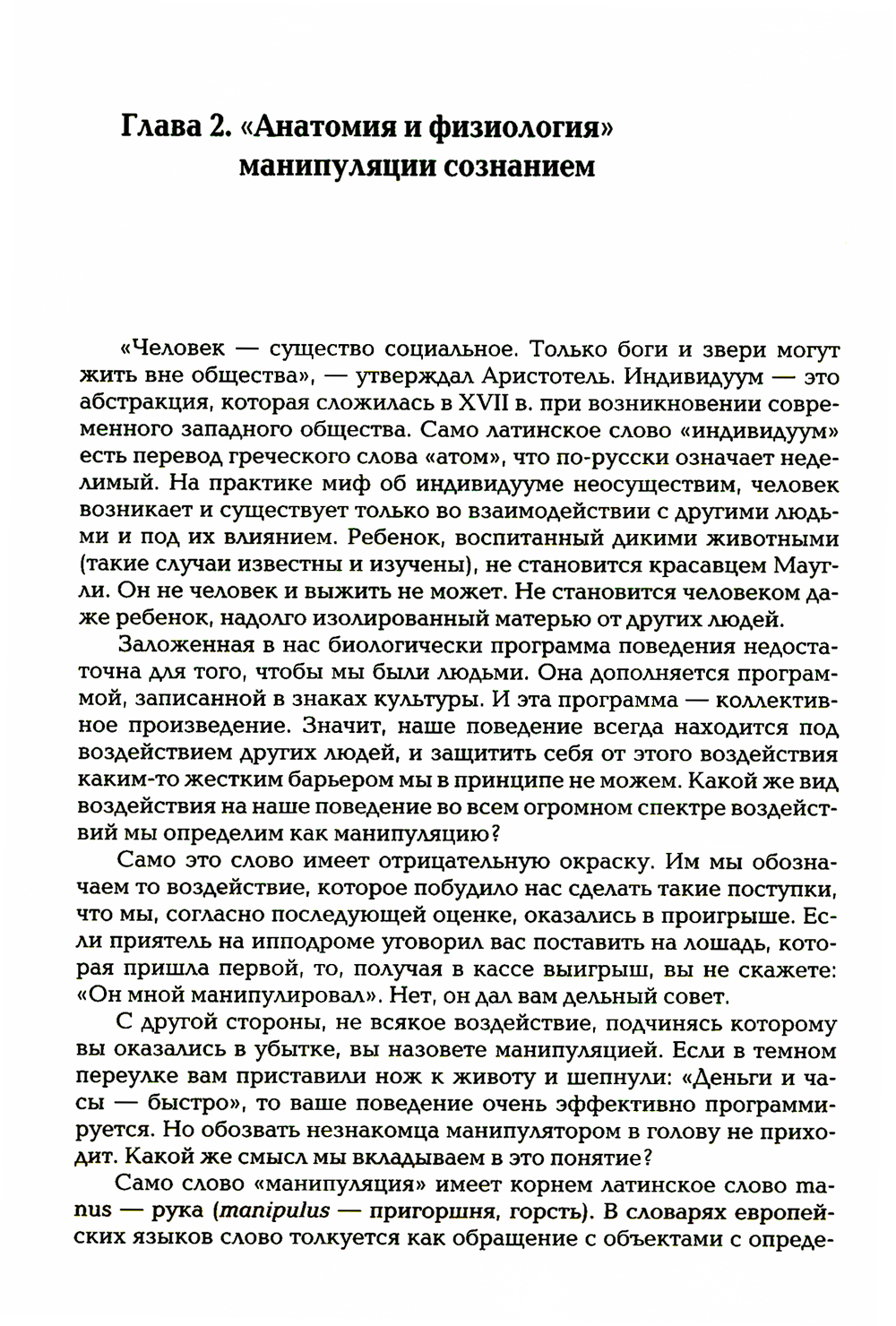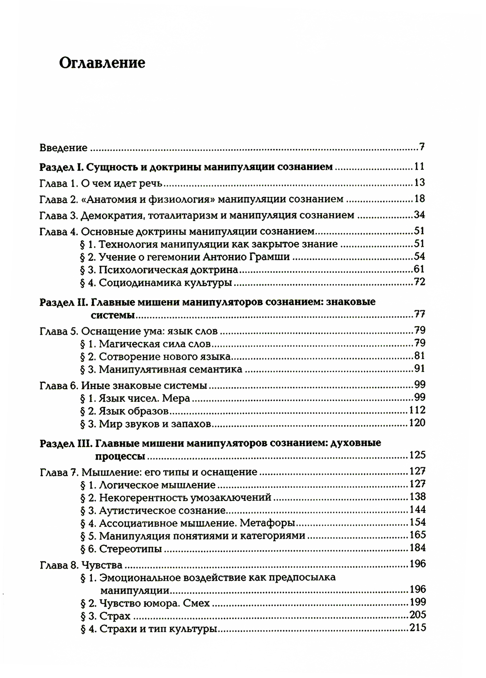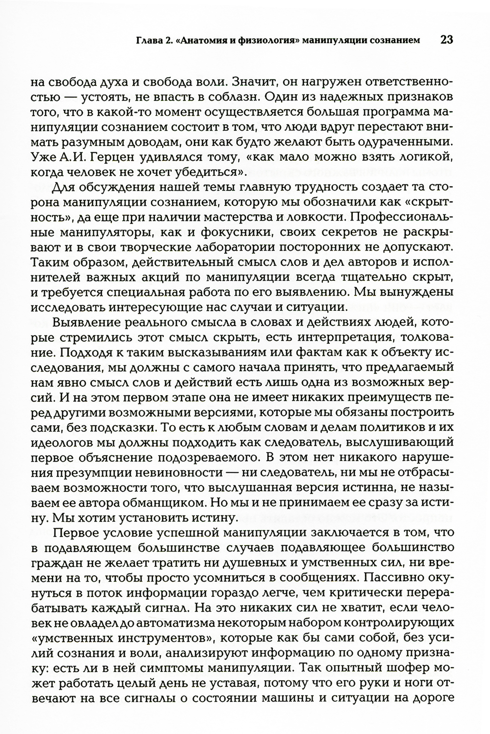 В книге всесторонне исследуются методы и формы манипуляции общественным сознанием, имеющей своей целью «зомбирование», роботизацию человека. Автор считает, что уже в настоящее время деятельность по манипуляции общественным сознанием «изменила облик мира и затронула практически каждого жителя планеты», в особенности читателя и телезрителя. Занимая позицию неприятия технологий такого рода, автор утверждает, что именно через отношение к манипуляции сознанием (законна ли она и имеет ли моральные оправдания) определится цивилизационный и культурный выбор новой России: «это не выбор президента, партии и даже политического строя. Речь идет о выборе жизнеустройства». Для психологов, политологов, социологов, а также всех, кто интересуется механизмами манипуляции общественным сознанием.| Издательство | Академический проект |