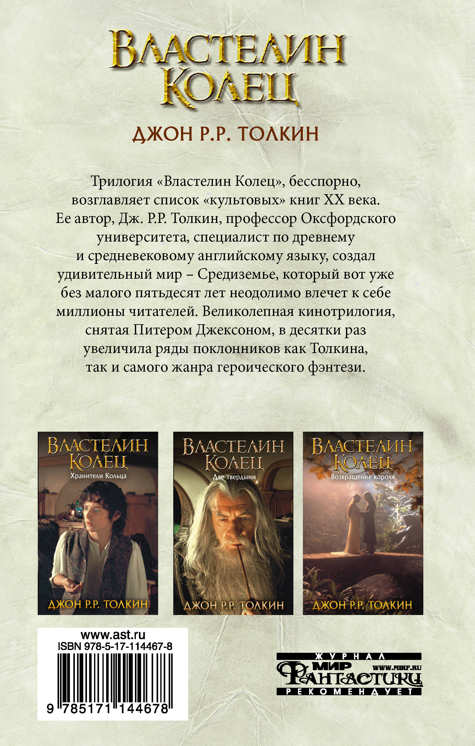 Трилогия "Властелин Колец" бесспорно, возглавляет список "культовых" книг XX века. Ее автор, Дж.P.P.Толкин, профессор Оксфордского университета, специалист по древнему и средневековому английскому языку, создал удивительный мир - Средиземье, который вот уже без малого пятьдесят лет неодолимо влечет к себе миллионы читателей. Великолепная кинотрилогия, снятая Питером Джексоном, в десятки раз увеличила ряды поклонников как Толкина, так и самого жанра героического фэнтези.