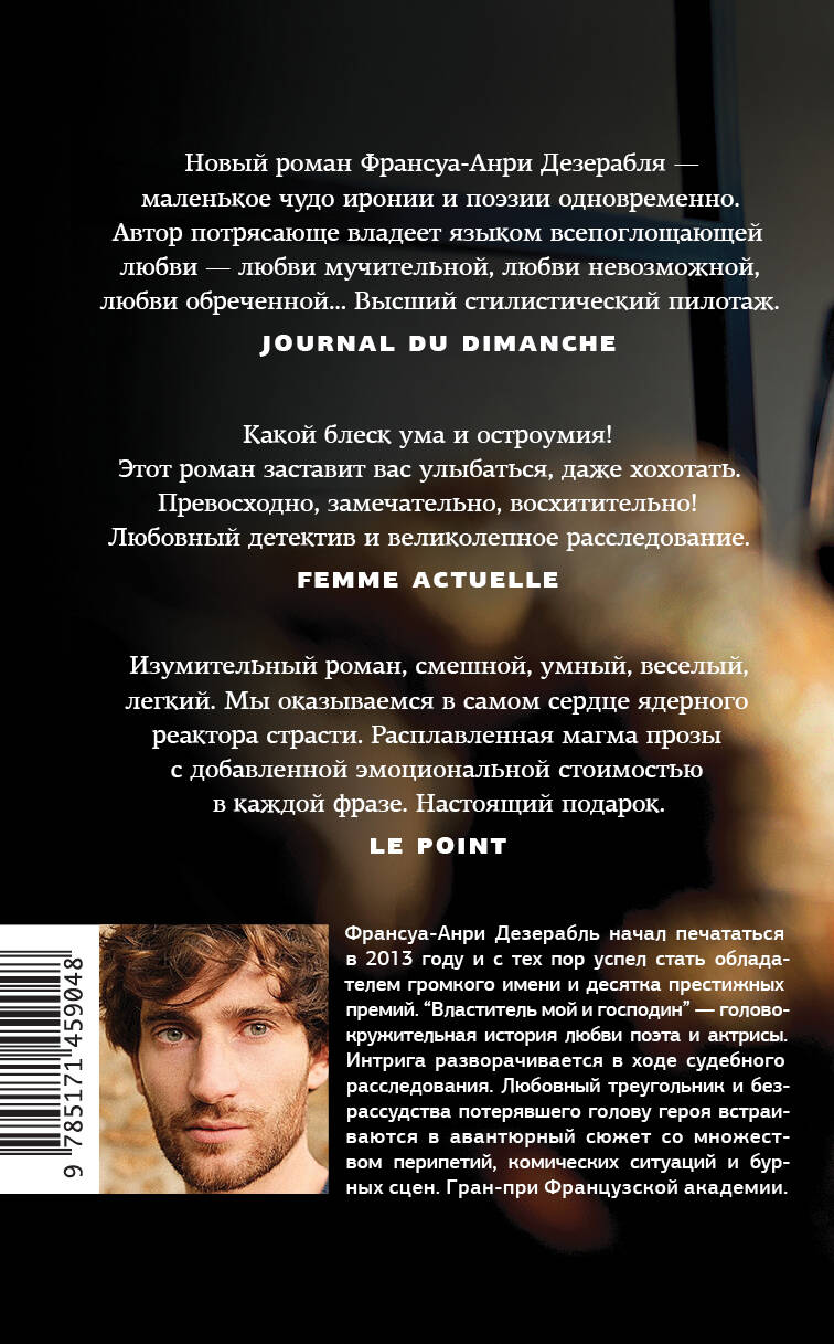 "Властитель мой и господин" - четвертая книга Франсуа-Анри Дезерабля. Автор приобрел известность после громкого успеха романа "Некий господин Пекельный", получившего несколько престижных литературных наград. На этот раз Дезерабль рассказывает историю страстной, трагичной любви. Роман начинается в оружейном магазине, где некий Васко выбирает себе оружие, чтобы ответить на угрозы жениха своей любовницы. Тина, своенравная актриса театра, живет со своим женихом Эдгаром и растит с ним детей, двух близняшек. Идиллию нарушает Васко, внезапно возникший в жизни актрисы. И Тина, и Васко - люди искусства, она - актриса, он - поэт, влюбленный в язык и осознающий его силу. Их история - это череда импульсов, безумных влечений и вынужденных расставаний. В этом романе Дезерабль легко и искренне пишет о муках любви. Автор играет с французским литературным наследием, отсылая читателя и к средневековому сюжету о Тристане и Изольде, и к Жюльену Сорелю Стендаля, и к истории Рембо и Верлена. "Властитель мой и господин" - это комедия и трагедия под одной обложкой.| Издательство | АСТ |