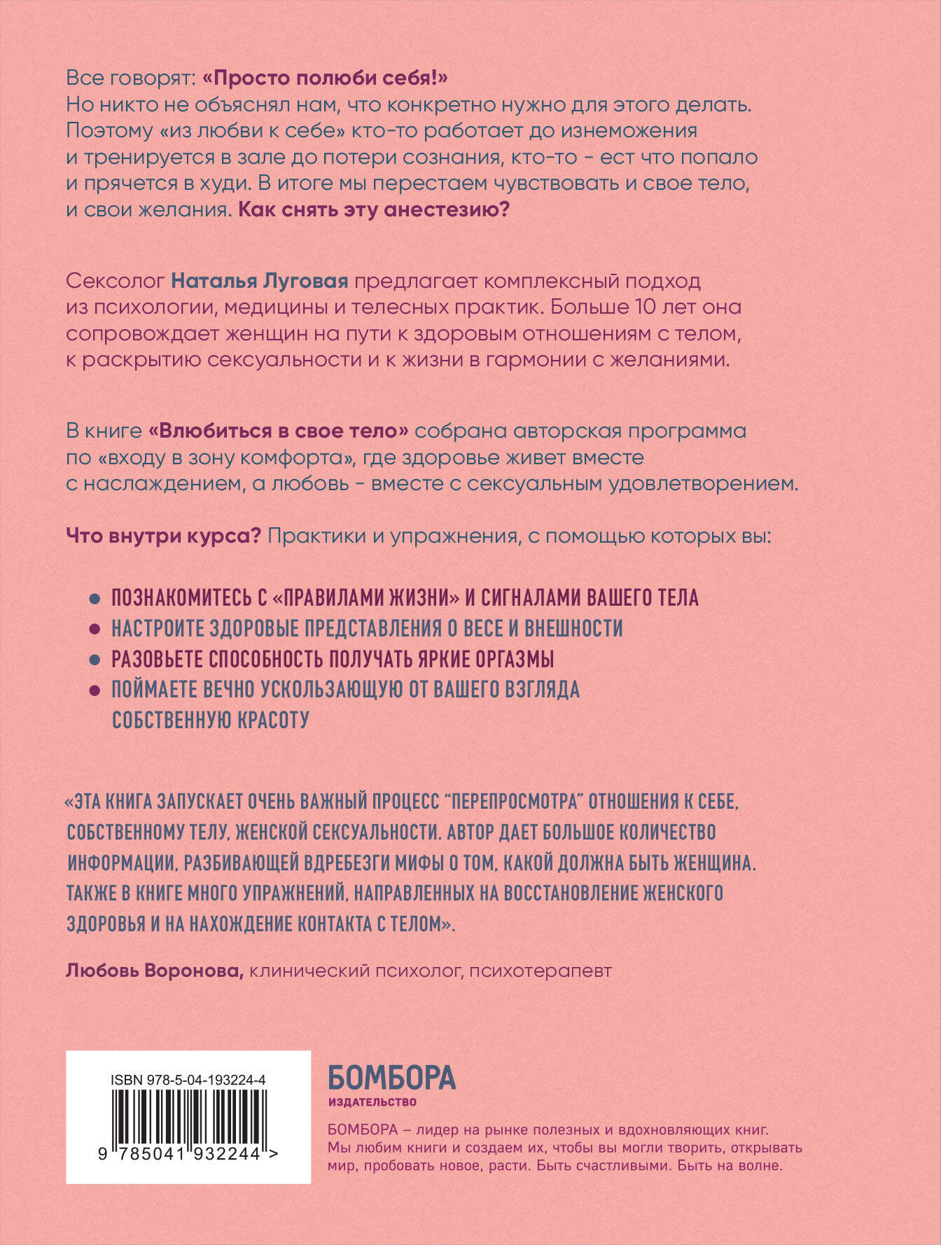 Все говорят: «Просто полюби себя!» Но никто не объяснял нам, что конкретно нужно для этого делать. Поэтому из «любви к себе» кто-то работает до изнеможения и тренируется в зале до потери сознания, кто-то - ест что попало и прячется в худи. В итоге мы перестаем чувствовать и свое тело, и свои желания. Как снять эту анестезию? Сексолог Наталья Луговая предлагает комплексный подход из психологии, медицины и телесных практик. Больше 10 лет она сопровождает женщин на пути к здоровым отношениям с телом, к раскрытию сексуальности и к жизни в гармонии с желаниями. В книге «Влюбиться в свое тело» собрана авторская программа по «входу в зону комфорта», где здоровье живет вместе с наслаждением, а любовь - вместе с сексуальным удовлетворением. Что внутри курса? Практики и упражнения, с помощью которых вы: - познакомитесь с «правилами жизни» и сигналами вашего тела; - настроите здоровые представления о весе и внешности; - разовьете способность получать яркие оргазмы; - поймаете вечно ускользающую от вашего взгляда - собственную красоту. «Эта книга запускает очень важный процесс "перепросмотра" отношения к себе, собственному телу, женской сексуальности. Автор дает большое количество информации, разбивающей вдребезги мифы о том, какой должна быть женщина. Также в книге много упражнений, направленных на восстановление женского здоровья и на нахождение контакта с телом». - Любовь Воронова, клинический психолог, психотерапевт