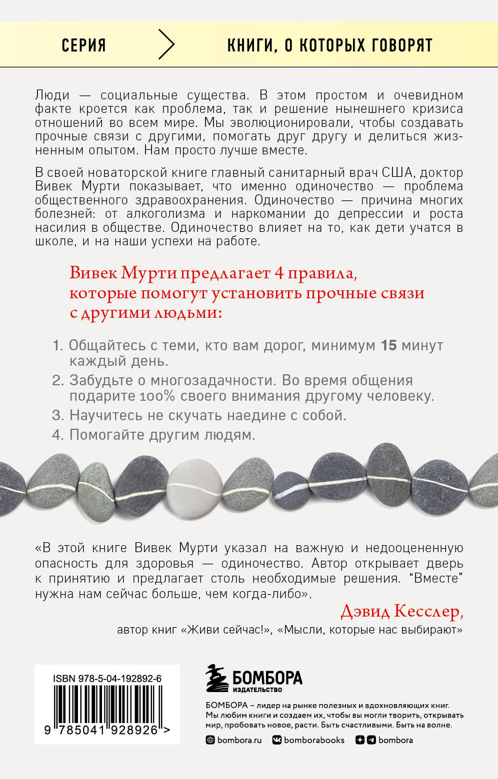 Люди - социальные существа. В этом простом и очевидном факте кроется как проблема, так и решение нынешнего кризиса отношений во всем мире. Мы эволюционировали, чтобы создавать прочные связи с другими, помогать друг другу и делиться жизненным опытом. Нам просто лучше вместе. В своей новаторской книге бывший генеральный хирург США, доктор Вивек Мурти, показывает, что именно одиночество - проблема общественного здравоохранения. Одиночество - причина многих эпидемий: от алкоголизма и наркомании до депрессии и роста насилия в обществе. Одиночество влияет на то, как дети учатся в школе, и на наши успехи на работе. Вивек Мурти предлагает 4 правила, которые помогут установить прочные связи с другими людьми: 1. Общайтесь с теми, кто вам дорог, минимум 15 минут каждый день. 2. Забудьте о многозадачности. Во время общения подарите 100% своего внимания другому человеку. 3. Научитесь не скучать наедине с собой. 4. Помогайте другим людям.| Издательство | ООО "Издательство "Эксмо" |
