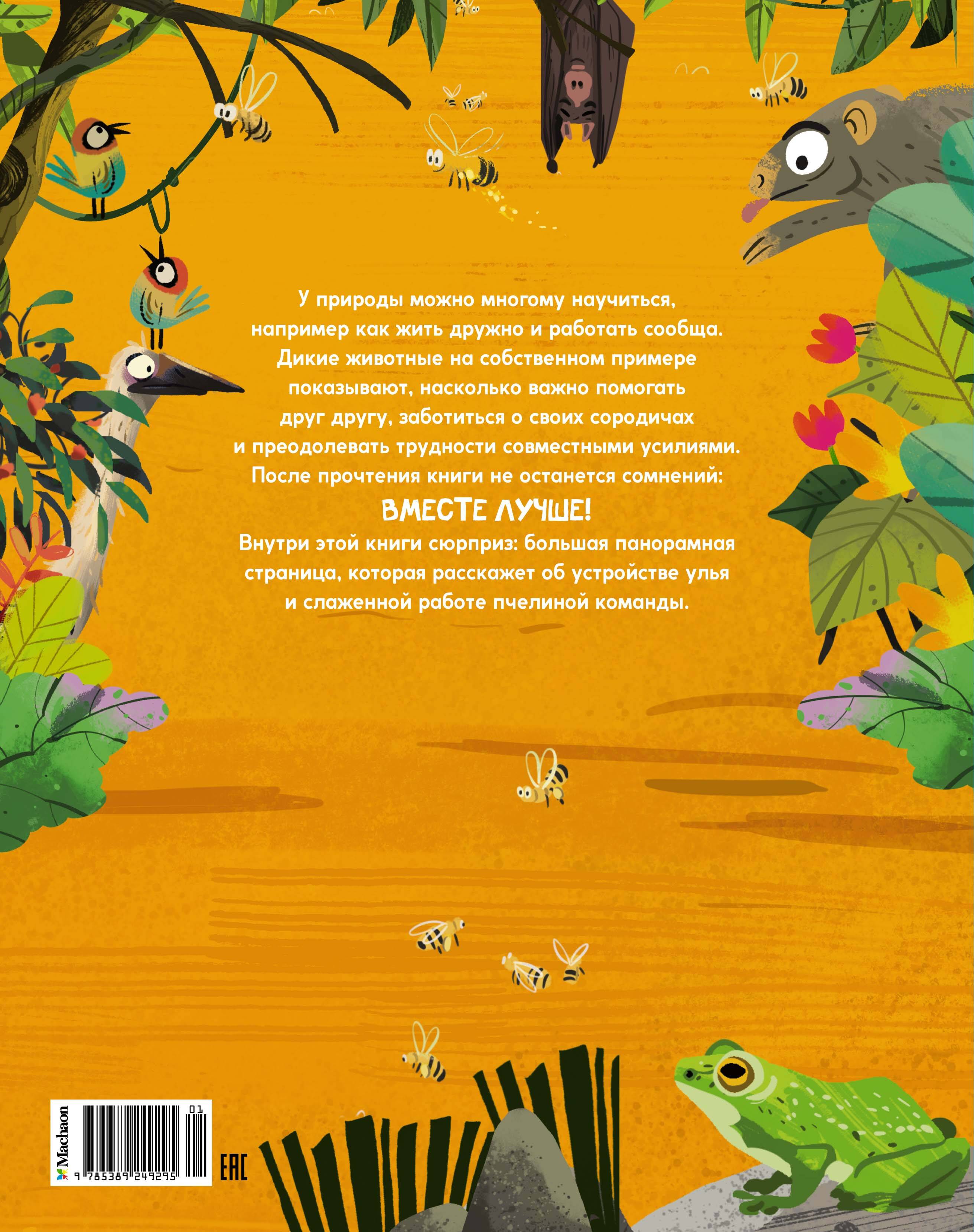У природы можно многому научиться, например как жить дружно и работать сообща. Дикие животные на собственном примере показывают, насколько важно помогать друг другу, заботиться о своих сородичах и преодолевать трудности совместными усилиями. После прочтения книги не останется сомнений: ВМЕСТЕ ЛУЧШЕ! Внутри этой книги сюрприз: большая панорамная страница, которая расскажет об устройстве улья и слаженной работе пчелиной команды.| Издательство | Азбука-Аттикус Издат.группа ООО |