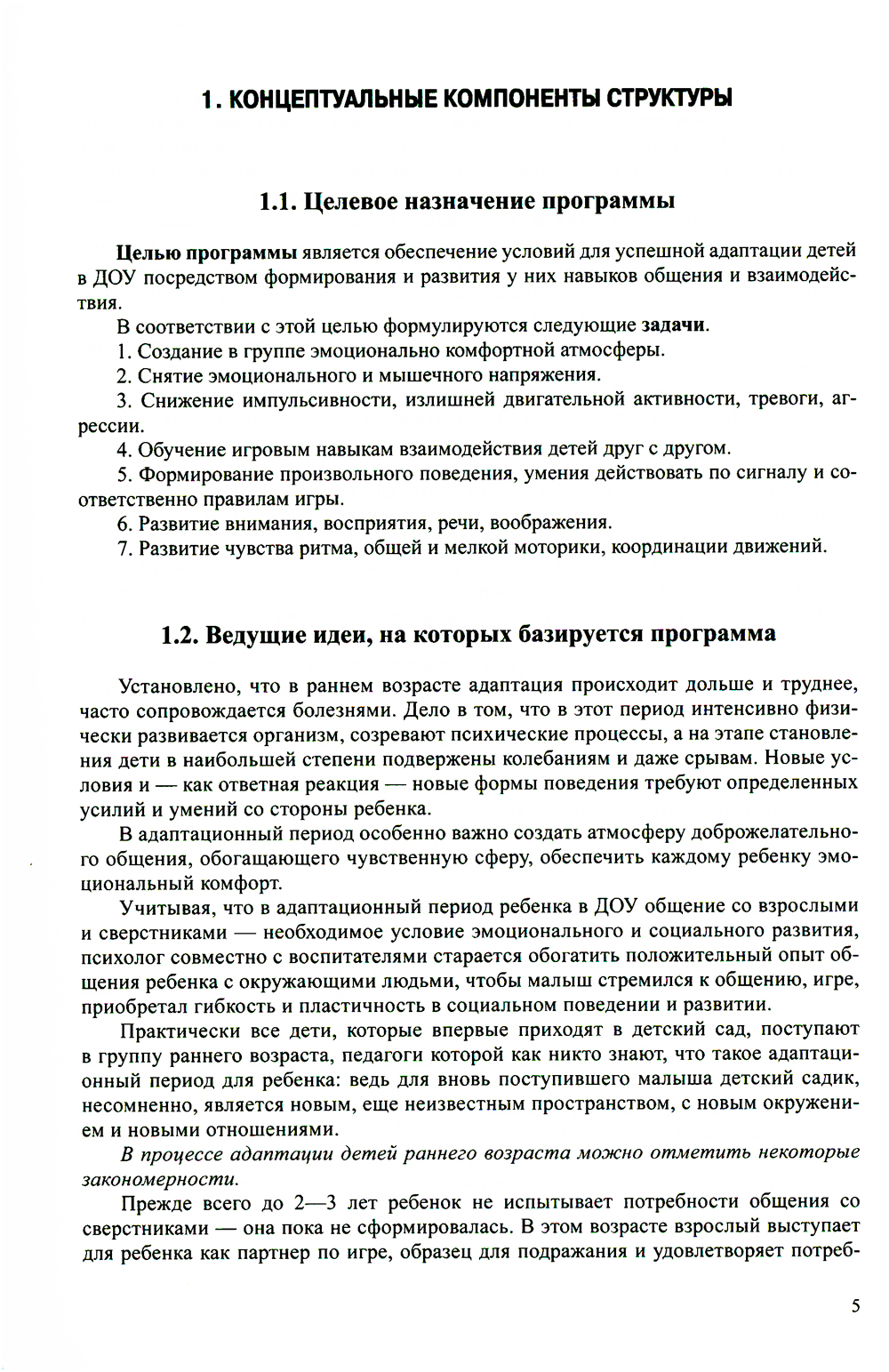 Целью программы является обеспечение условий для успешной адаптации детей в ДОУ с помощью формирования и развития у них навыков общения и взаимодействия. В ходе занятий постепенно снижаются эмоциональное и мышечное напряжение, импульсивность, у детей развиваются навыки взаимодействия друг с другом, внимание, речь, общая и мелкая моторика, игровые навыки и произвольное поведение. Занятия строятся в форме игротренинга. Дети овладевают навыками самовыражения и самообучения, а также расширяют поведенческий репертуар. Особая роль отводится включению разнообразного речевого материала для формирования навыков речевого общения с детьми и взрослыми. Издание предназначено педагогам-психологам, воспитателям, работающим в 1-й и 2-й младших группах ДОУ, родителям.| Издательство | Детство-Пресс |