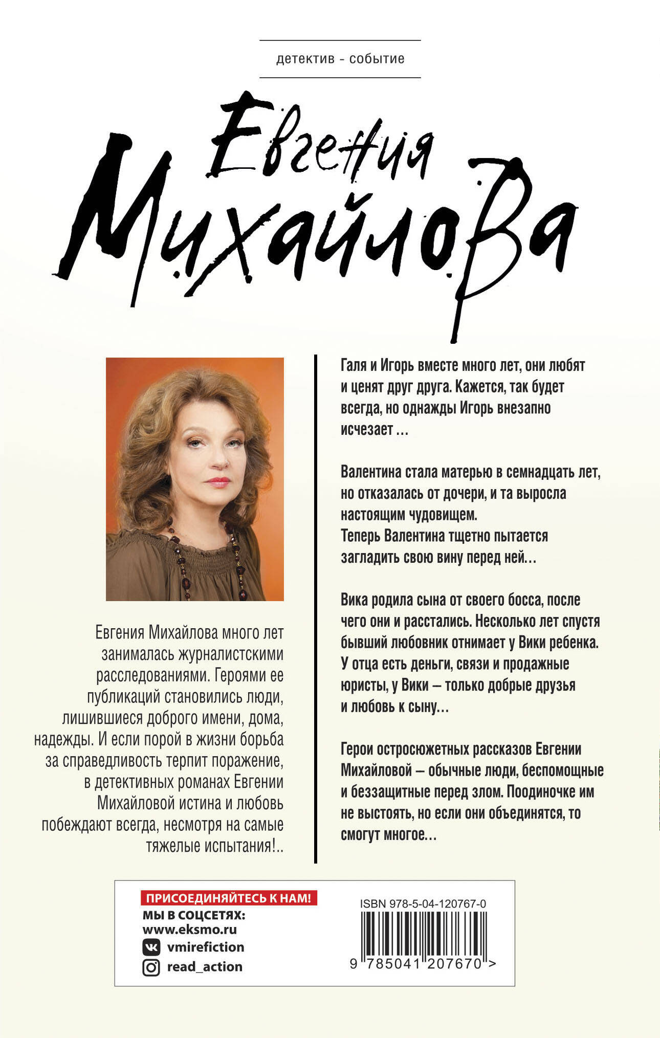 Галя и Игорь вместе много лет, они любят и ценят друг друга. Кажется, так будет всегда, но однажды Игорь внезапно исчезает… Валентина стала матерью в семнадцать лет, но отказалась от дочери, и та выросла настоящим чудовищем. Теперь Валентина тщетно пытается загладить свою виной перед ней… Вика родила сына от своего босса, после чего они и расстались. Несколько лет спустя бывший любовник отнимает у Вики ребенка. У отца есть деньги, связи и продажные юристы, у Вики - только добрые друзья и любовь к сыну… Герои остросюжетных рассказов Евгении Михайловой - обычные люди, беспомощные и беззащитные перед злом. Поодиночке им не выстоять, но если они объединятся, то смогут многое… Высокий профессионализм и блестящий литературный талант Евгении Михайловой очаруют любого читателя. Ее романы уникальны, они переворачивают душу и заставляют чаще биться сердце. Она мастер социального детектива, в ее остросюжетных романах находят отражение самые актуальные проблемы современного российского общества.| Издательство | ООО "Издательство "Эксмо" |